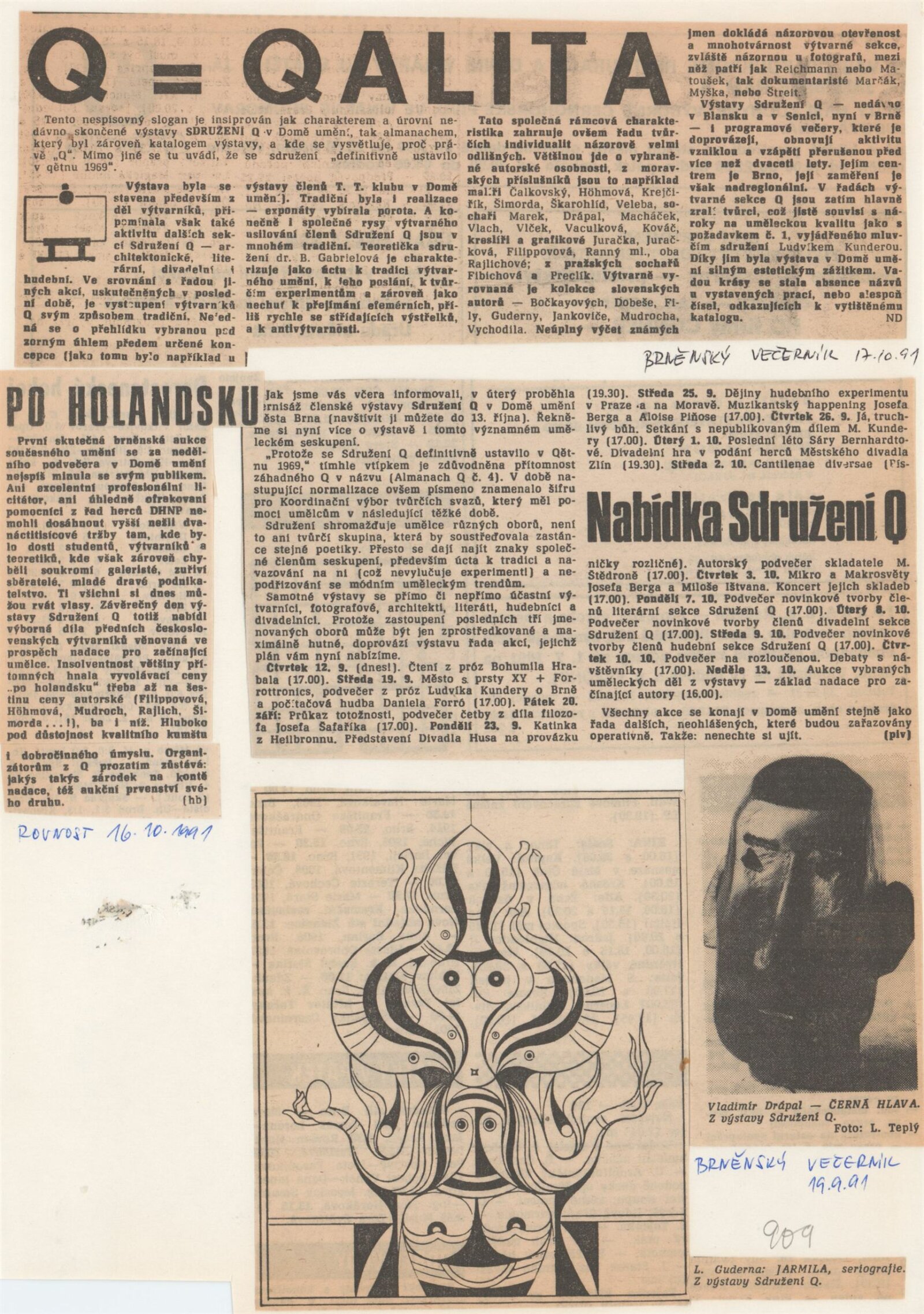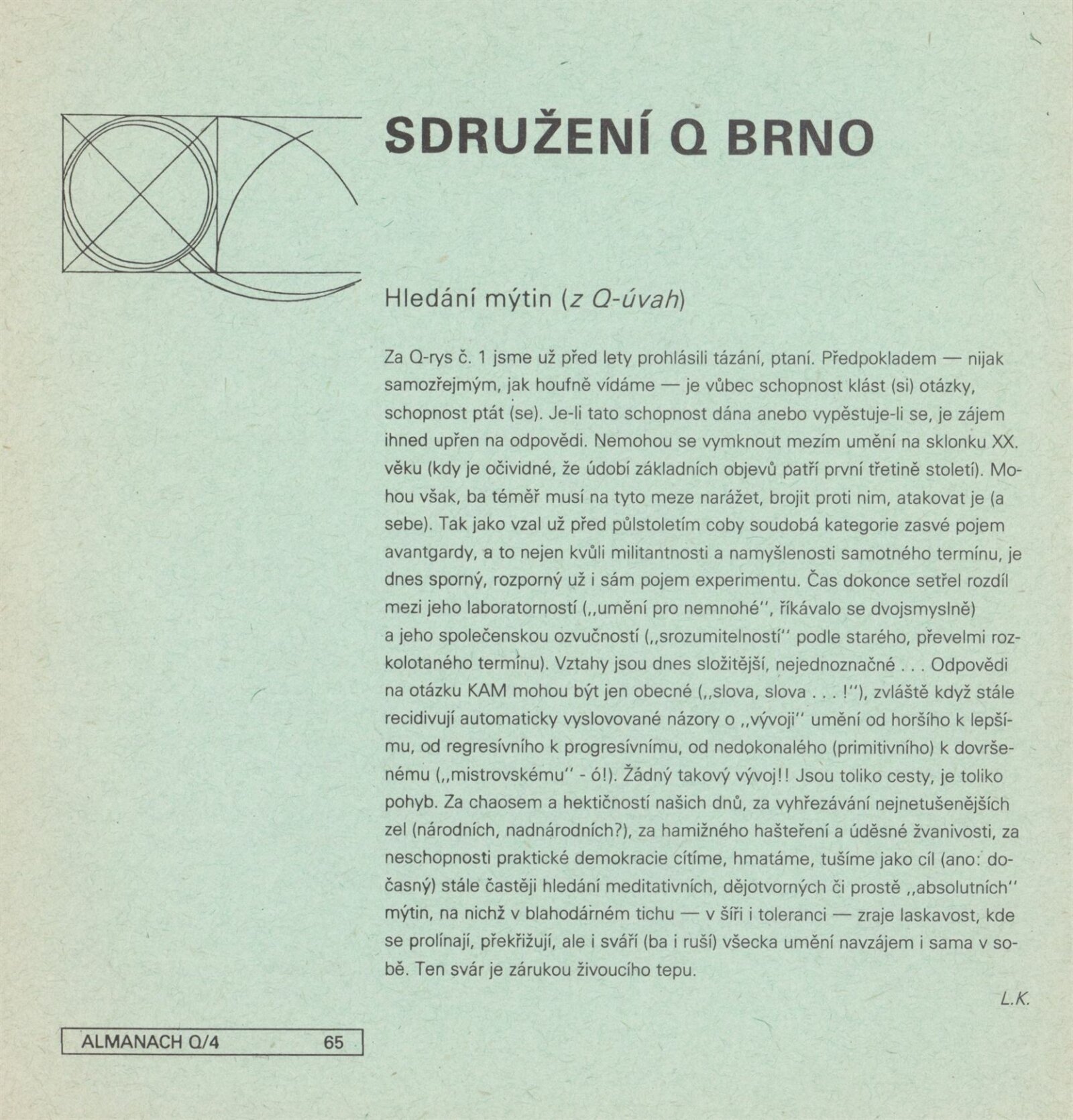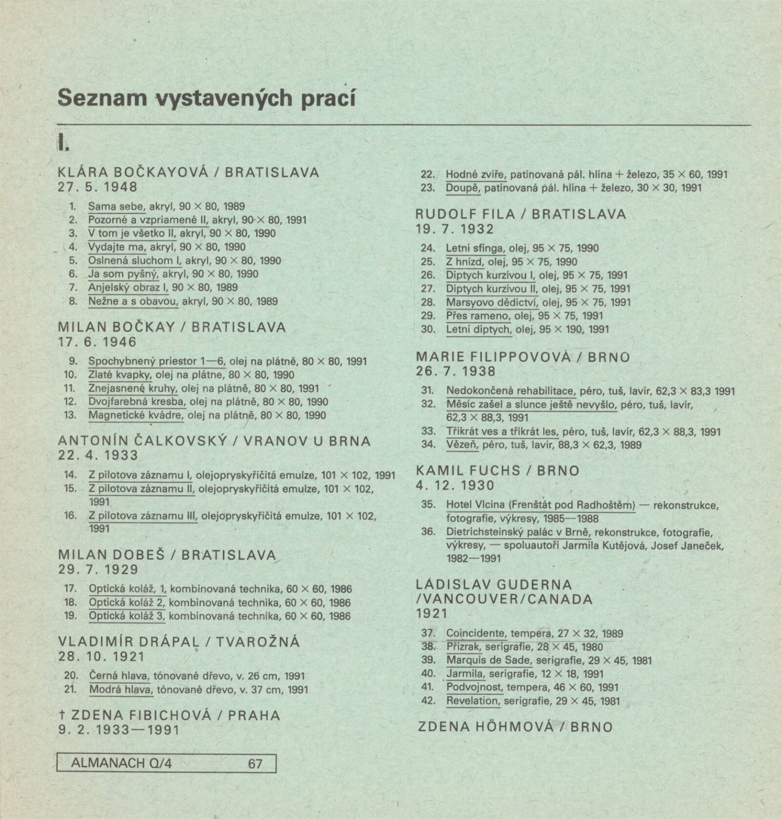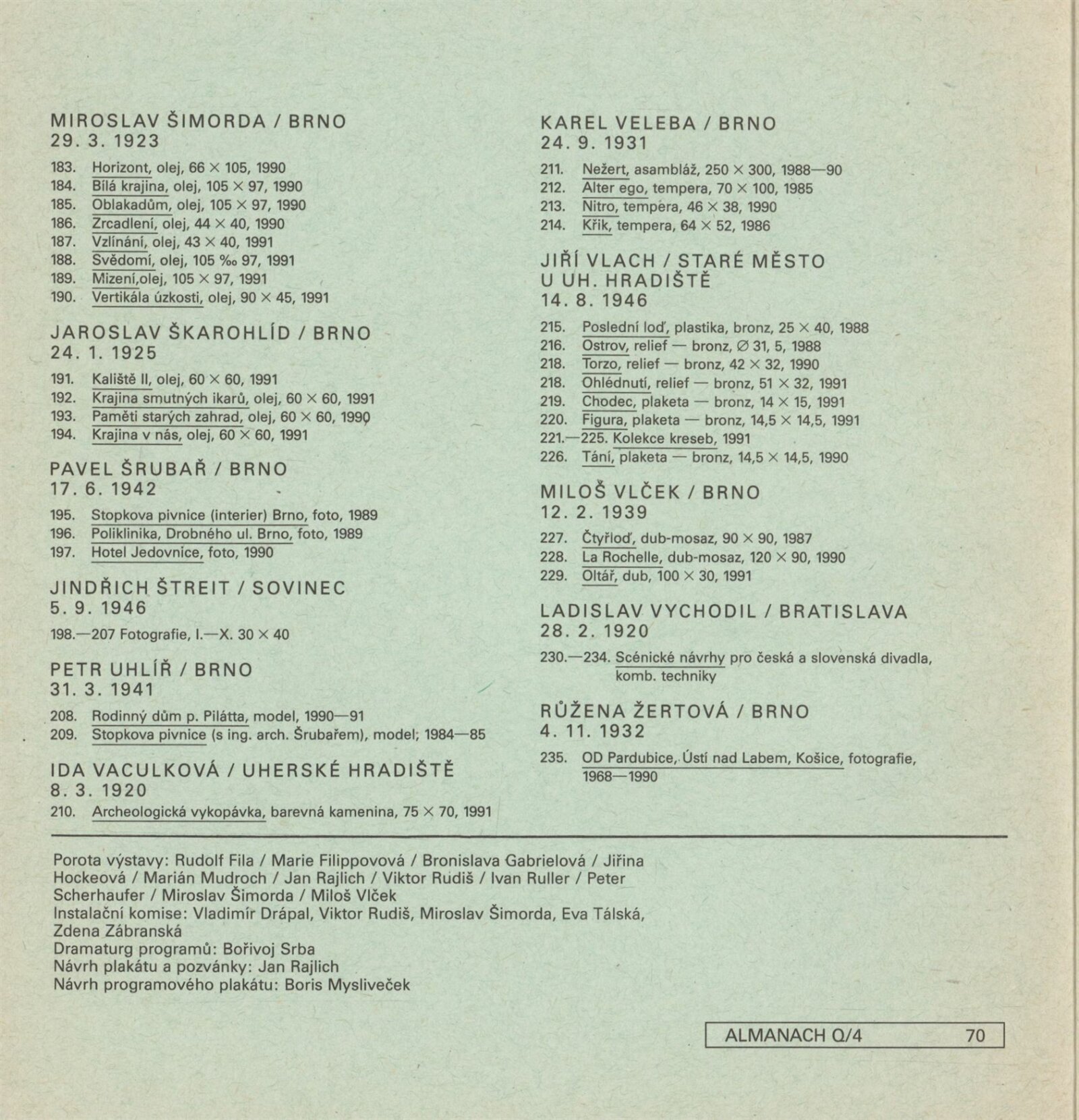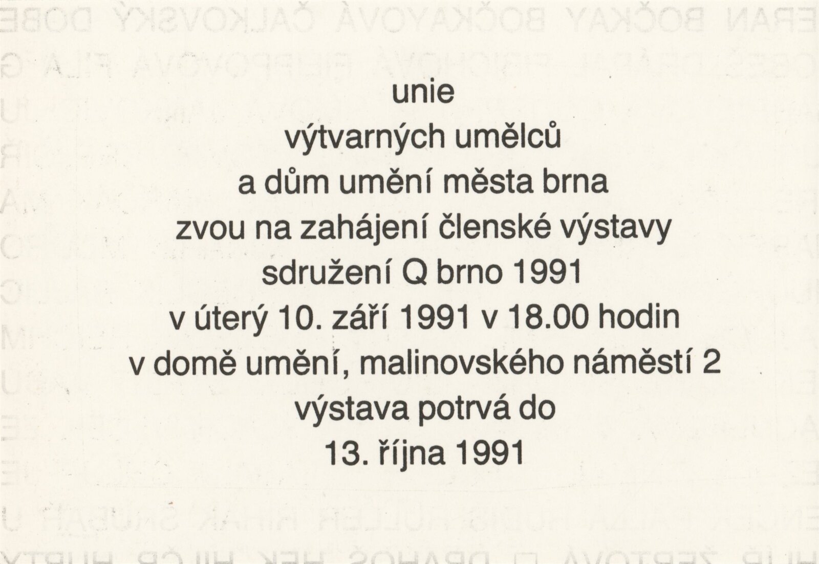 Almanach Q (4). Katalog členské výstavy 1991: Dům umění města Brna, 1. patro, 10. 9. – 13. 10. 1991 / Redakce: Ludvik Kundera, Jan Rajlich, Zdena Zábranská. – Brno: Sdružení Q, 1991. – 48 s., obr., seznam vystavených prací [8] s., DU 909