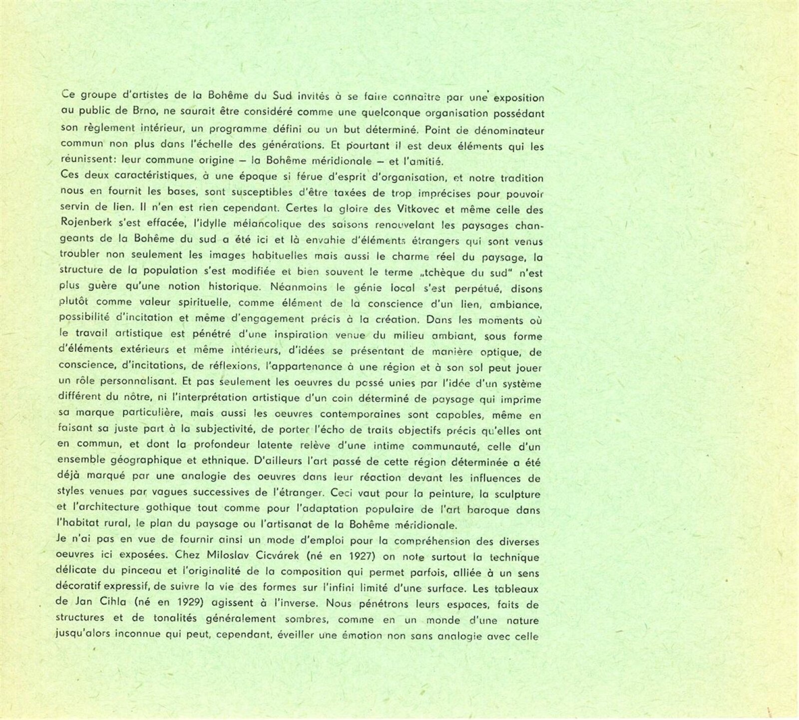 pozvánka, katalog, zpráva o výstavě z DU, úvodní slovo, korespondence (Adolfa Kroupy s autory), provozní korespondence, recenze v tisku, katalogy výstav jednotlivých autorů v jiných galeriích (Francie, Polsko, Švédsko, Česká republika)