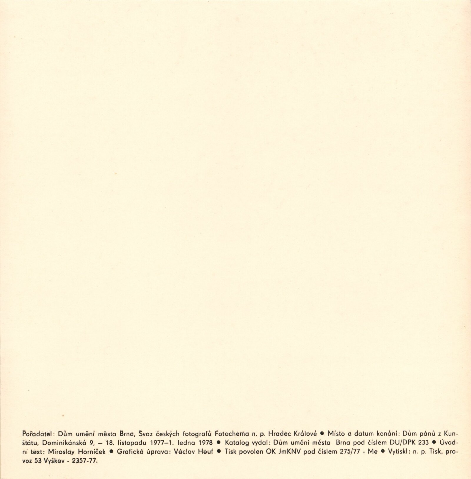Setkání 77. Práce 10 fotografů: Dům umění / Dům pánů z Kunštátu, 18. 11. 1977 – 1. 1. 1978 / Text: Miroslav Horníček. – Brno: DUmB, 19777. – 10 volných listů v obalu, DPK 655. – MZK; MG