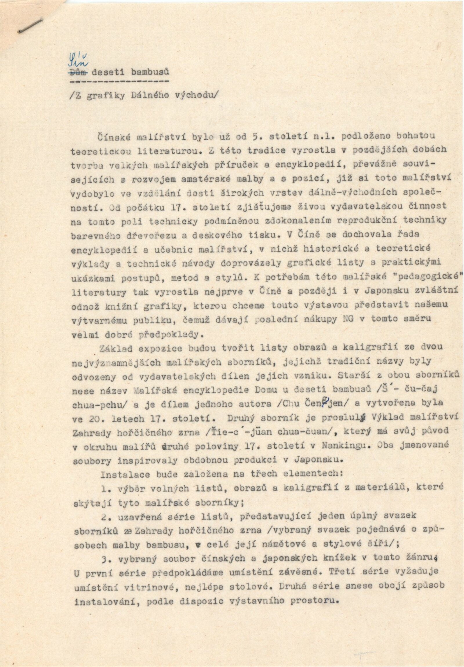 Síň deseti bambusů. Východní grafika malířských alb a manuálů: Dům umění / Dům pánů z Kunštátu, 157. výstava Kabinetu grafiky, 23. 4. – 23. 5. 1976 / Text: Oldřich Král. – Brno: DUmB, 1976. – 12 s., obr., katalog 2 s., DPK 627. – MZK; MG