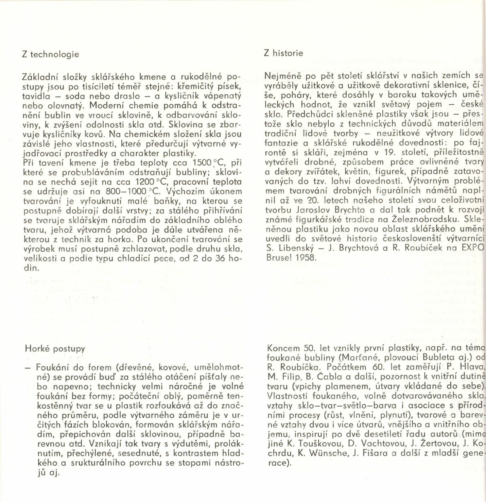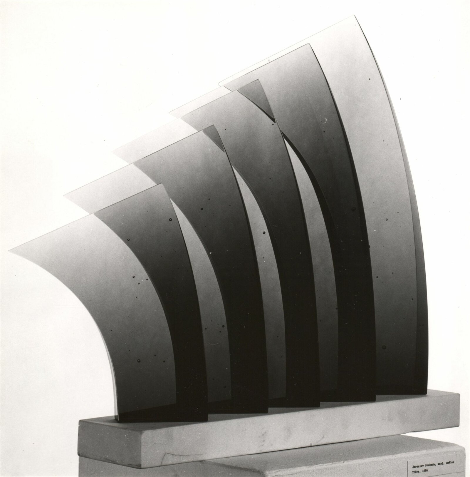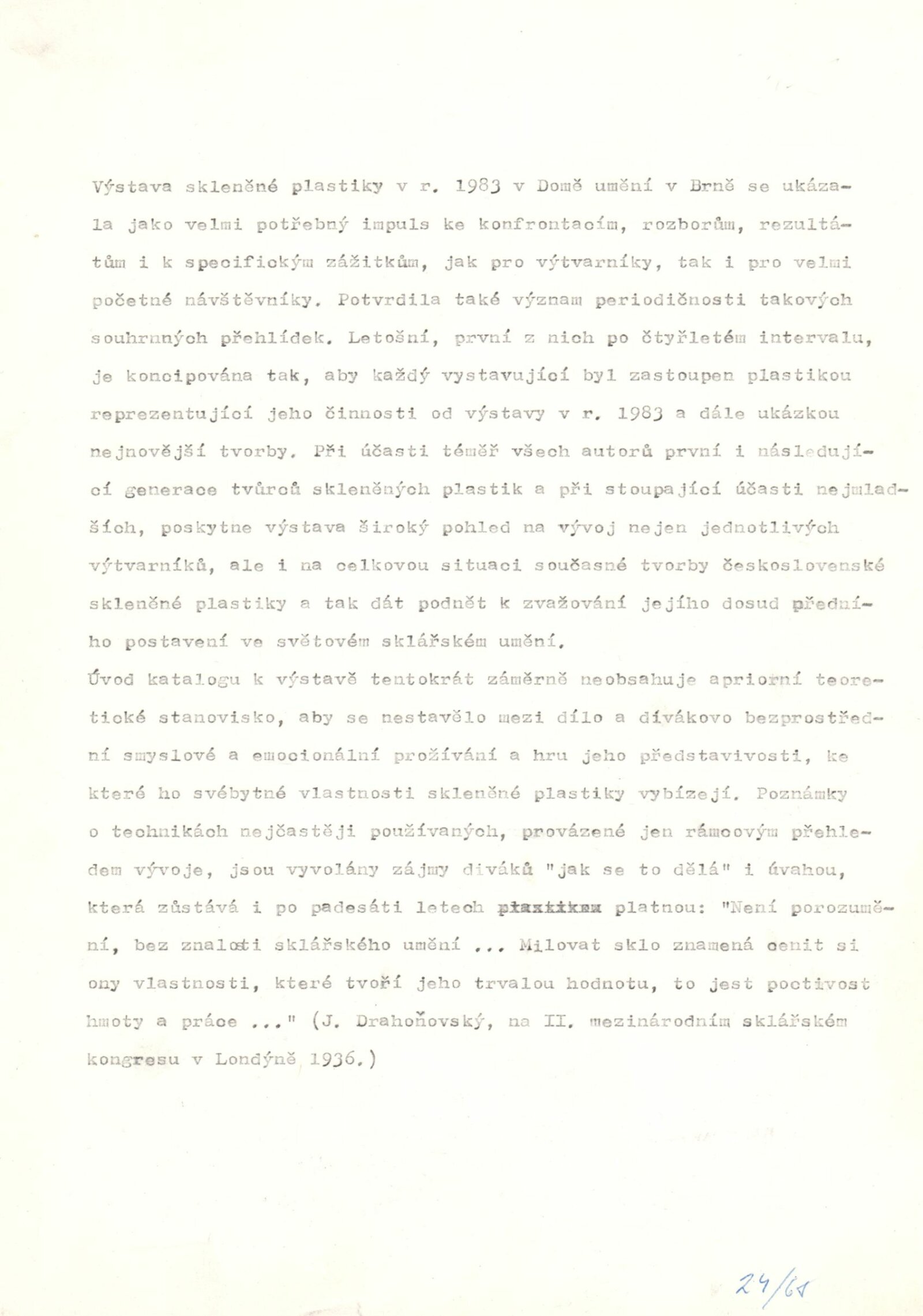 pozvánka, katalog, úvodní slovo, zpráva o výstavě - Jiřina Hockeová, text J. Drahoňovského z r. 1936 (Č, A, R), seznam autorů, texty pro katalog - strojopis, popisky k fotografiím v katalogu, fotografie vystavených děl pro katalog, fotografie výstavy a z vernisáže, seznam vystavených děl (několik variant), pojistný seznam, provozní korespondence, potvrzení o převzetí od jednotlivých autorů, jejich plné moci a zápůjčky, adresy zahraničních zájemců, žádost o povolení výstavy, recenze v tisku, katalog k výstavě Současná československá skleněná plastika v OG v Trenčíně (1987), časopis Glasrevue (1987)