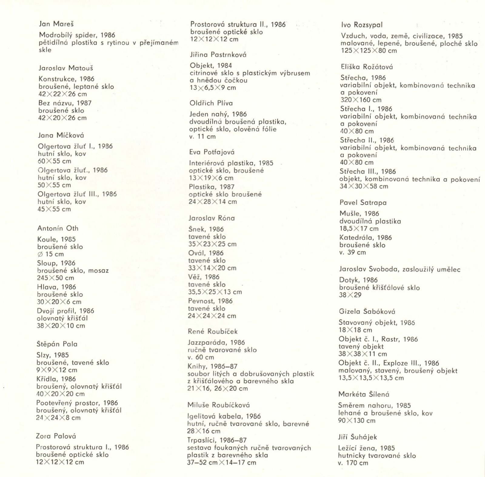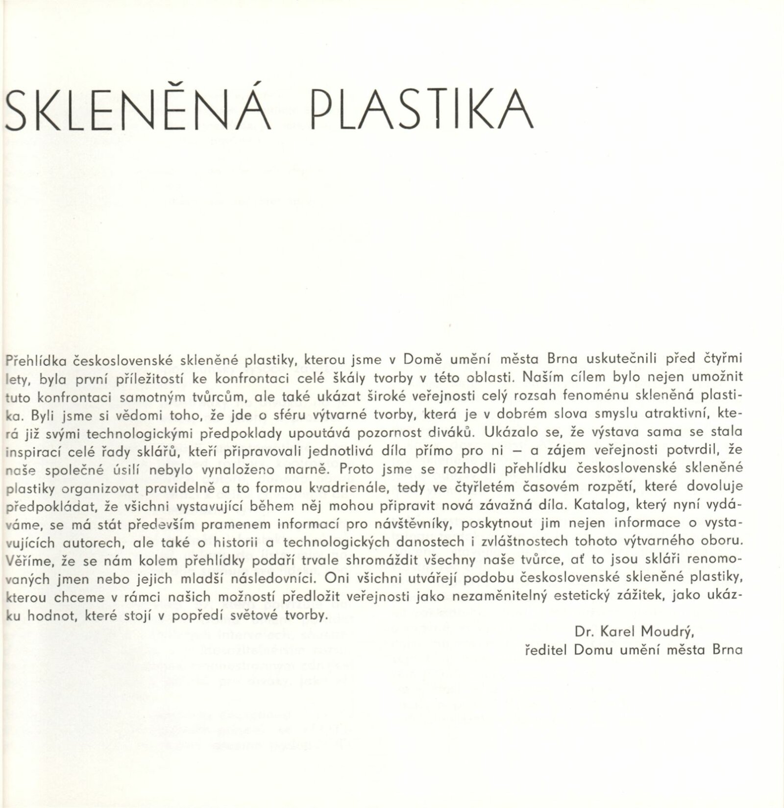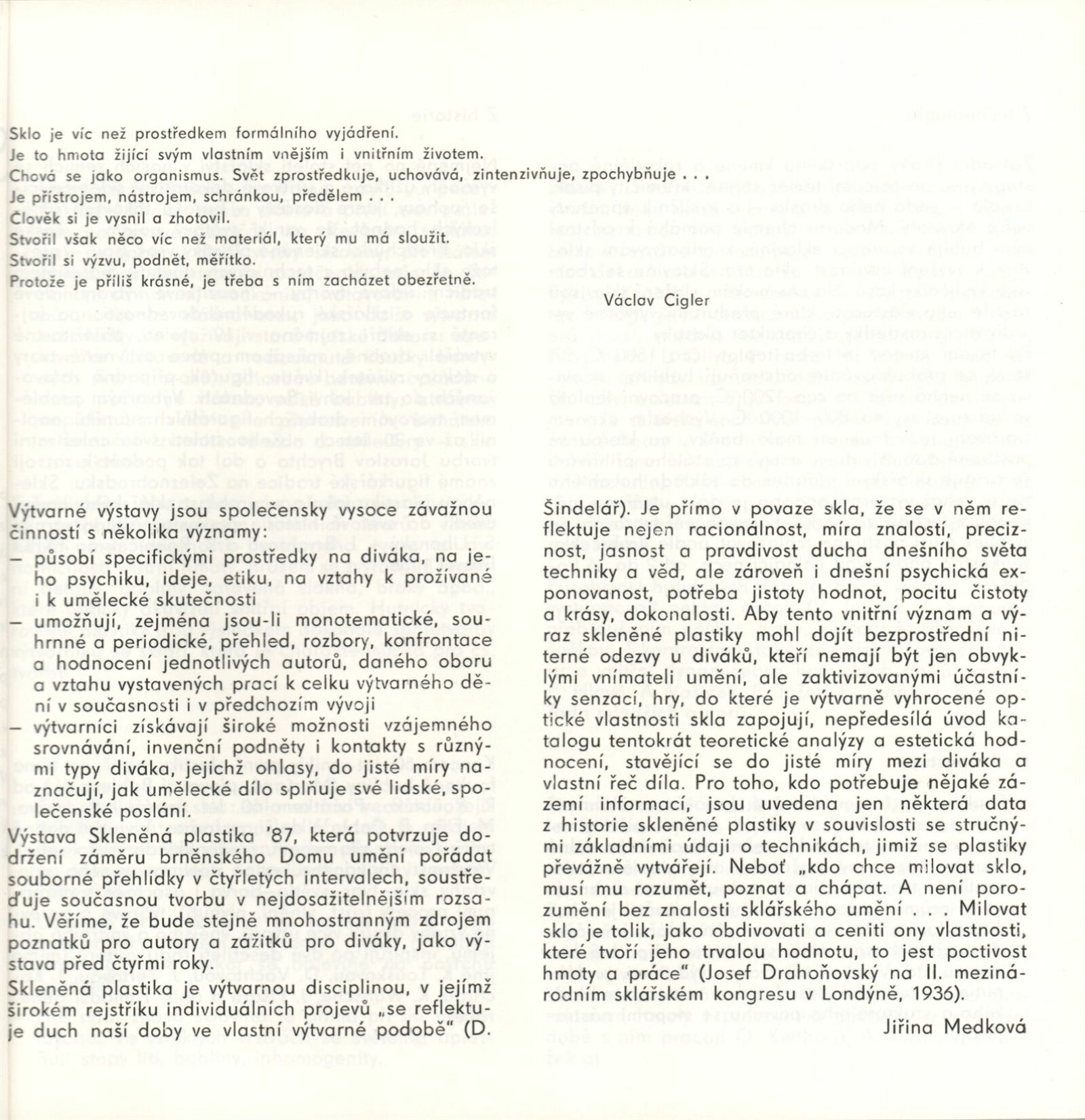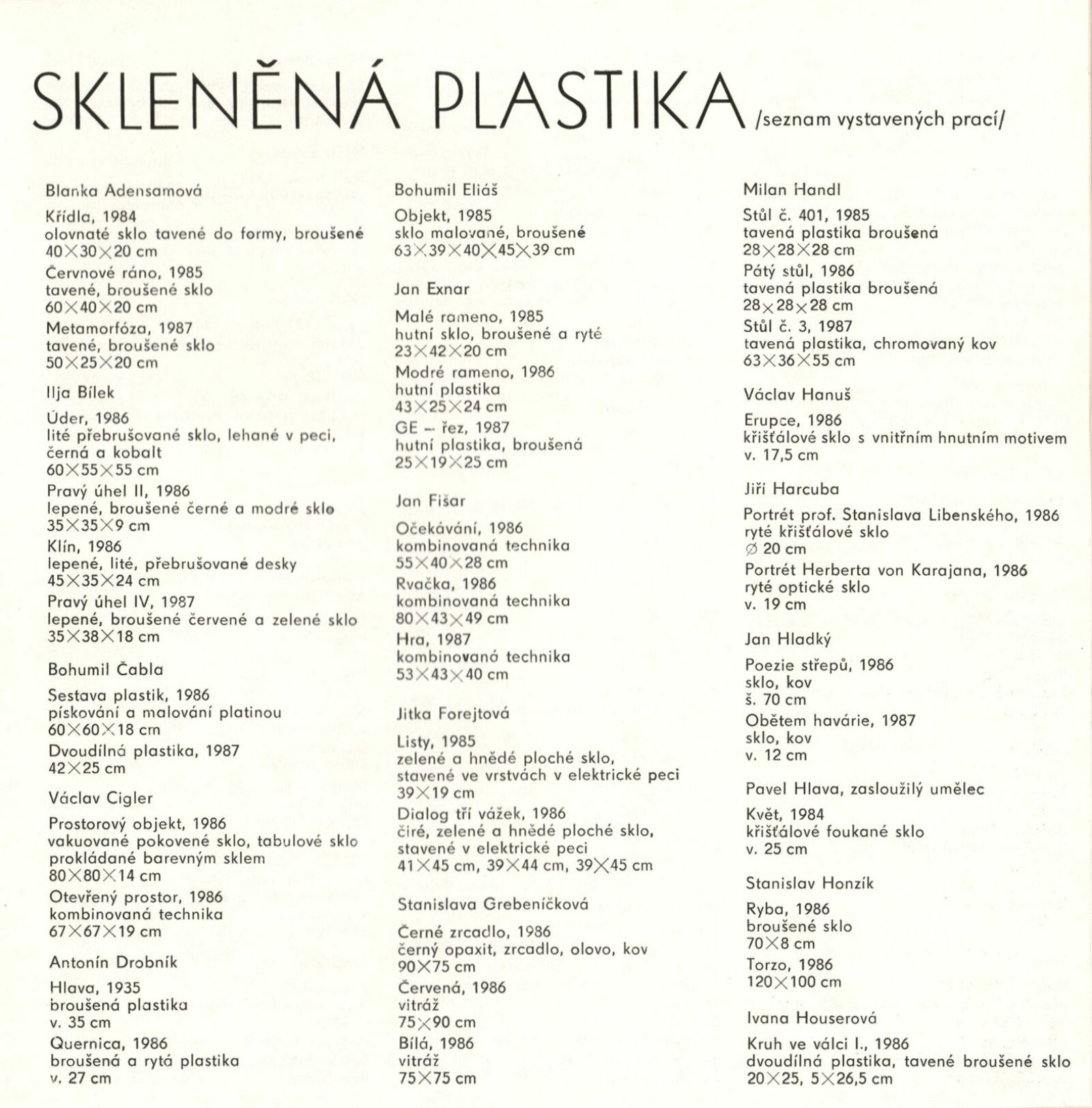 Skleněná plastika. Současná československá tvorba: Dům umění města Brna, 14. 4. – 17. 5. 1987 / Texty: Karel Moudrý, Jiřina Medková. – Brno: DUmB, 1987. – [78] s., obr., seznam vystavených prací [4] s., životní data vystavujících, DU 835. – MZK; MG; MMB