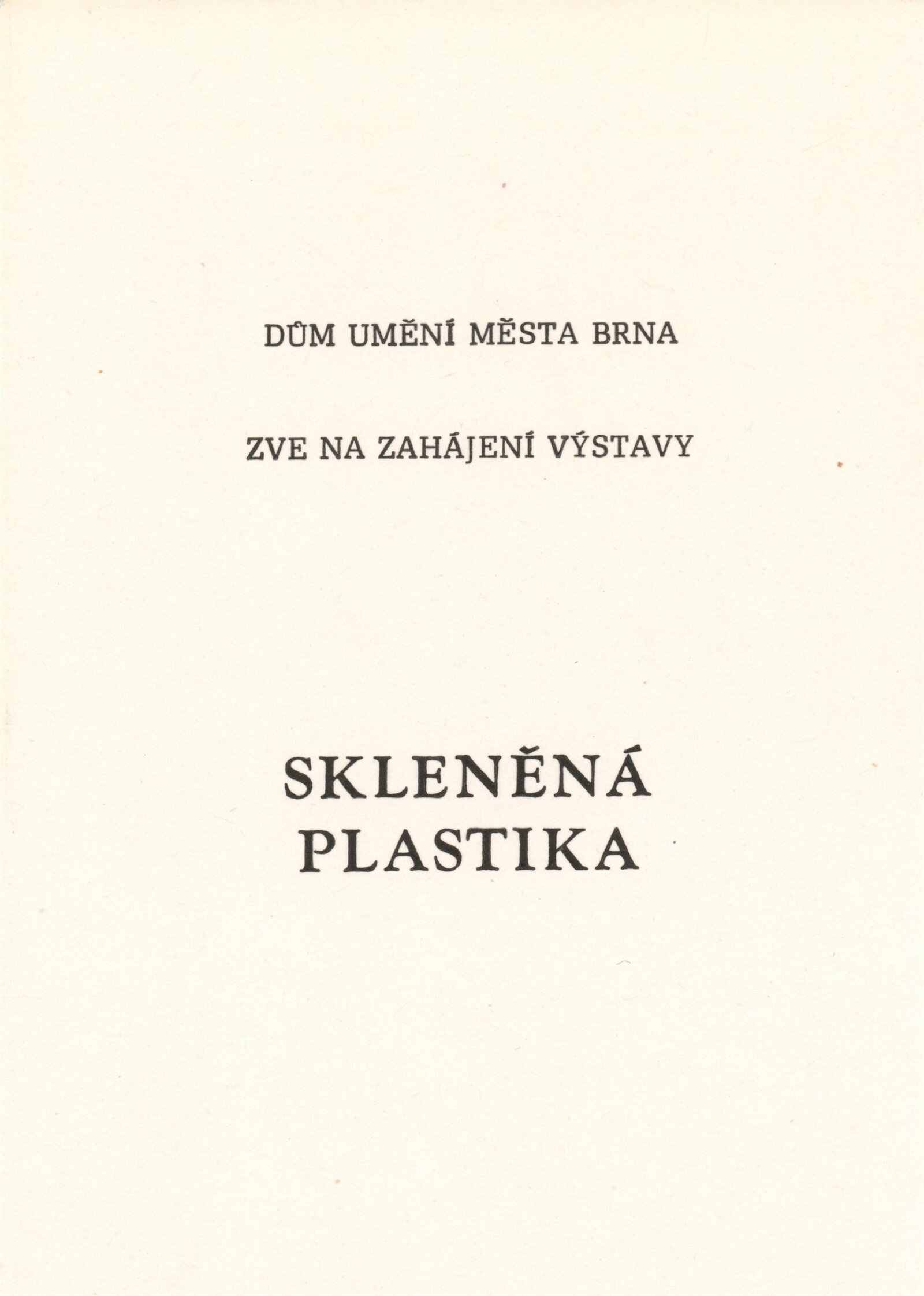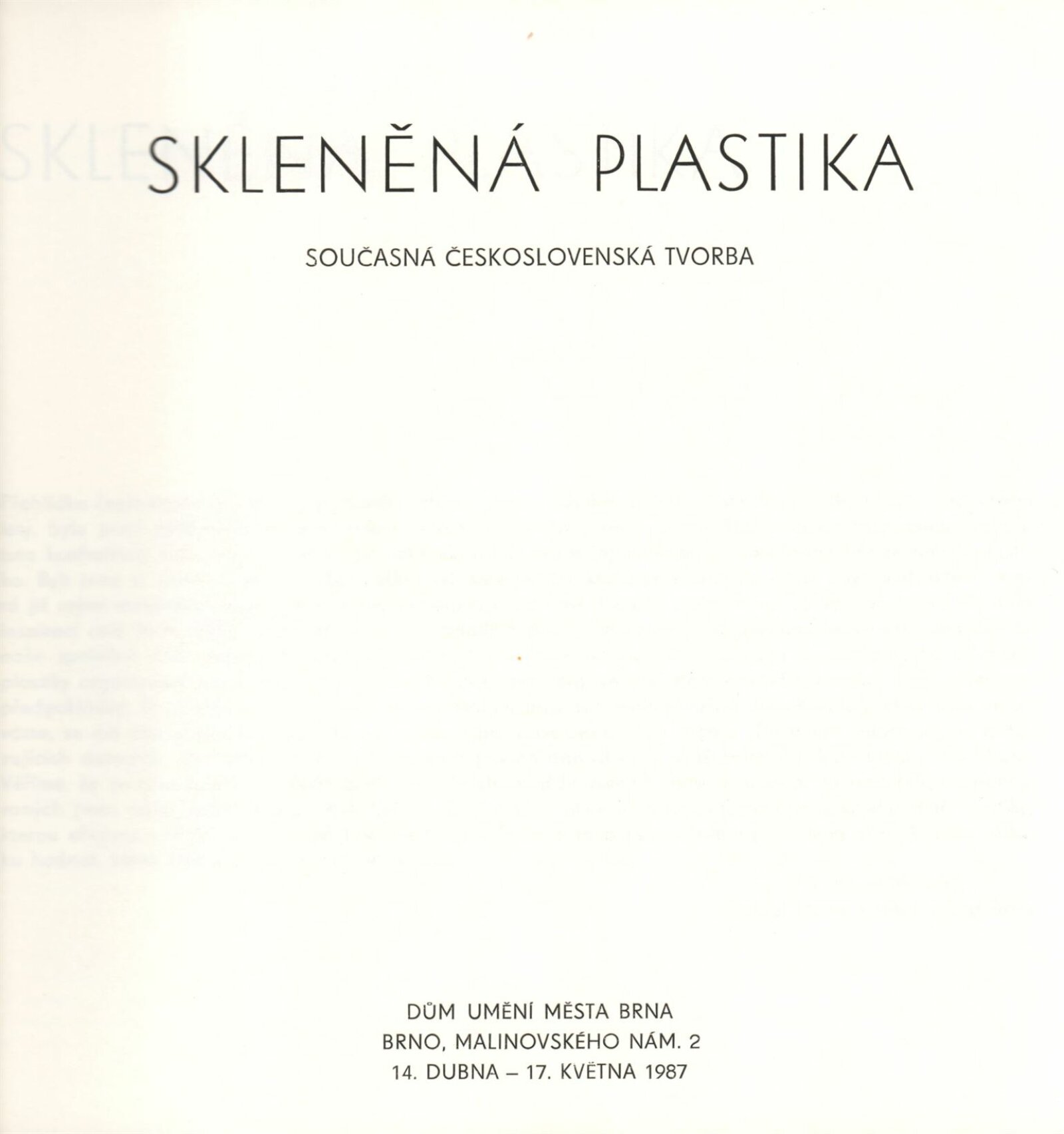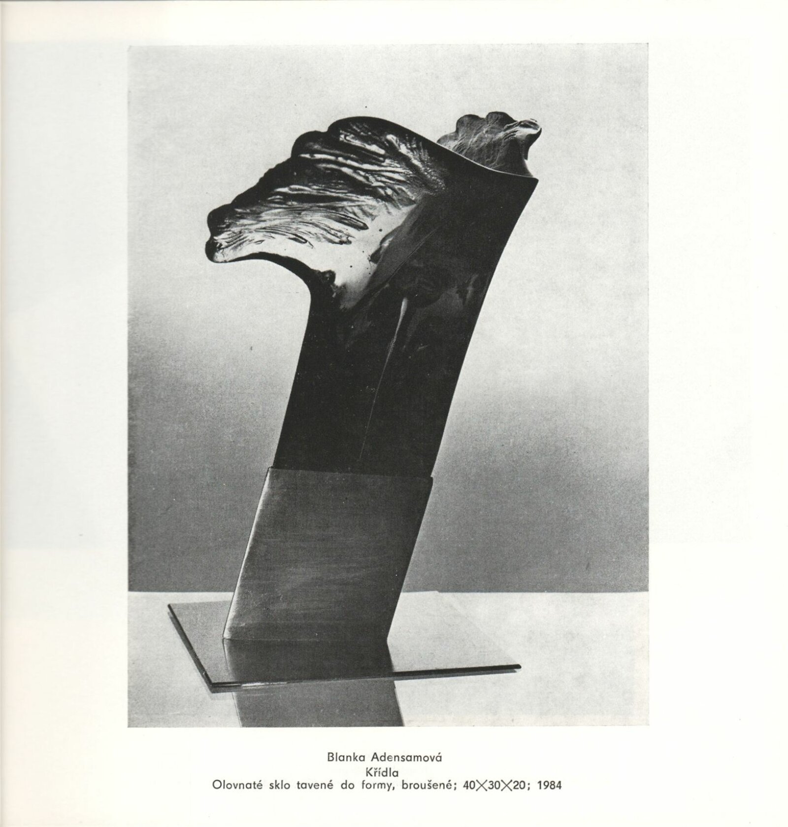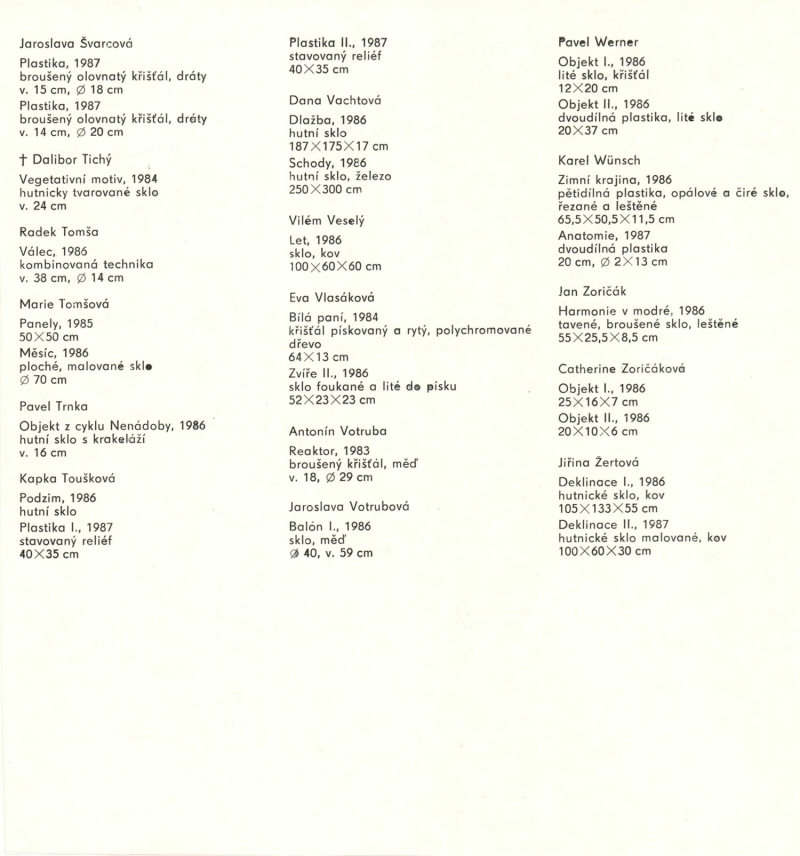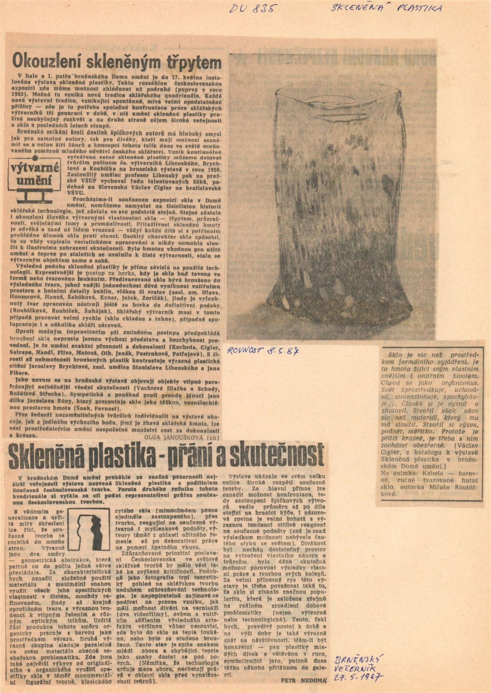 Skleněná plastika. Současná československá tvorba: Dům umění města Brna, 14. 4. – 17. 5. 1987 / Texty: Karel Moudrý, Jiřina Medková. – Brno: DUmB, 1987. – [78] s., obr., seznam vystavených prací [4] s., životní data vystavujících, DU 835. – MZK; MG; MMB