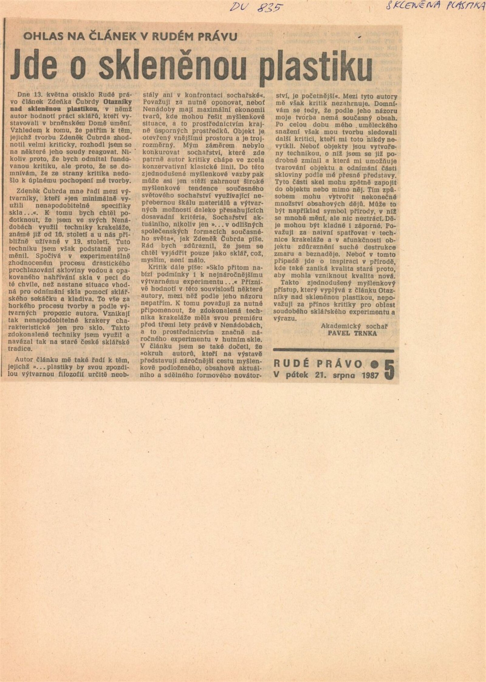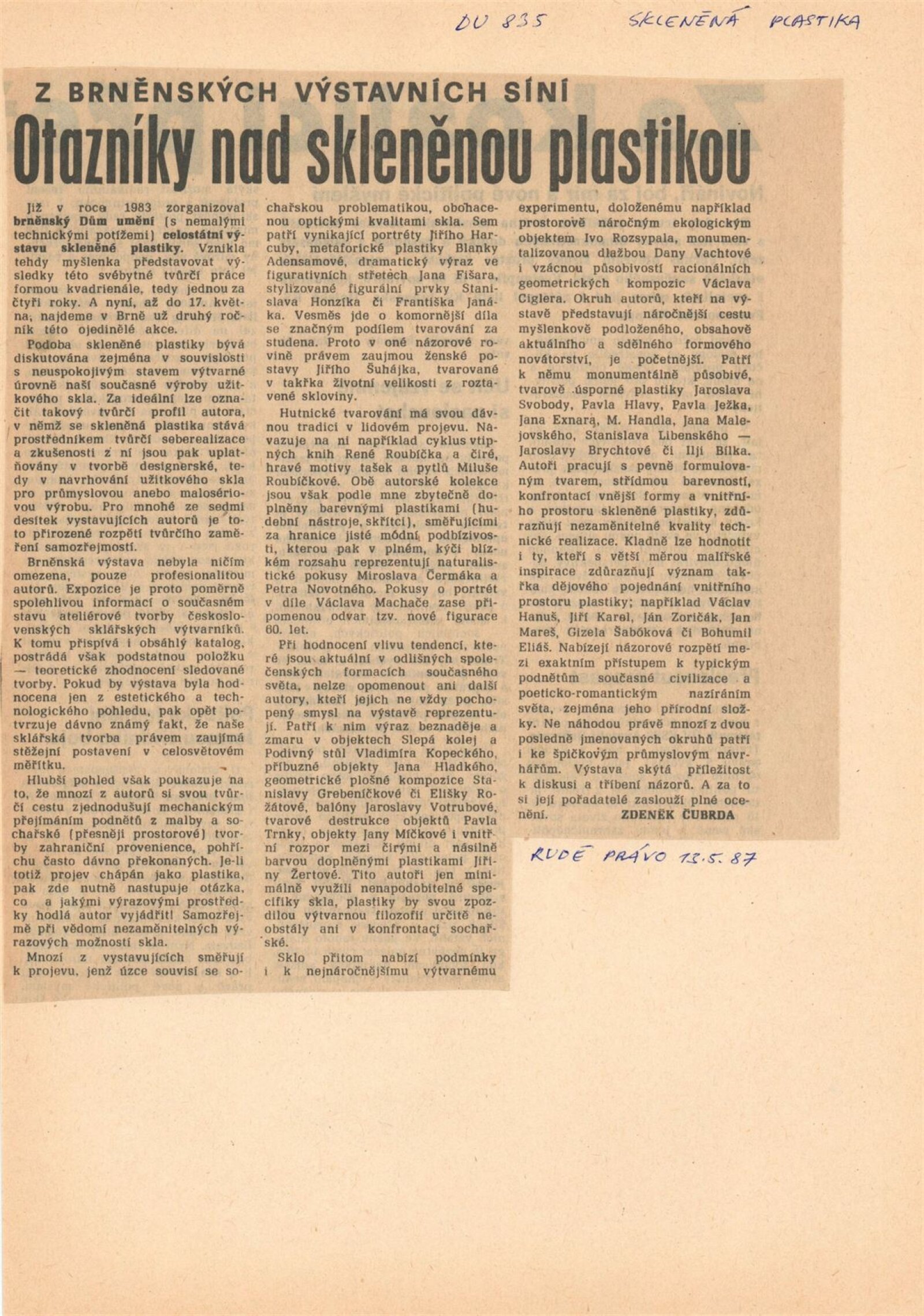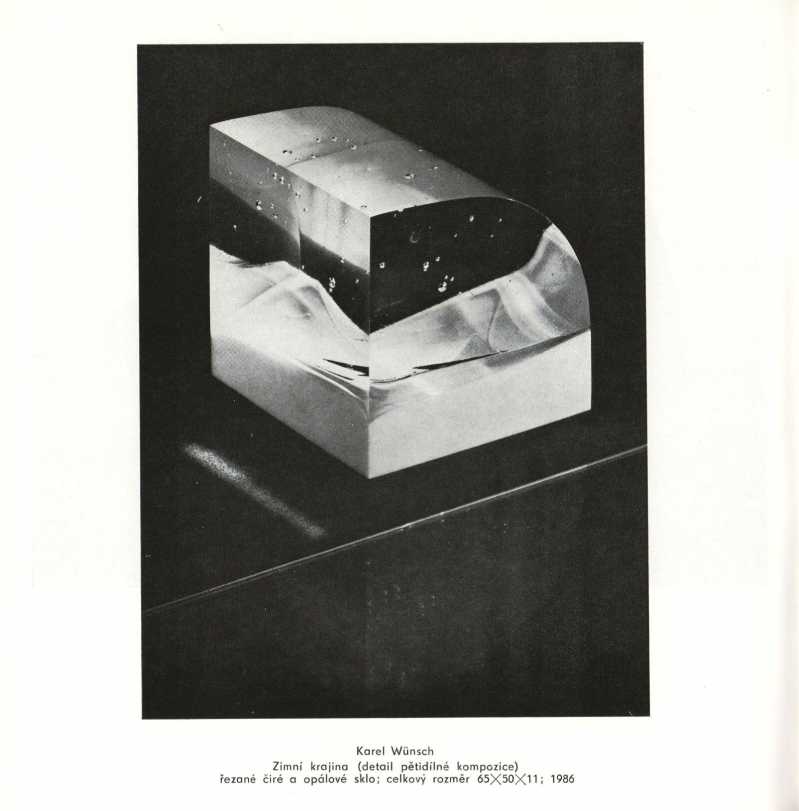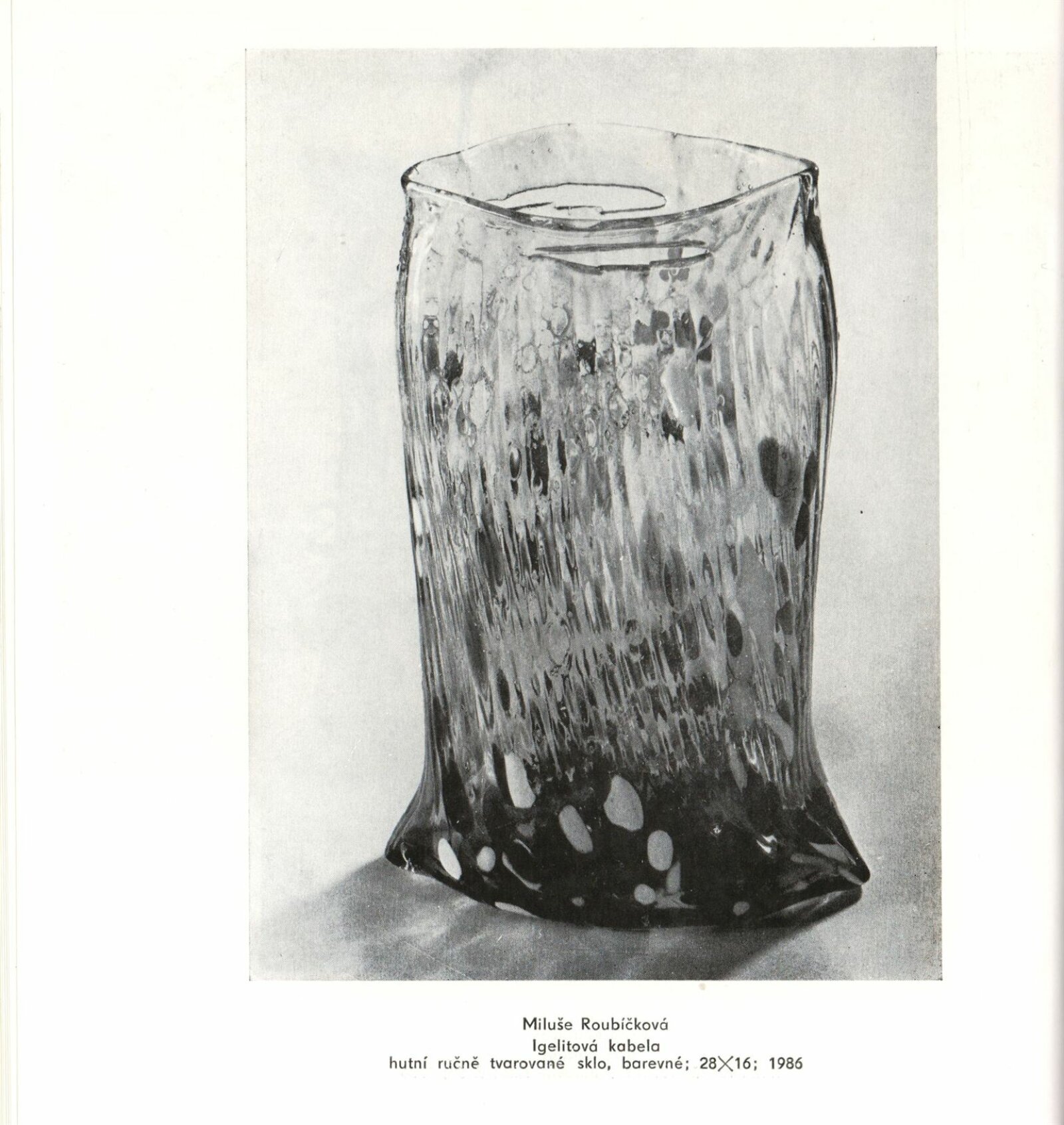 Skleněná plastika. Současná československá tvorba: Dům umění města Brna, 14. 4. – 17. 5. 1987 / Texty: Karel Moudrý, Jiřina Medková. – Brno: DUmB, 1987. – [78] s., obr., seznam vystavených prací [4] s., životní data vystavujících, DU 835. – MZK; MG; MMB