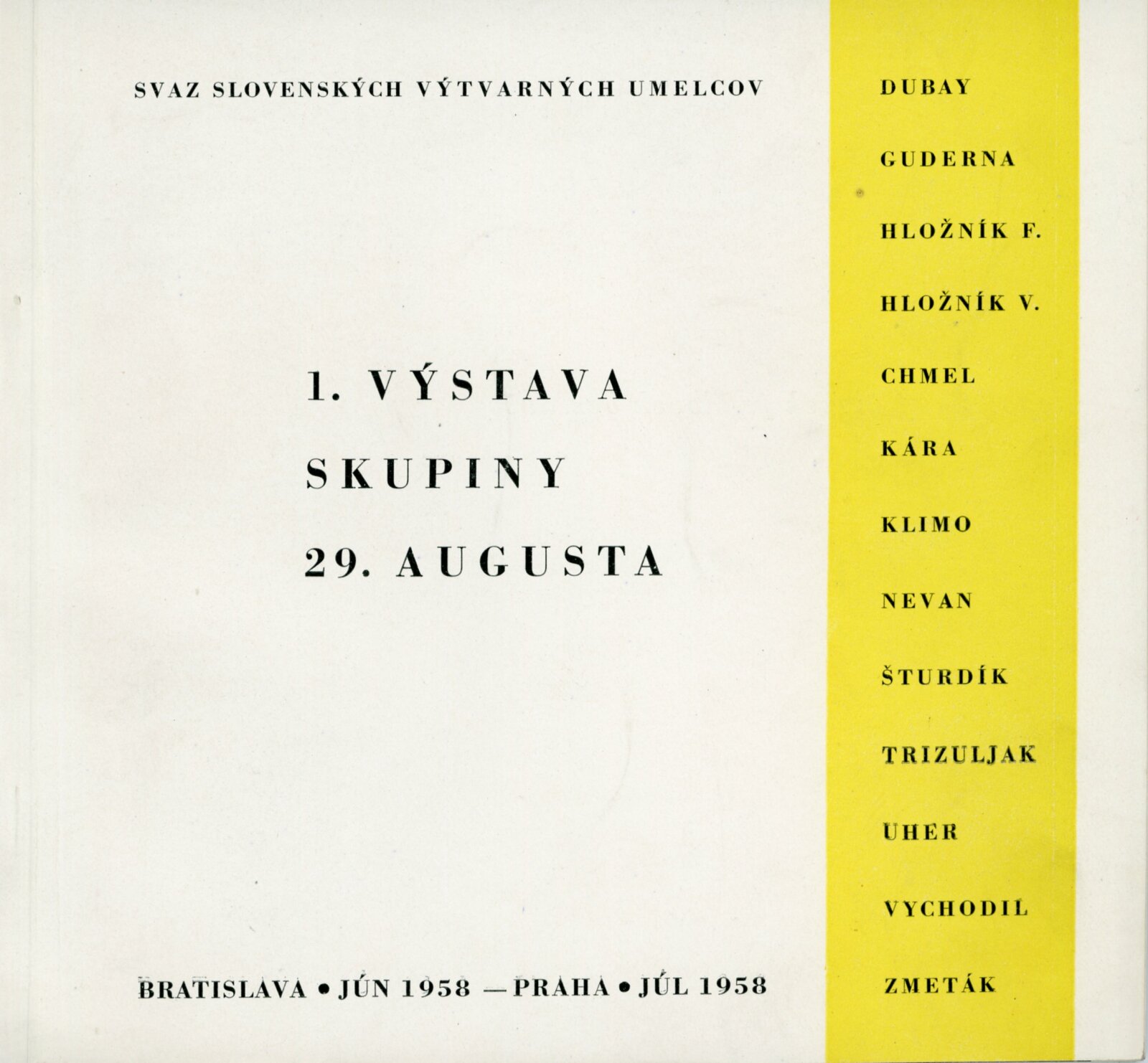 Skupina 29. augusta: Dům umění v Brně / Dům pánů z Poděbrad 2. 11. – 30. 11. 1958 / Převzatý katalog. 1. výstava Skupiny 29. augusta: Bratislava Šafárikovo námestie, 7. 6. – (n). 7. 1958 / Text: Ľubor Kára. – Bratislava: Svaz slovenských výtvarných umelců, 1958. – 56 s., obr., životní data vystavujících, DPK 13. – MZK