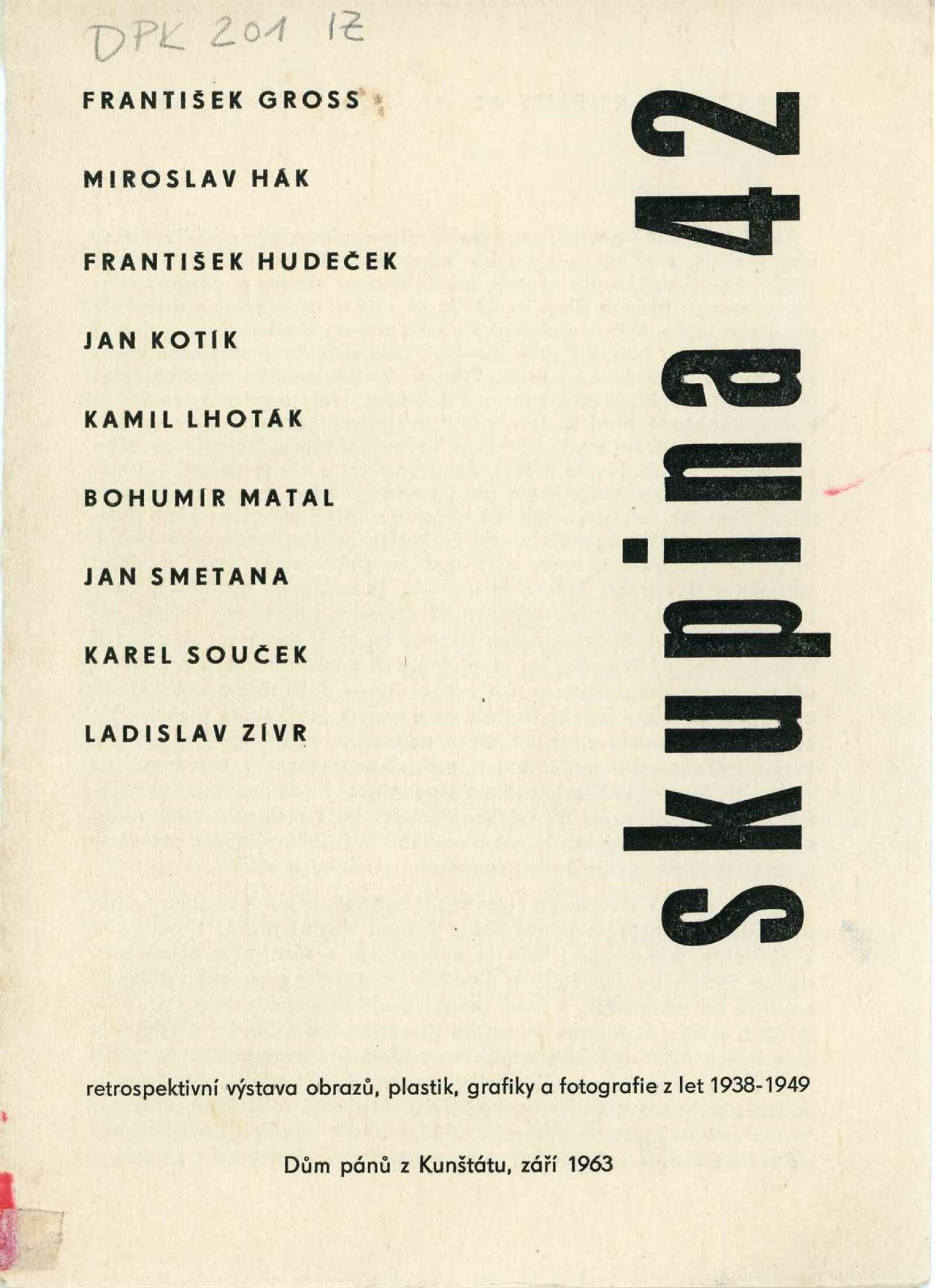 Skupina 42. Retrospektivní výstava obrazů, plastik, grafiky a fotografie z let 1938–1949: Dům umění města Brna / Dům pánů z Kunštátu, 1. patro, 6. 9. – 13. 10. 1963 / Text: Jiří Kotalík. – Brno: DUmB, 1963. – 4 s., seznam vystavených prací 4 s., DPK 201. – MZK; MG