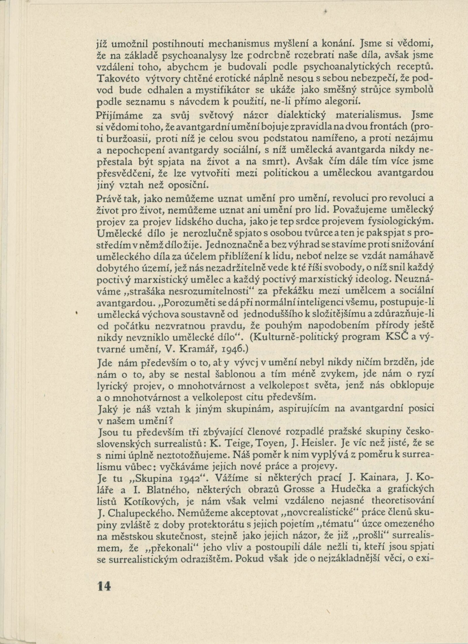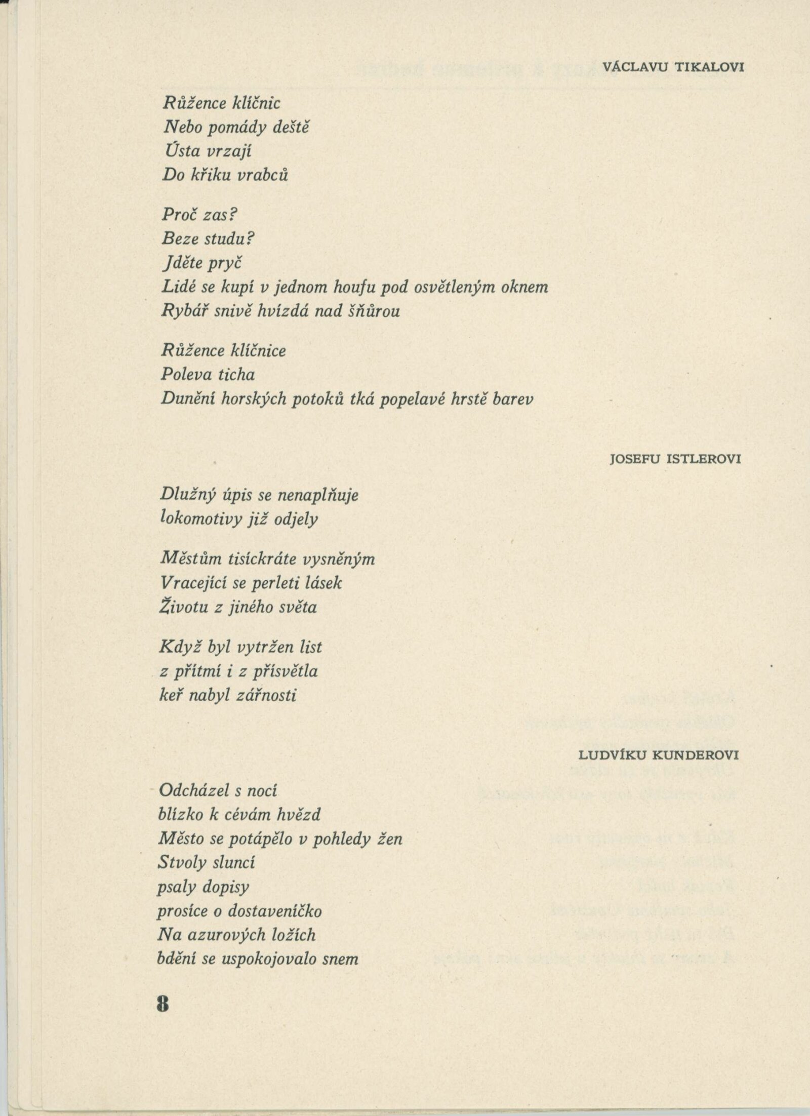 Skupina Ra. I. výstava: Dům umění v Brně, od 11. 1. 1947 / K výstavě vyšel sborník. Skupina Ra. – Text: členové skupiny Ra. – Brno: Skupina Ra, 1947. – 6. svazek edice Ra, 34 s., seznam obrazů 2 s., básně Zdeňka Lorence, Ludvíka Kundery, DU 31. – MG