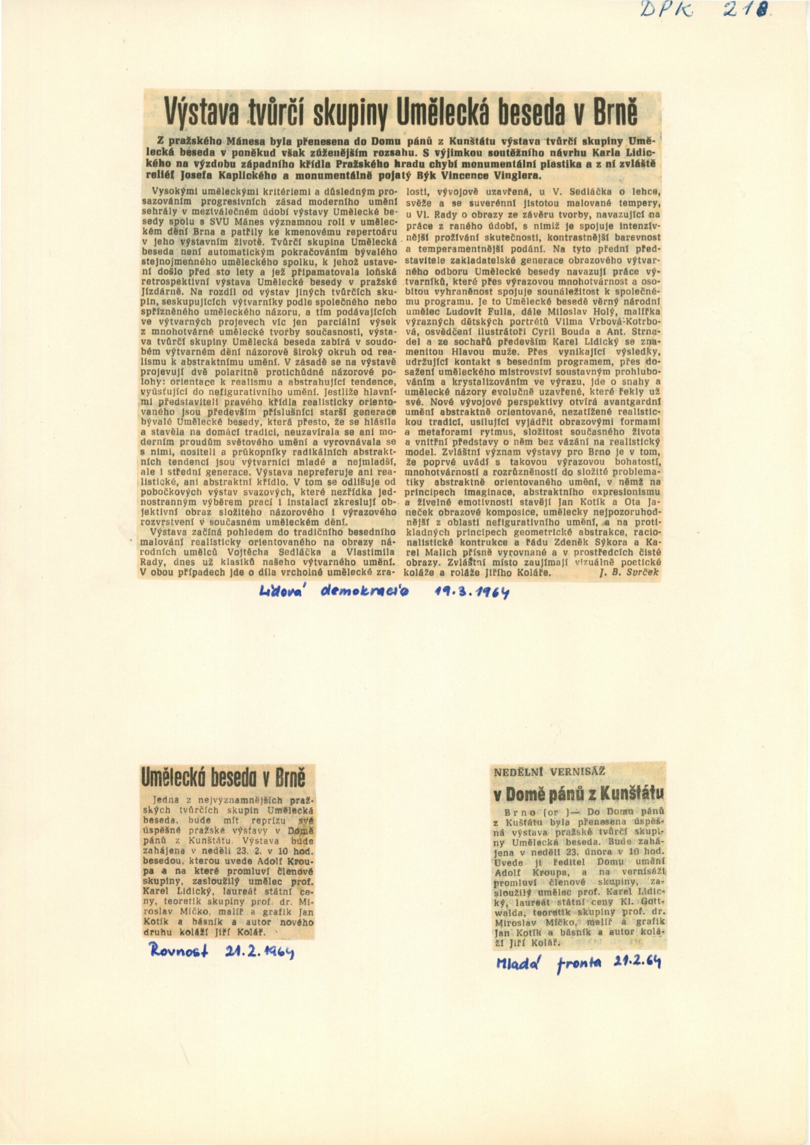 Skupina Umělecká beseda: Dům umění města Brna / Dům pánů z Kunštátu, 1. patro, 23. 2. – 30. 3. 1964 / Převzatý katalog. Skupina Umělecká beseda: Výstavní síň Mánes, Praha, leden–únor 1964 / Text: M. Míčko. – Praha: SČSVU, 1964. – 12 s., obr., seznam vystavených děl 4 s., DPK 218