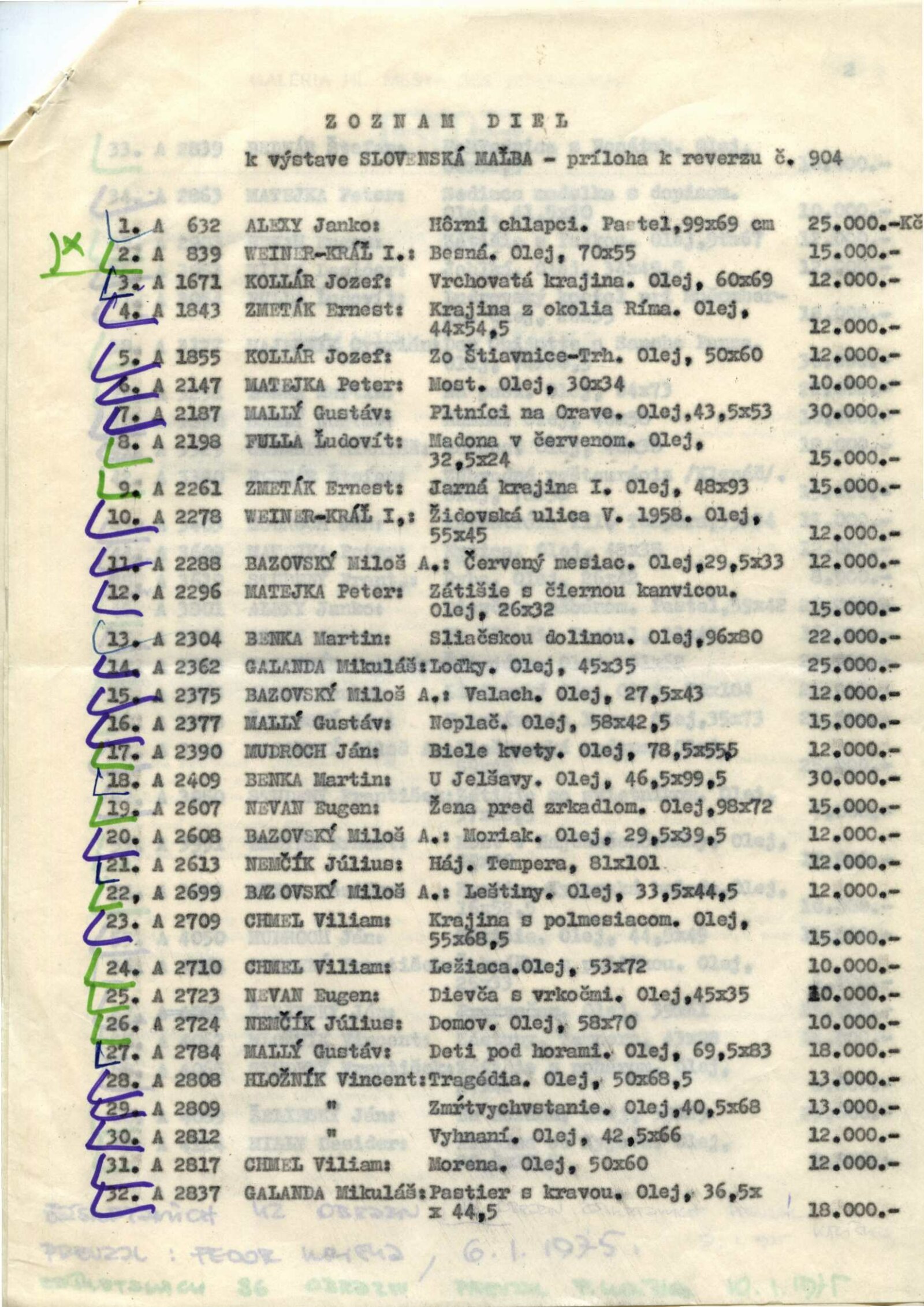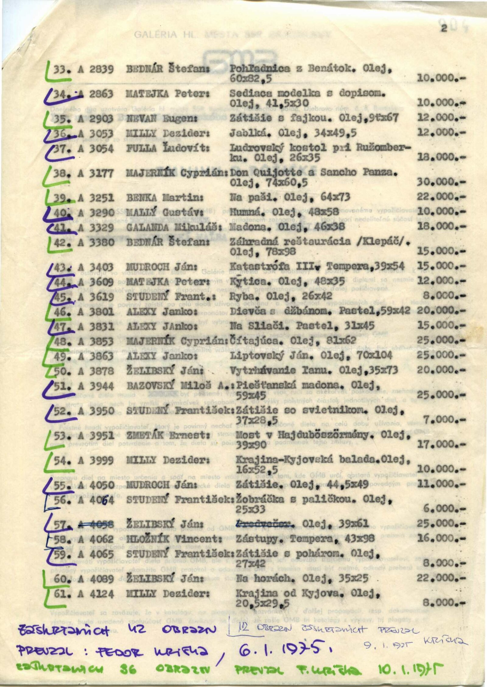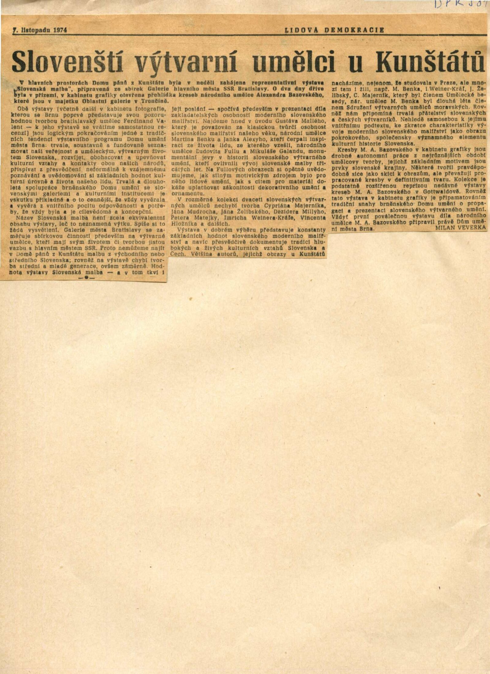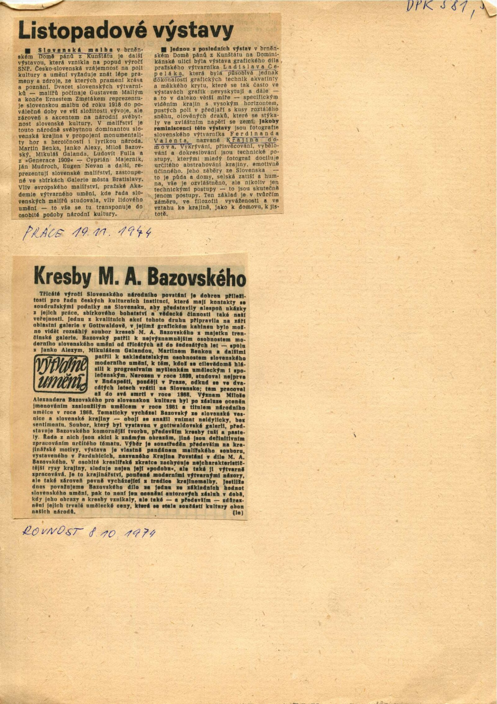 Slovenská malba: Dům umění / Dům pánů z Kunštátu, 3. 11. – 1. 12. 1974 / Převzatý katalog. Slovenská malba. Ze sbírek Galerie hlavního města Slovenské socialistické republiky Bratislavy: Výstavní síně Okresního vlastivědného muzea, Žďár nad Sázavou, 2. 5. – říjen 1974 / Texty: Oldřich Pospíšil, Fedor Kriška. – Žďár nad Sázavou: Okresní vlastivědné muzeum, 1974. – 32 s., obr., DPK 581. – MZK
