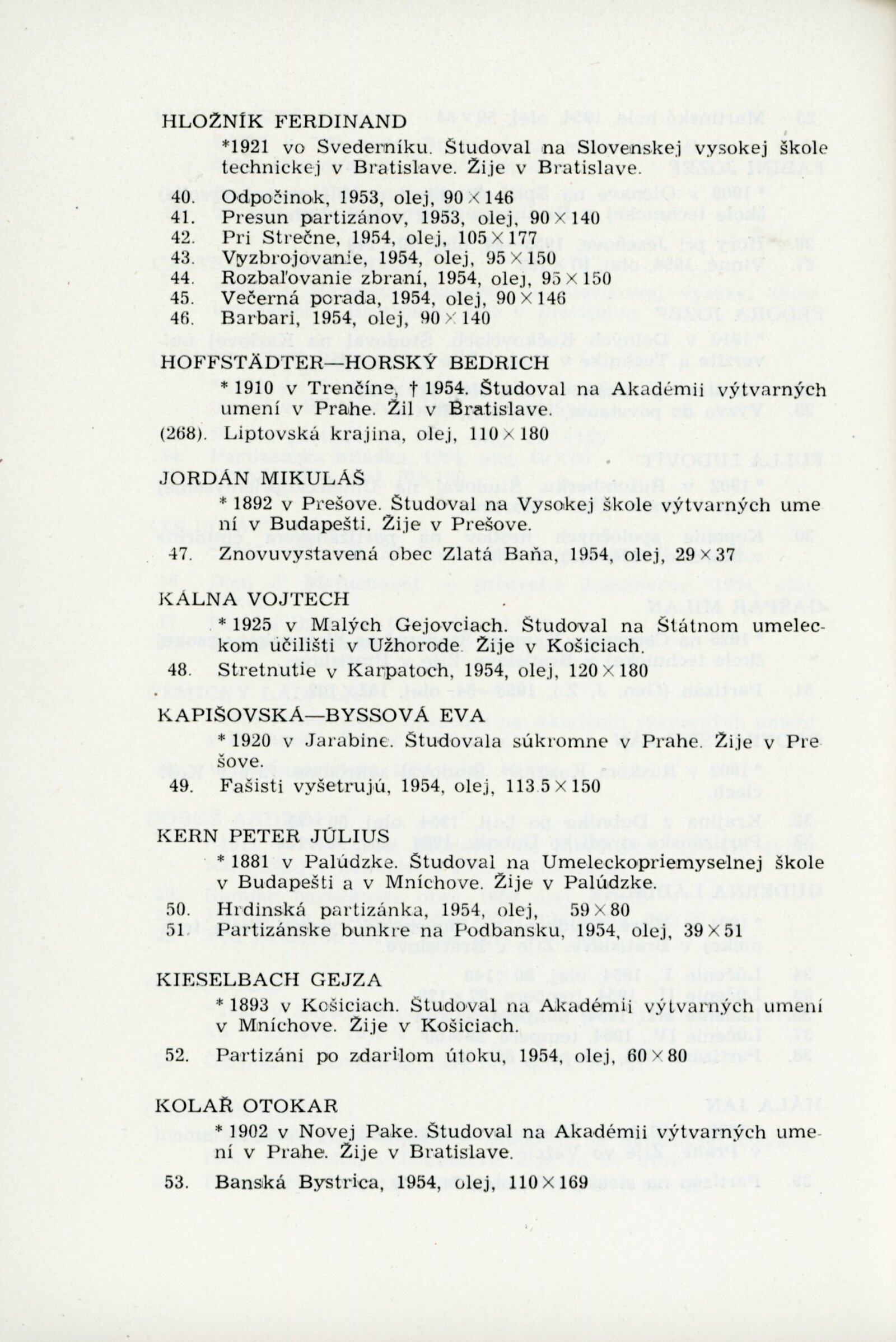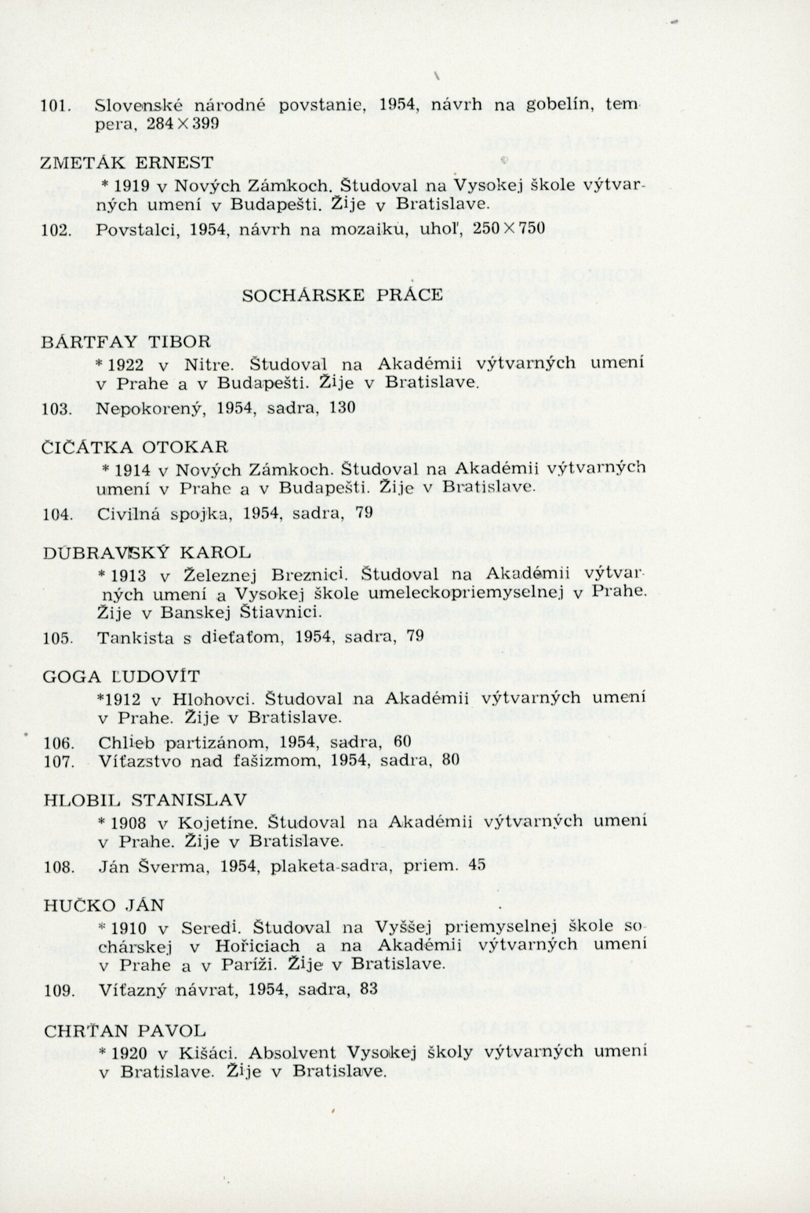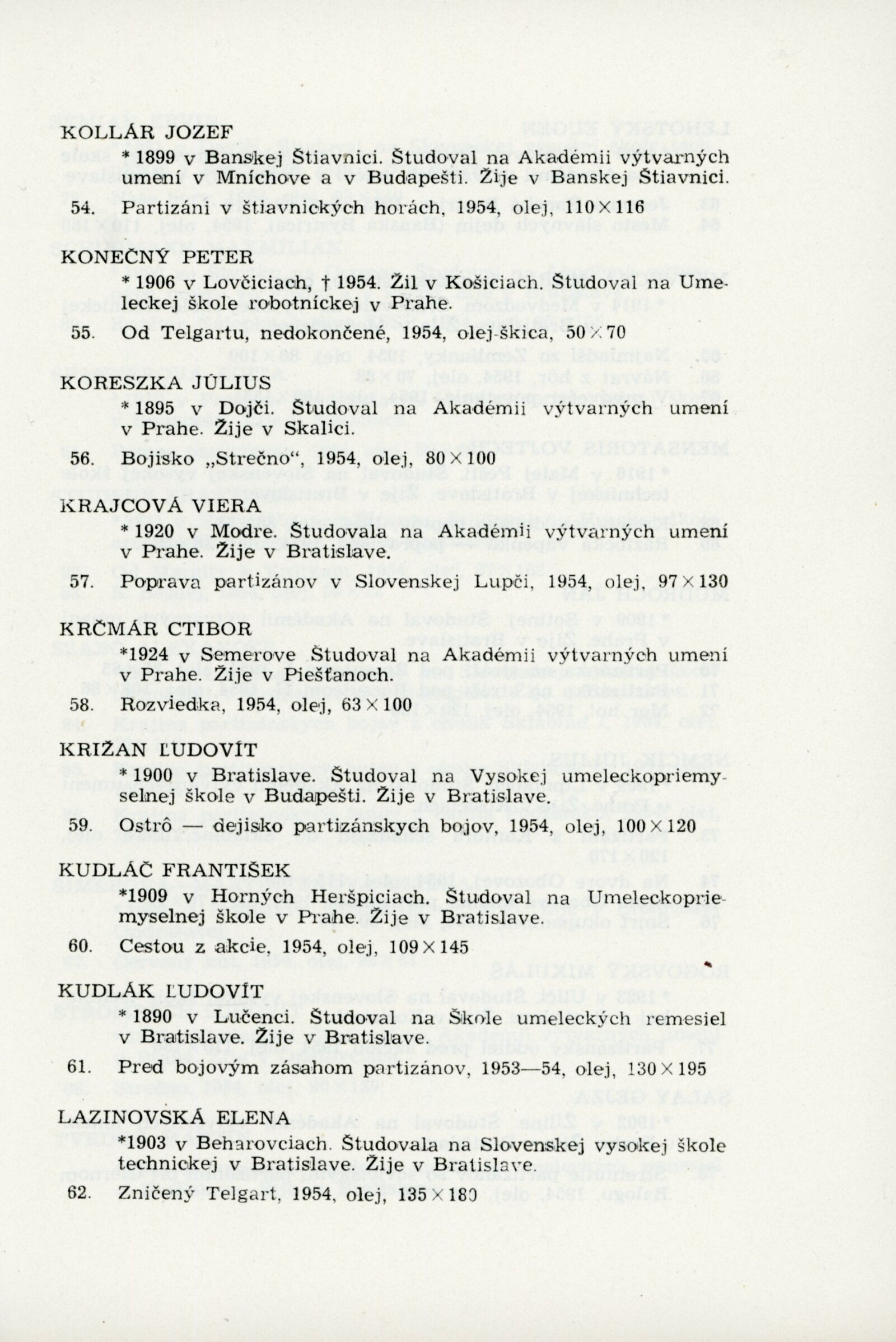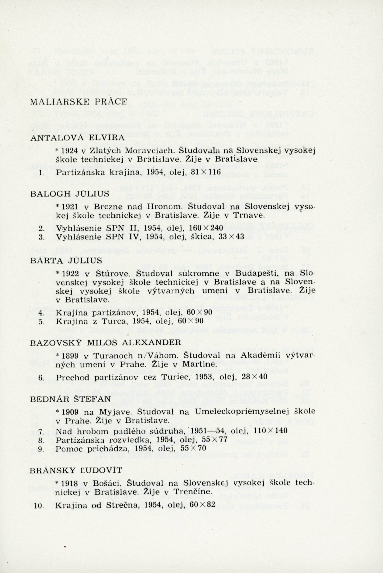 Slovenské národní povstání v dokumentech a výtvarných dílech 1944–1954: Dům umění, 15. 10. – 7. 11. 1954 / Převzatý katalog. Slovenské národné povstanie vo výtvarnej tvorbe 1944–1954: Slovenská univerzita v Bratislavě, výstavní místnosti slovenské sekce ÚSČSVU, srpen–zaří 1954 / Texty: Andrej Sarvaš, Štefan Bednár, Karol Vaculík. – Bratislava: Slovenská sekce ÚSČSVU, 1954. – 86 s., obr., 4 s. seznam děl retrospektivní části výstavy, životní data vystavujících, DU 205. – MZK