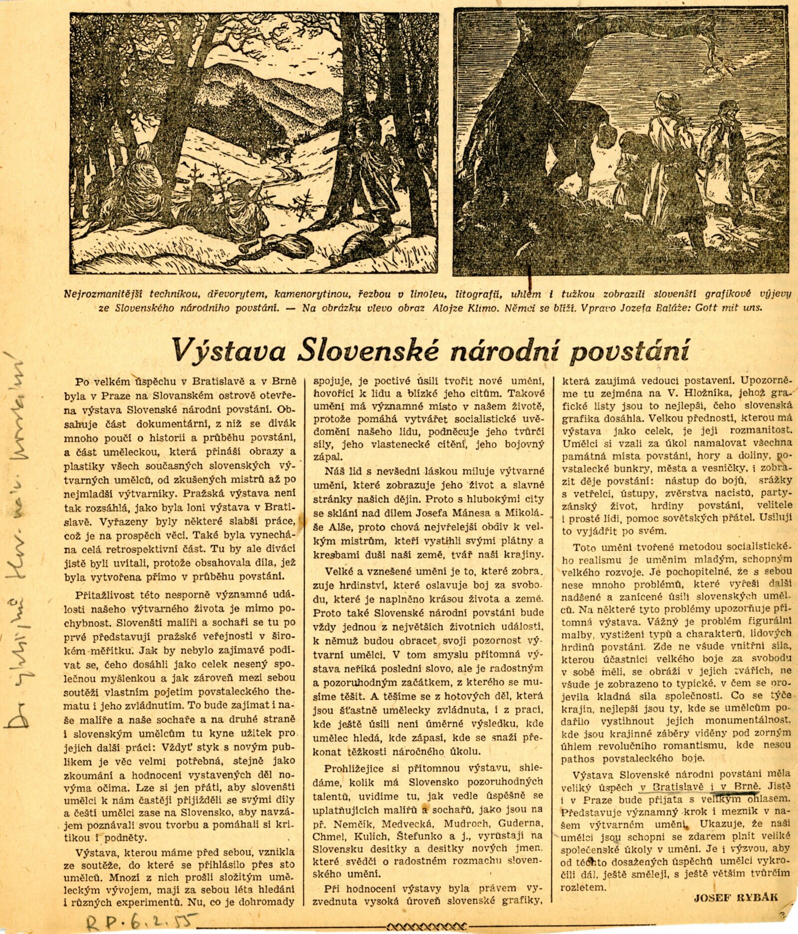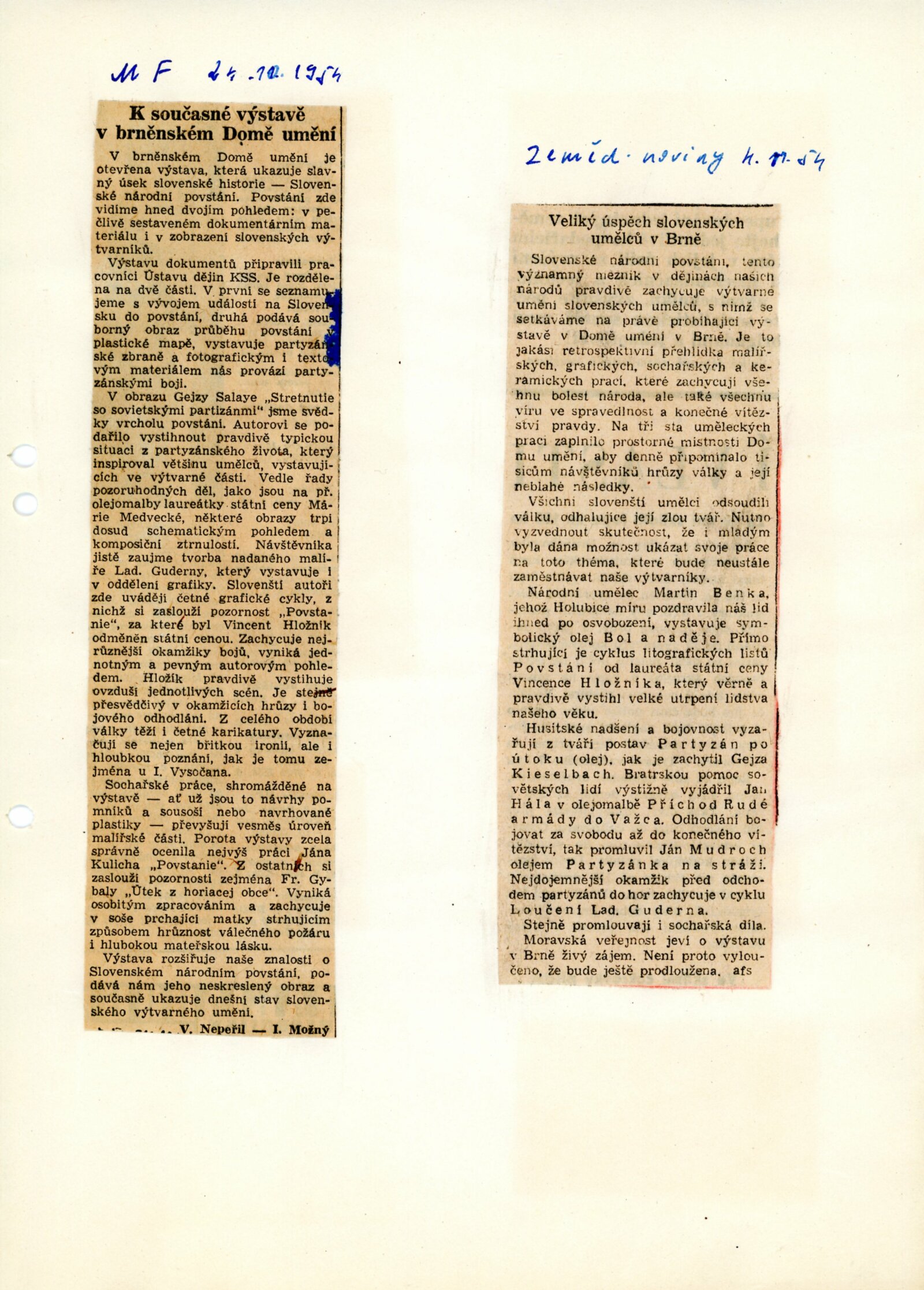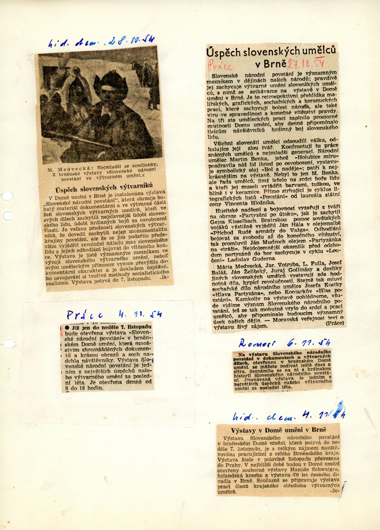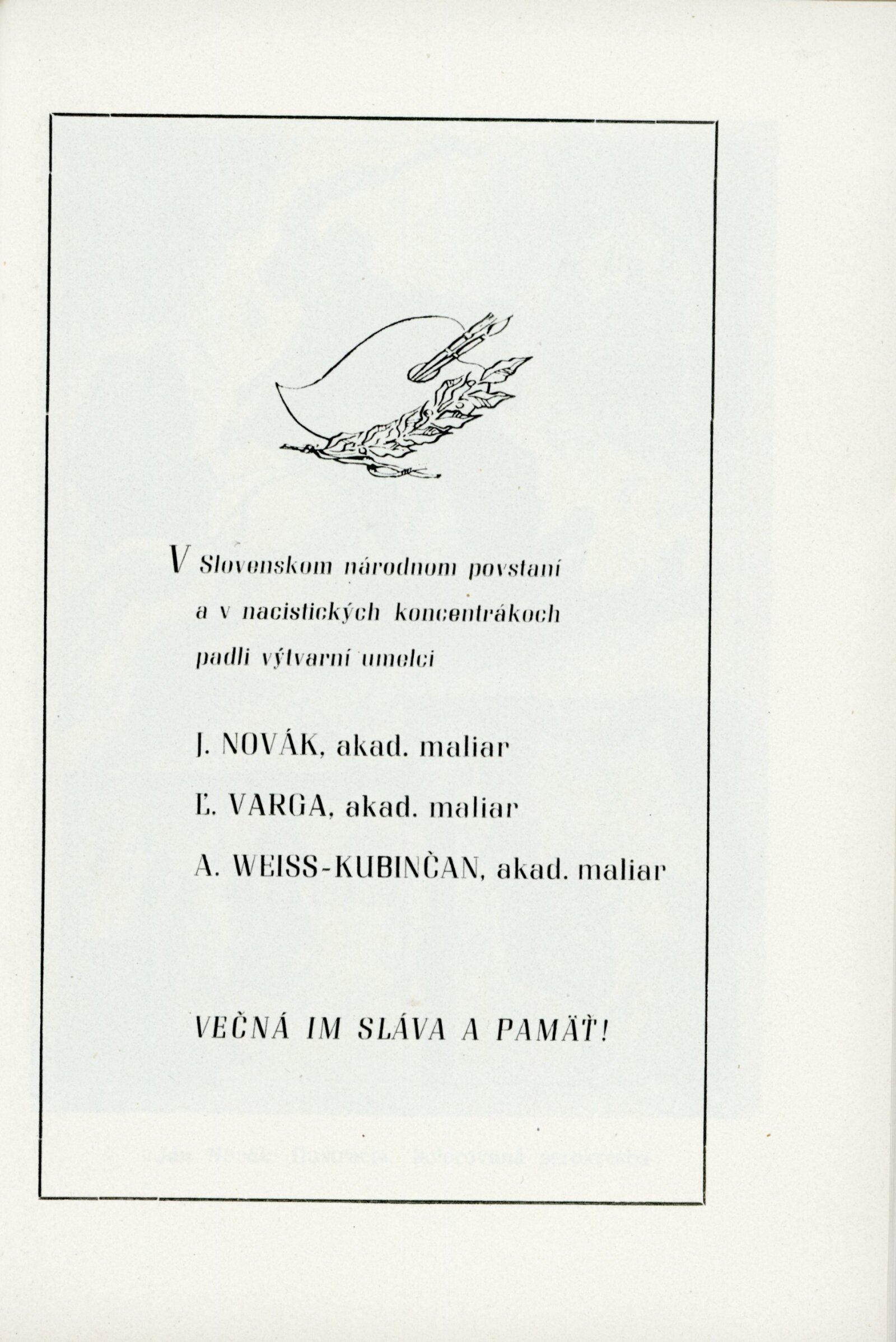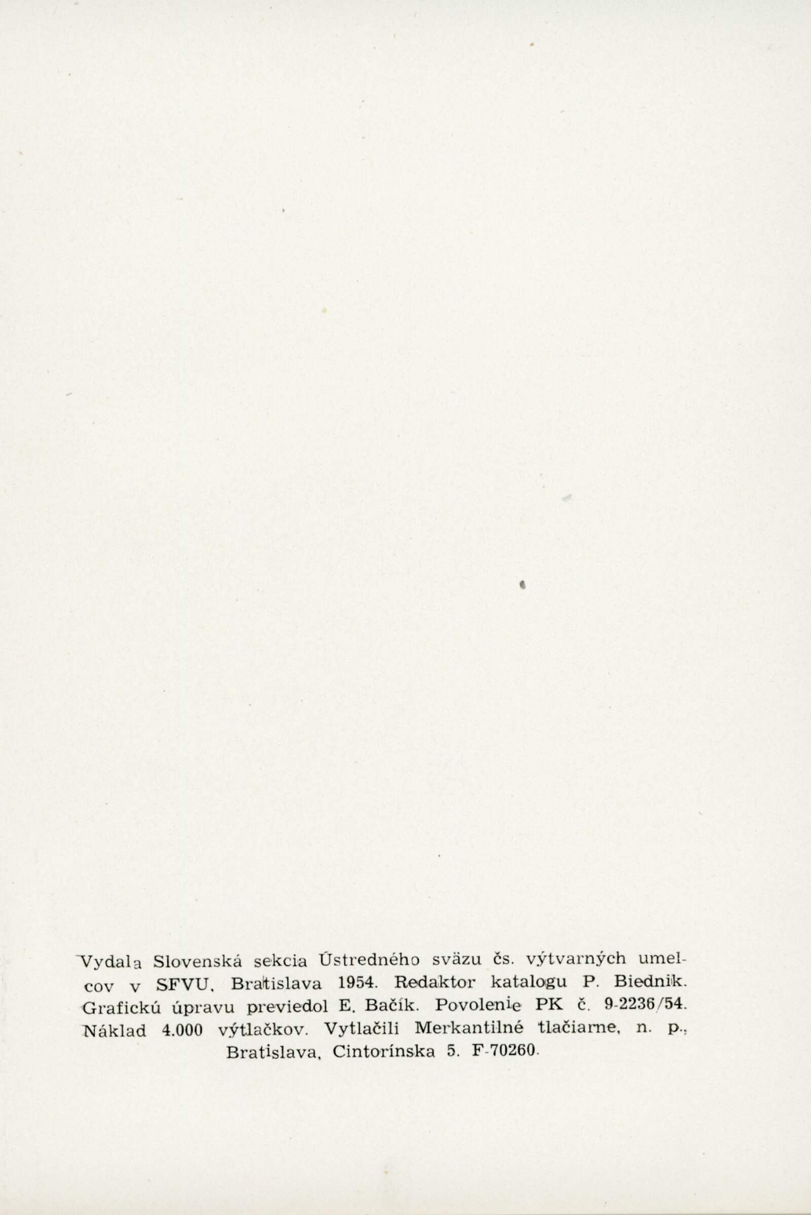Slovenské národní povstání v dokumentech a výtvarných dílech 1944–1954: Dům umění, 15. 10. – 7. 11. 1954 / Převzatý katalog. Slovenské národné povstanie vo výtvarnej tvorbe 1944–1954: Slovenská univerzita v Bratislavě, výstavní místnosti slovenské sekce ÚSČSVU, srpen–zaří 1954 / Texty: Andrej Sarvaš, Štefan Bednár, Karol Vaculík. – Bratislava: Slovenská sekce ÚSČSVU, 1954. – 86 s., obr., 4 s. seznam děl retrospektivní části výstavy, životní data vystavujících, DU 205. – MZK