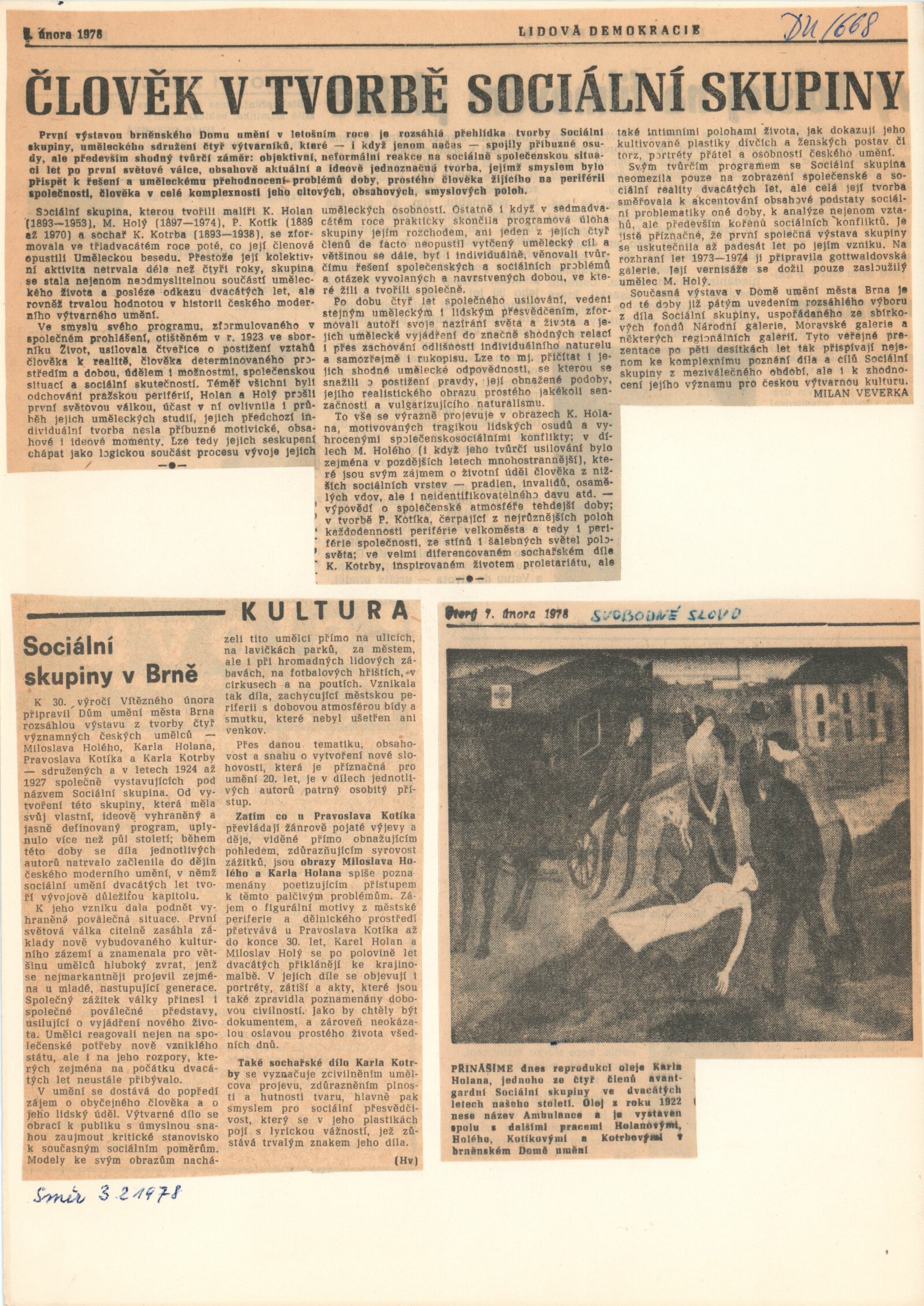 Sociální skupina. Výstava k 30. výročí Vítězného února: Dům umění města Brna, 20. 1. – 26. 2. 1978 / Text Michal Plánka. – Brno: DUmB, 1978. – 20 s., obr., seznam vystavených prací 3 s. Karel Holan, Miloslav Holý, Pravoslav Kotík, Karel Kotrba., životopisy, DU 668. – MZK