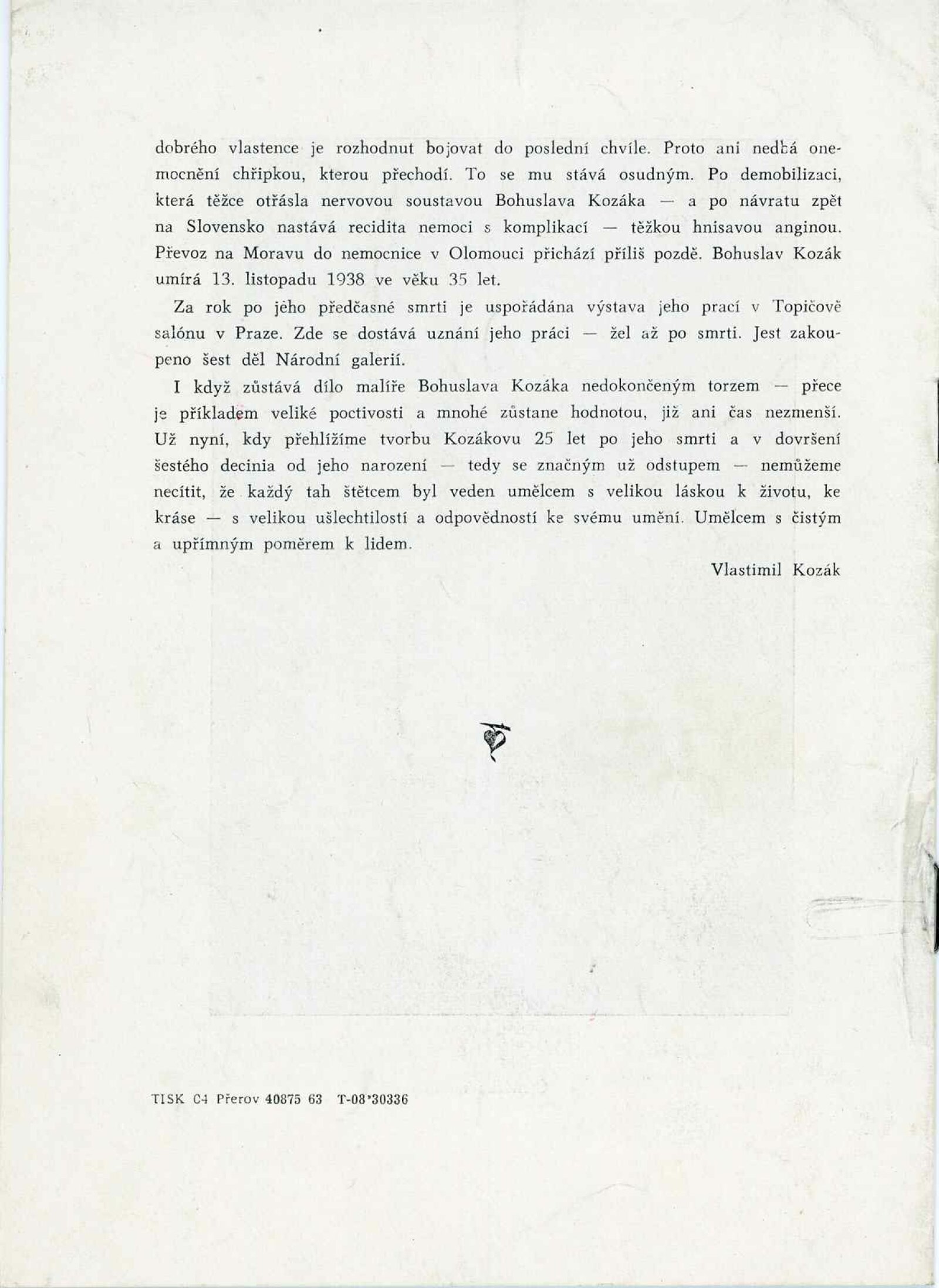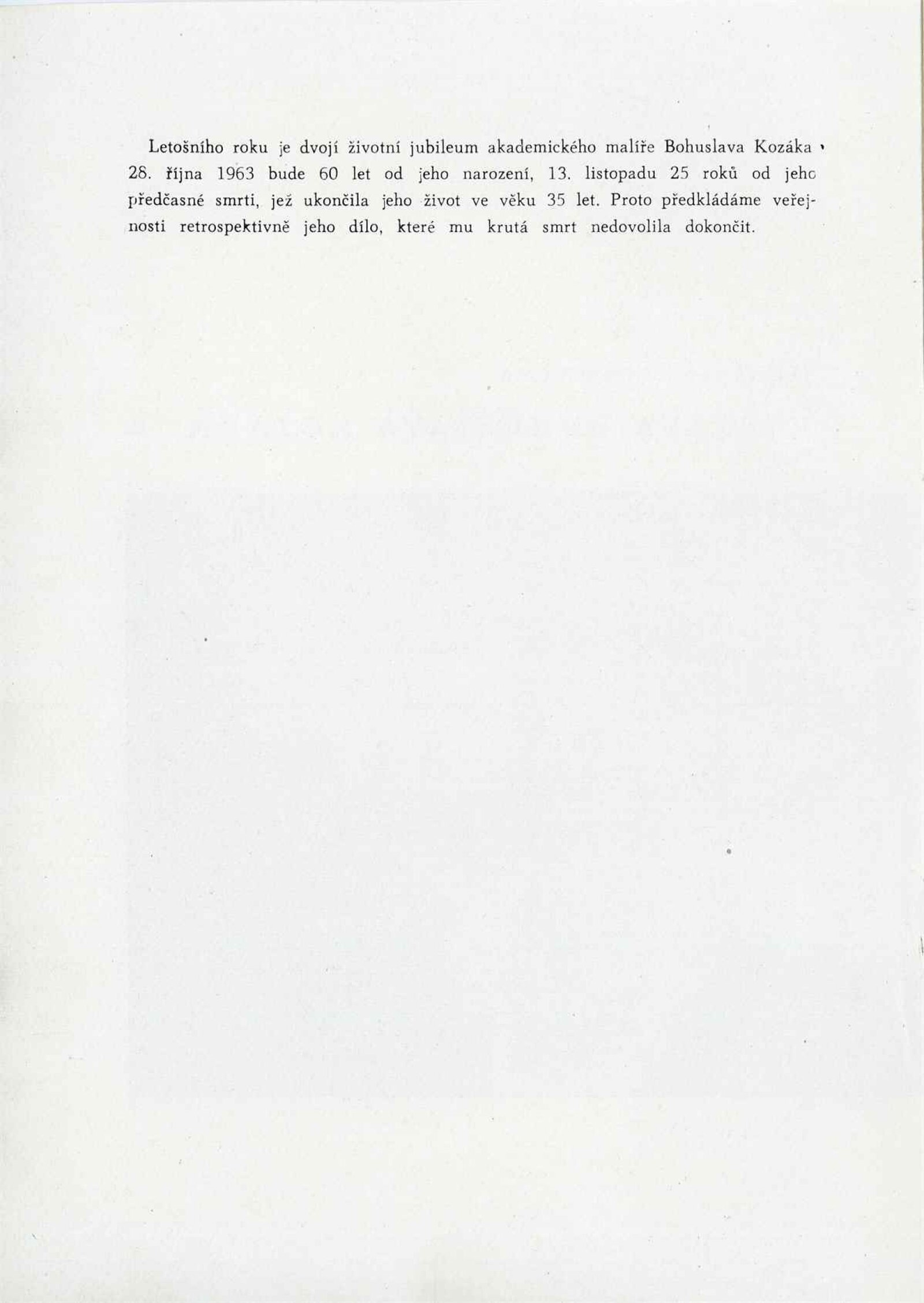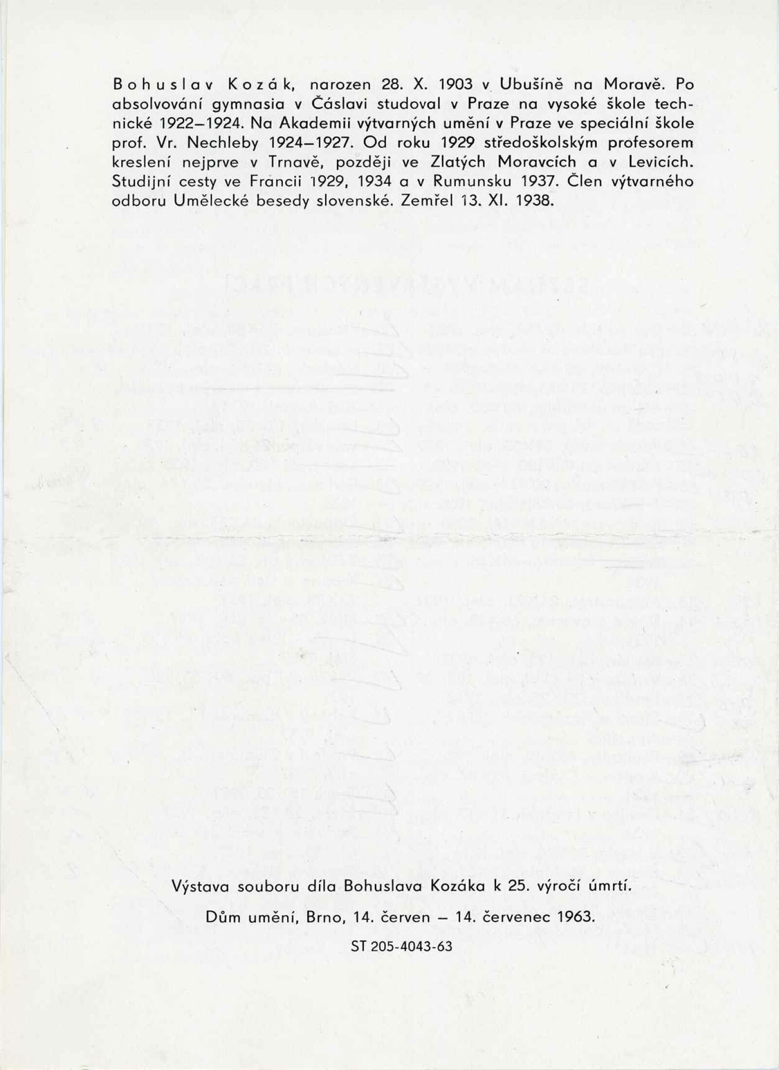 Soubor díla Bohuslava Kozáka: Dům umění města Brna / Dům pánů z Kunštátu, 1. patro, 14. 6. – 25. 7. 1963 / Text: J. L. Nerad. – Brno: DUmB, 1963. – 4 s., obr., DPK 193. – MG
