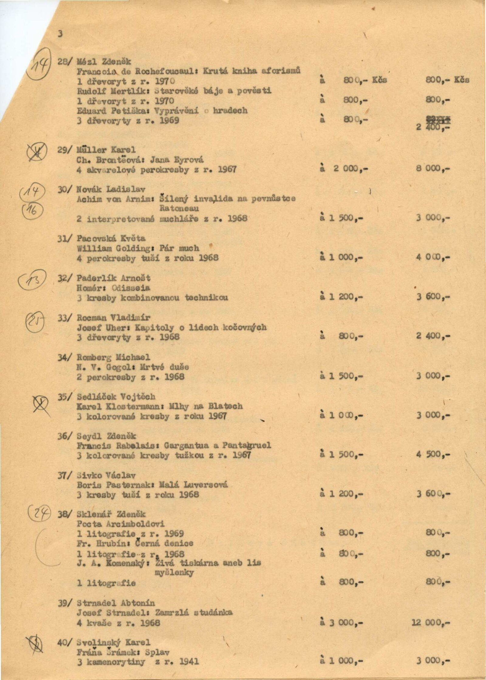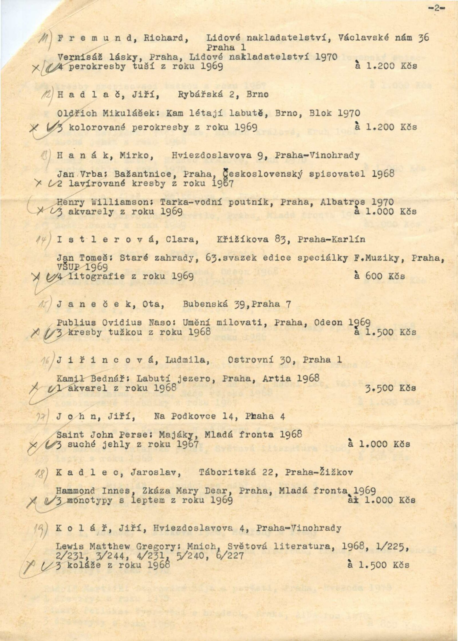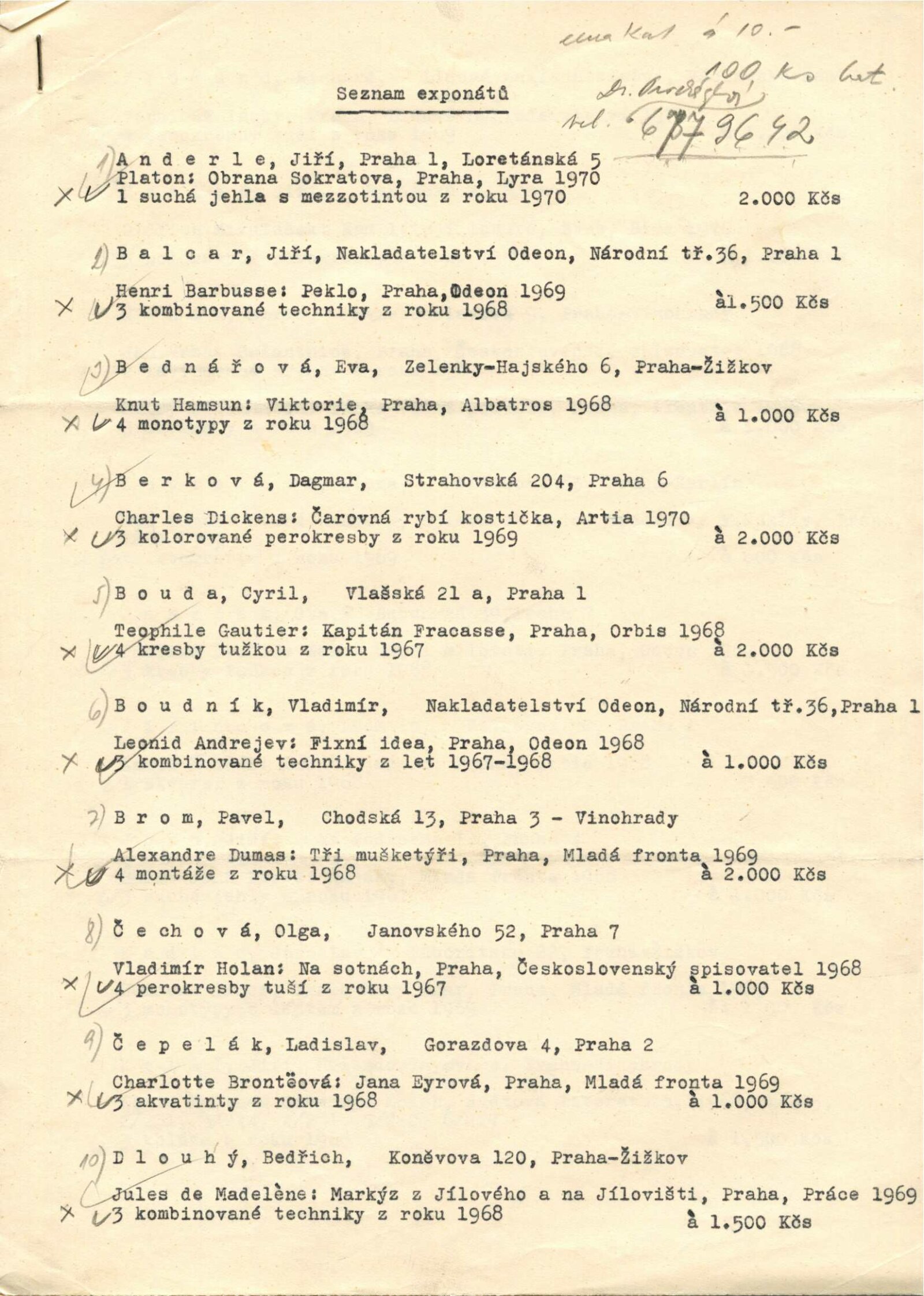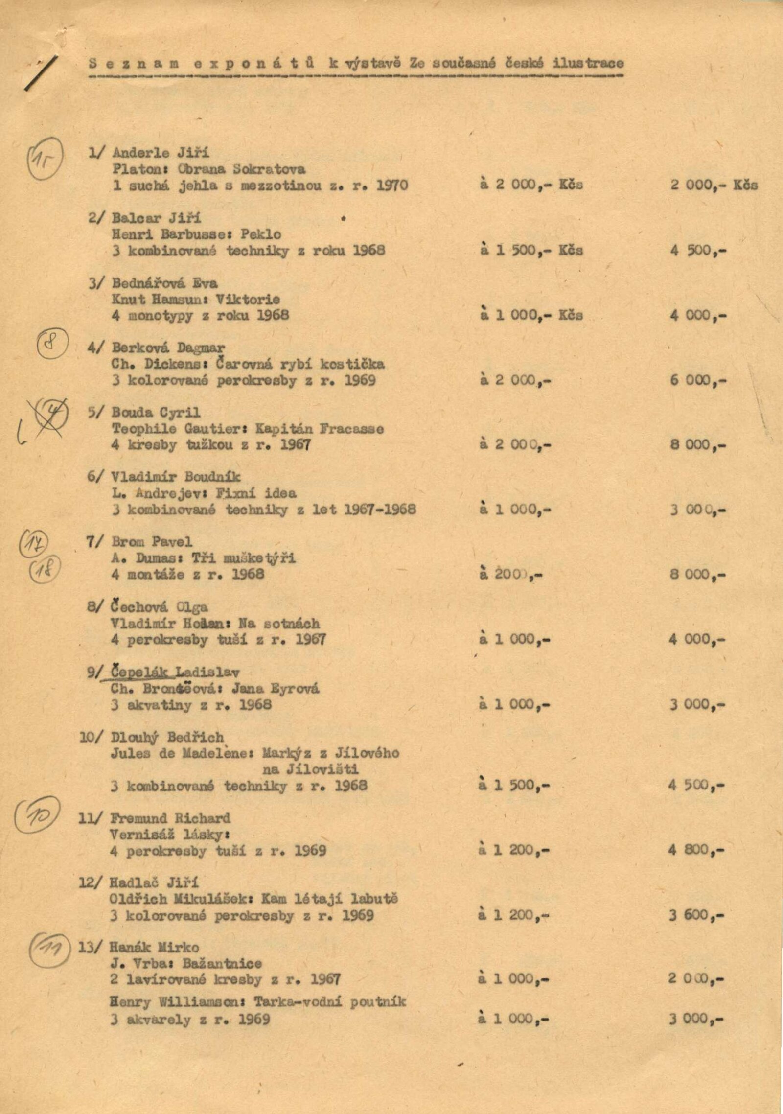 Výstava ze současné české ilustrace: Dům umění města Brna / Dům pánů z Kunštátu, 10. 9. – 3. 10. 1971 / Převzatý katalog. Výstava ze současné české ilustrace 1968–1970: Strahov, Praha, červenec–září 1971 / Text: Jana Procházková. – Praha-Strahov: Památník národního písemnictví, 1971. – 40 s., obr., životní data vystavujících, DPK 477. – MG