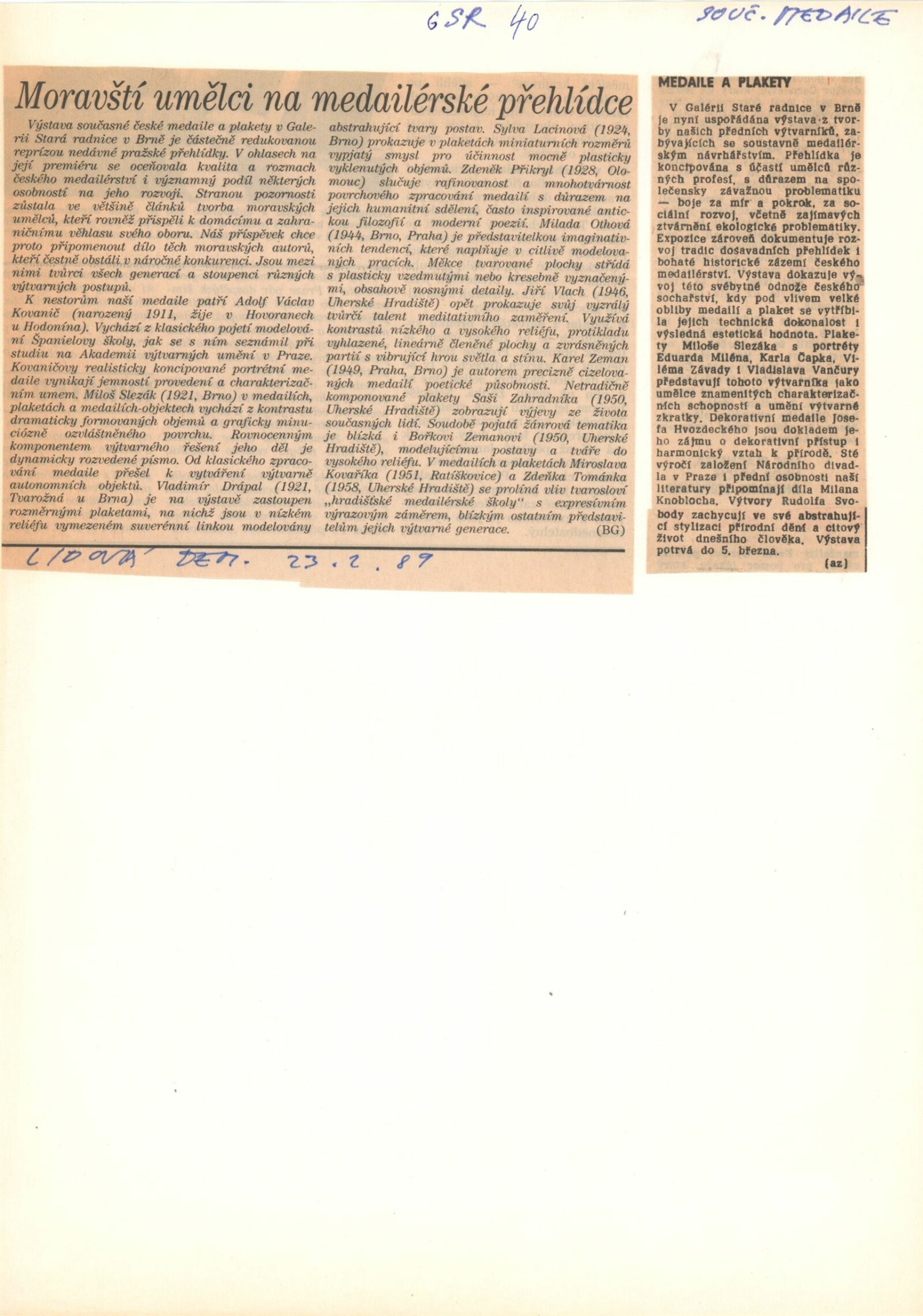 Současná česká medaile a plaketa. Přehlídka prací z let 1979–1986: Galerie Stará radnice, přízemí, 24. 1. – 5. 3. 1989 / Převzatý katalog. Současná česká medaile a plaketa: výstavní síň Mánes, Praha, 13. 10. – 8. 11. 1987 / Text: Václav Procházka. – Praha: SČVU, 1987. – [142] s., obr., seznam medailí, životní data vystavujících, GSR 40