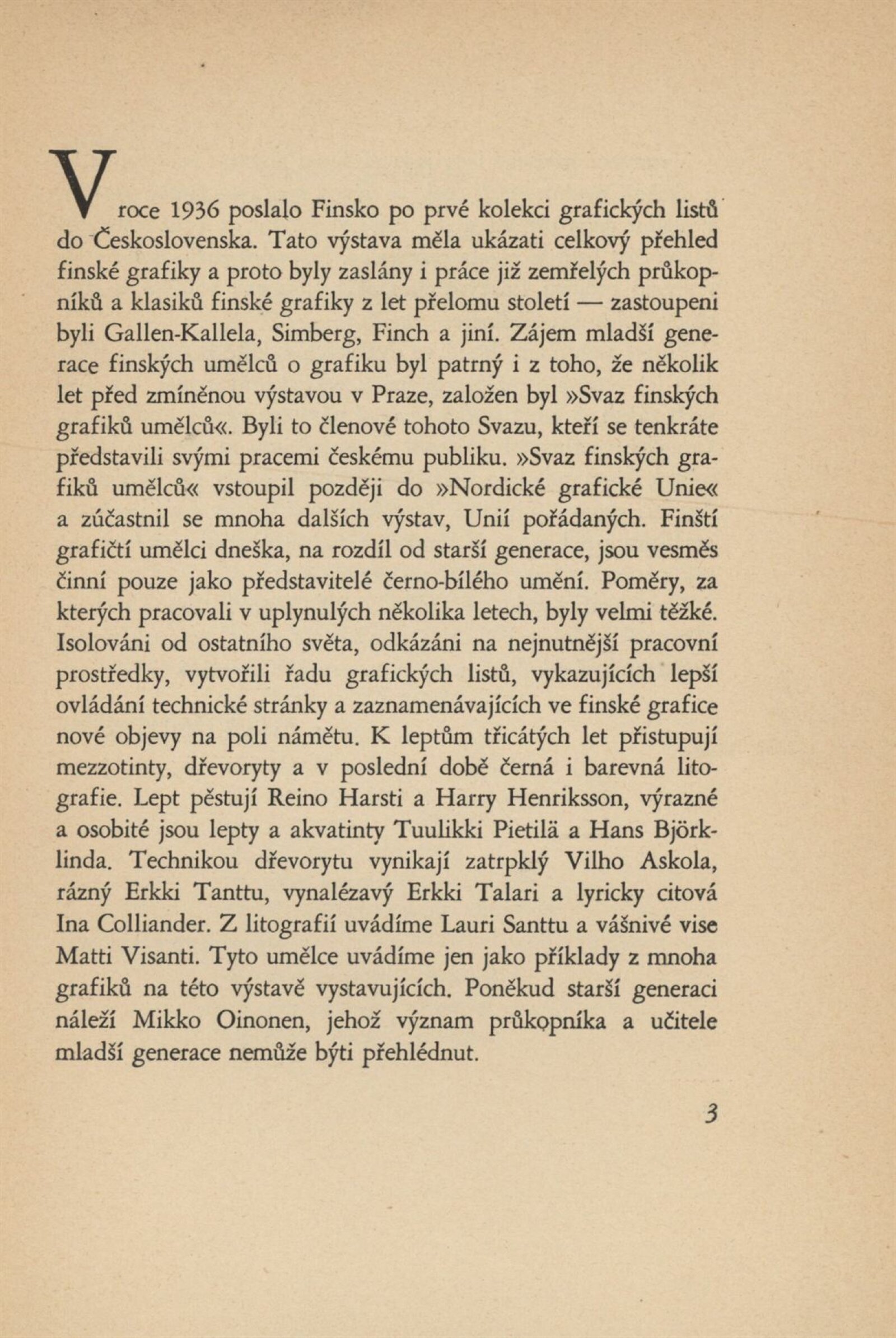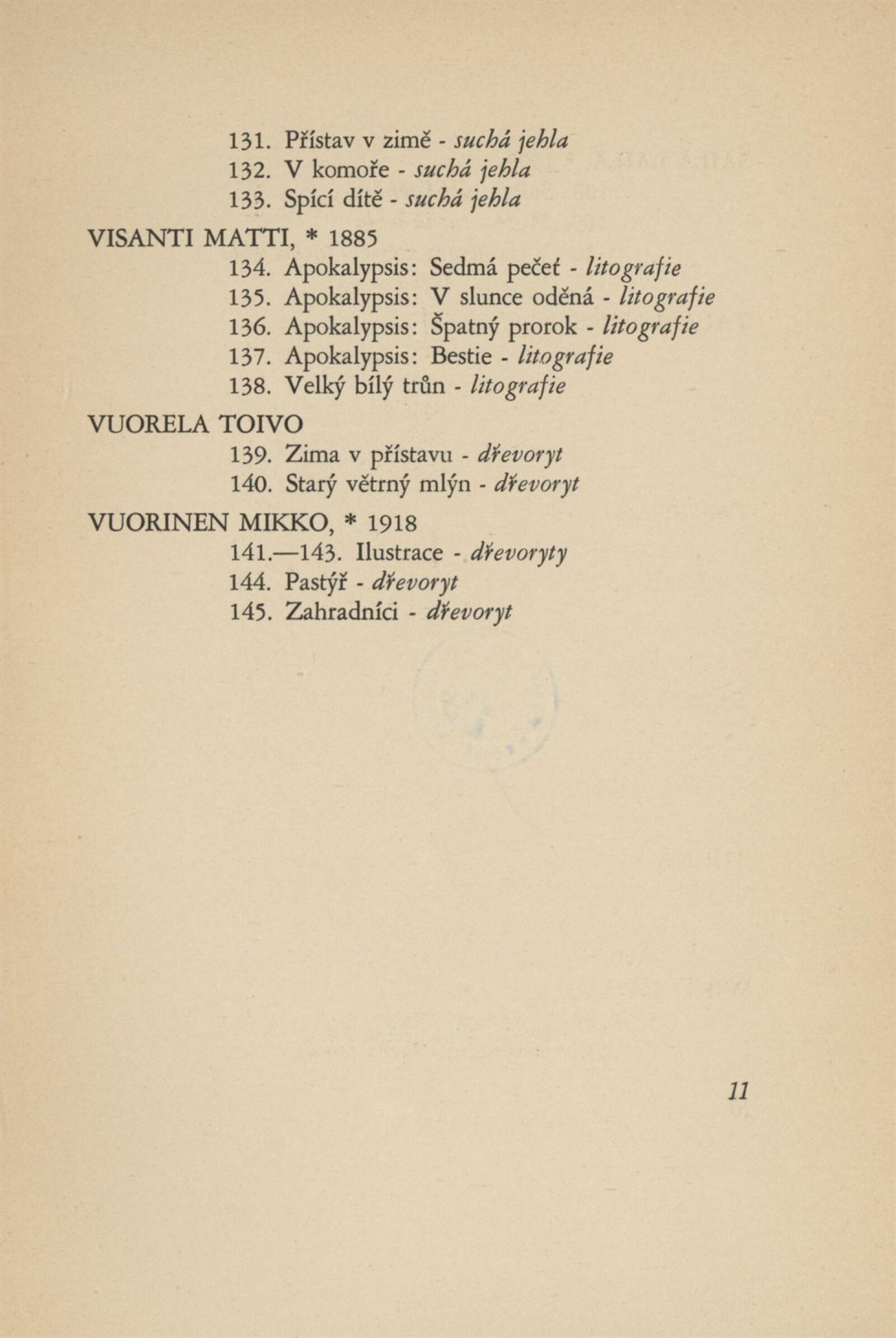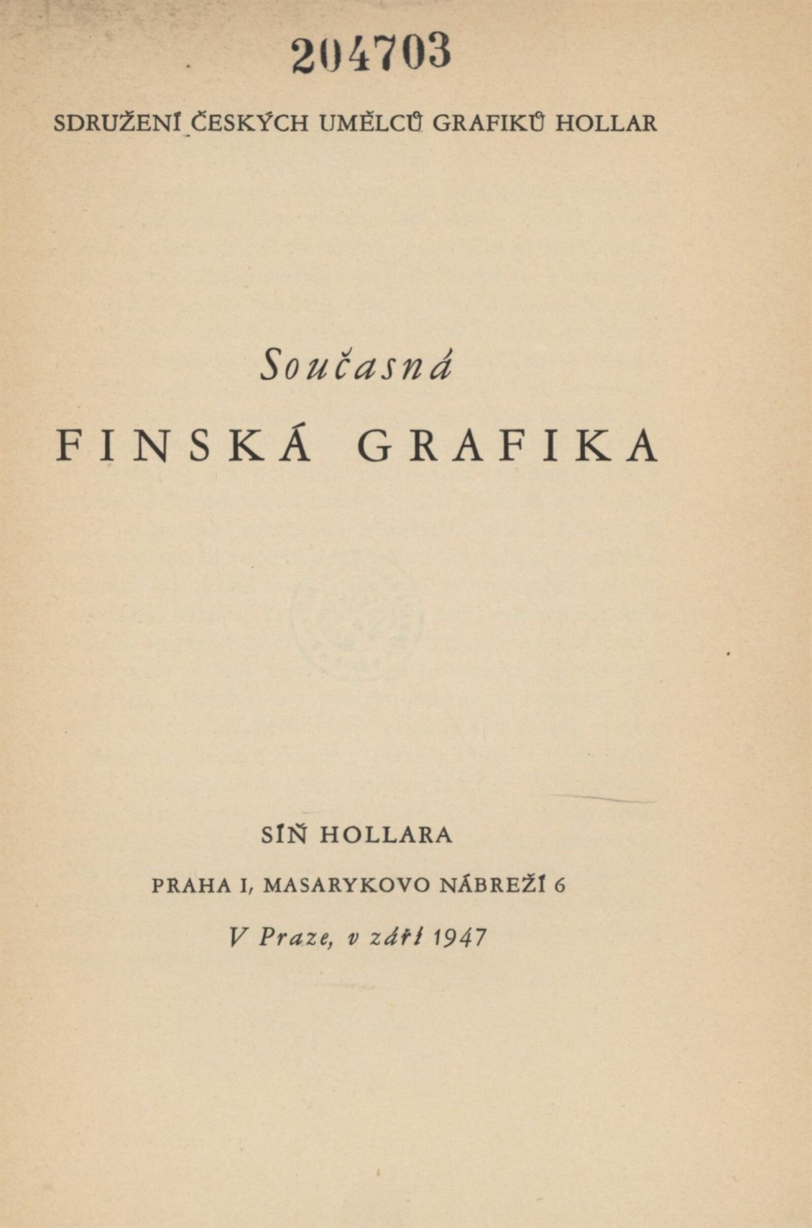 Současná finská grafika: Dům umění, 9. 6. – 11. 7. 1948 / Převzatý katalog. Současná finská grafika: Síň Hollara, Praha, září 1947 / Text: Aune Lendström. – Praha: Sdružení českých umělců grafiků Hollar, 1947 – 11 s., obr. příl. 4 s., DU 80. – MZK