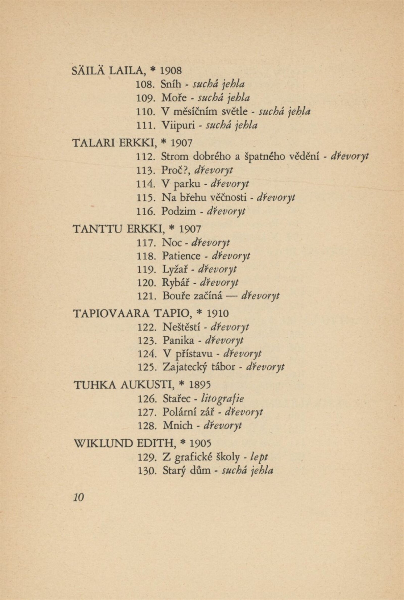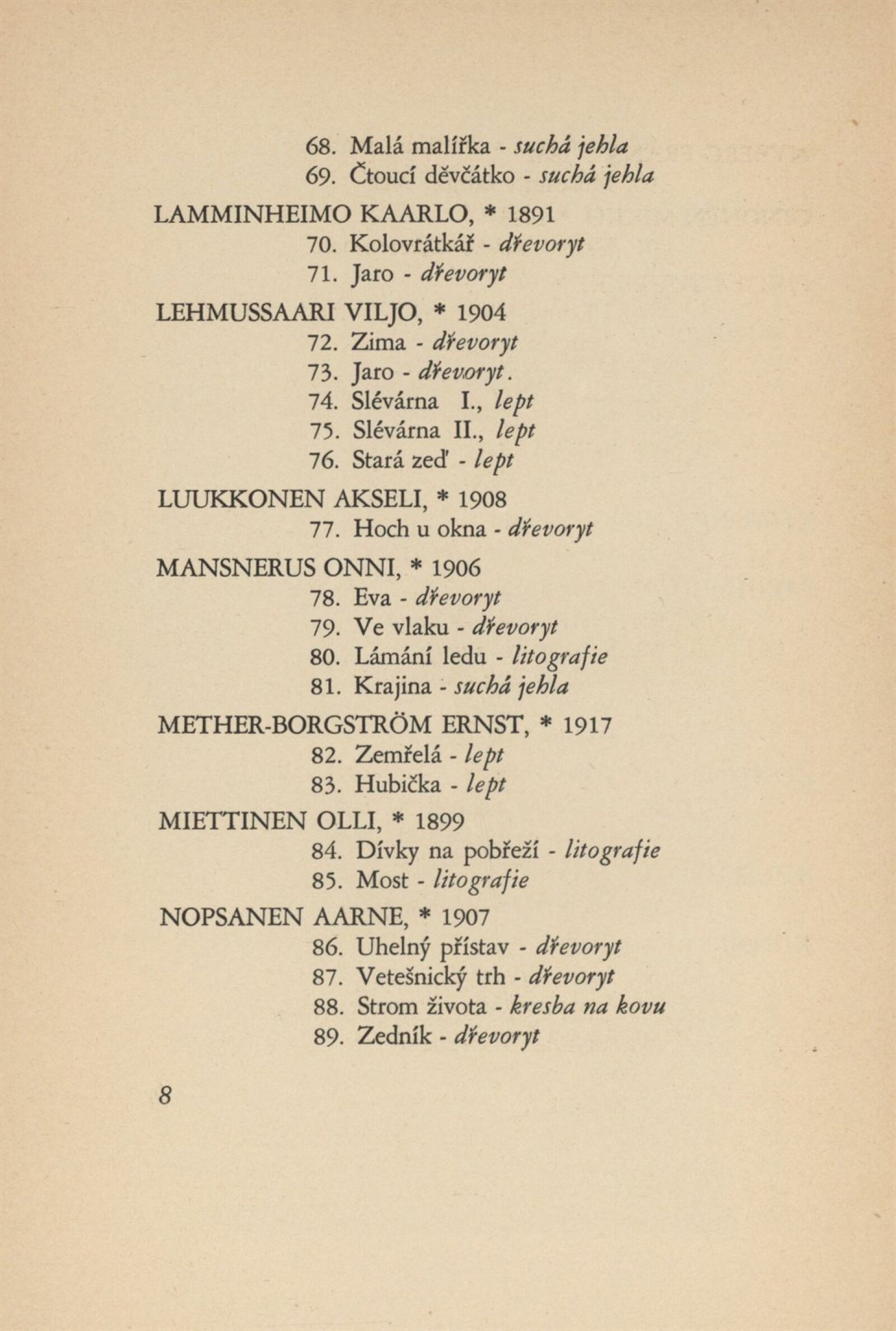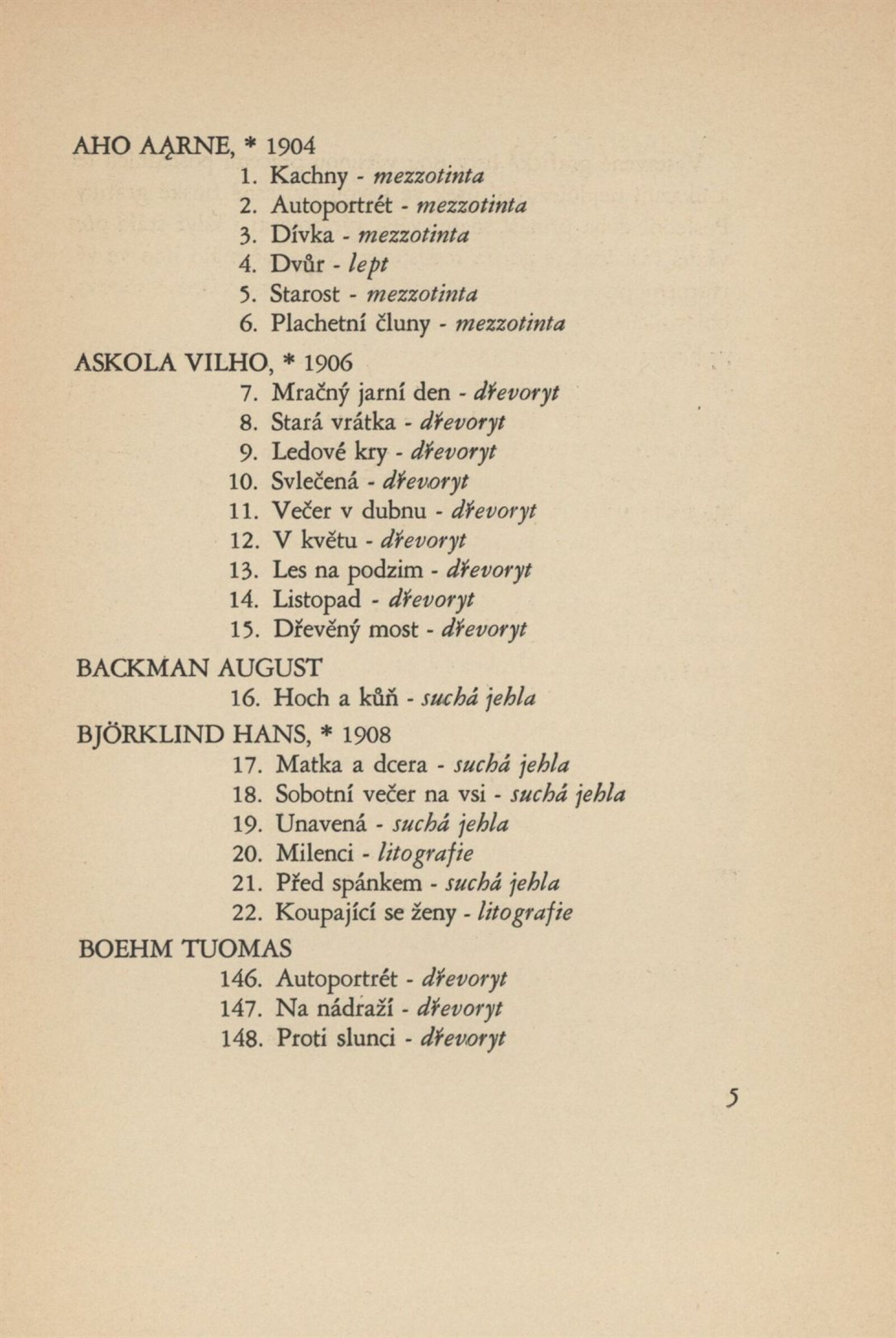 Současná finská grafika: Dům umění, 9. 6. – 11. 7. 1948 / Převzatý katalog. Současná finská grafika: Síň Hollara, Praha, září 1947 / Text: Aune Lendström. – Praha: Sdružení českých umělců grafiků Hollar, 1947 – 11 s., obr. příl. 4 s., DU 80. – MZK
