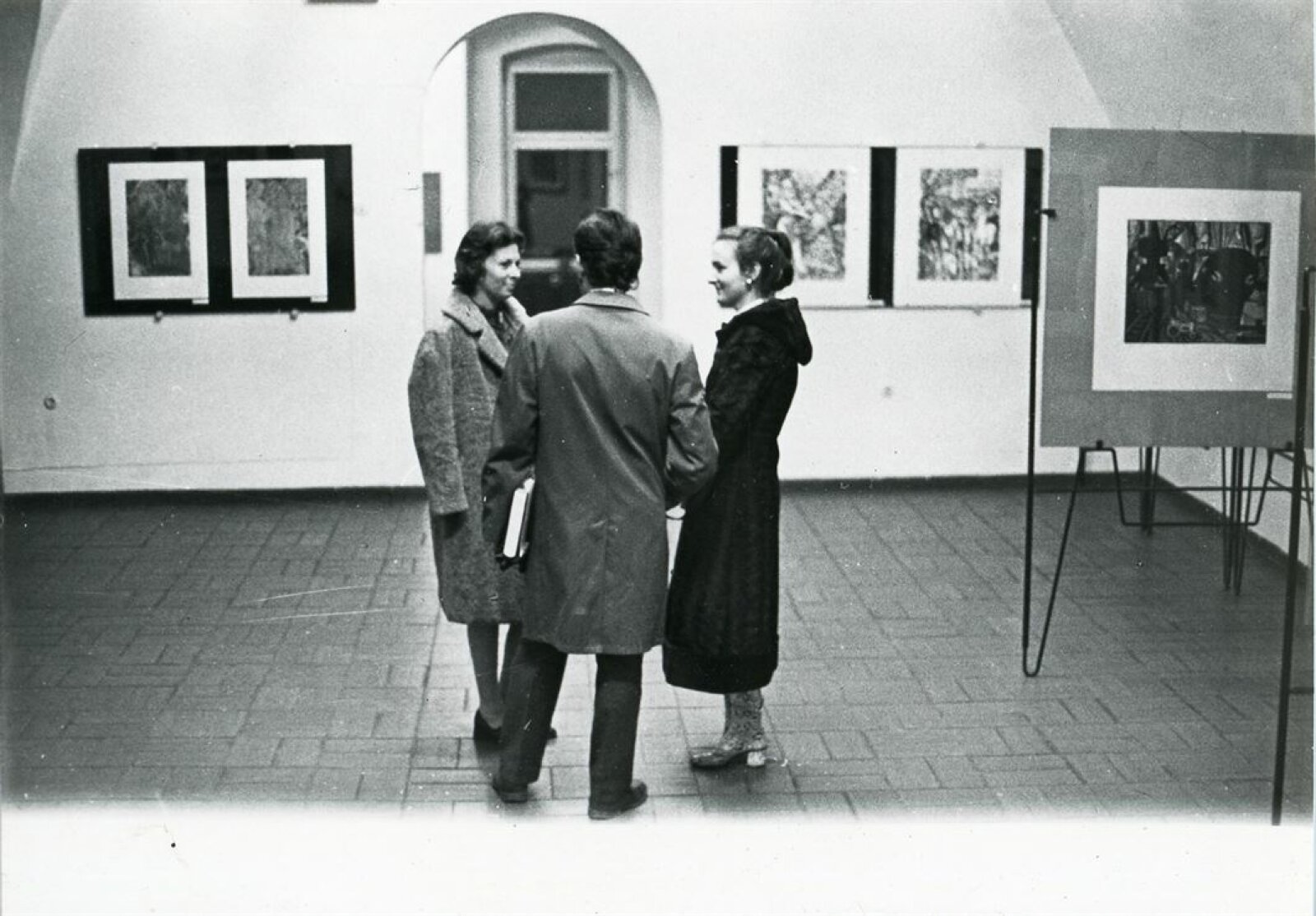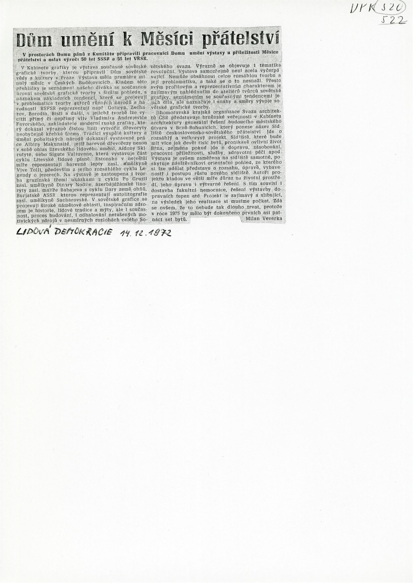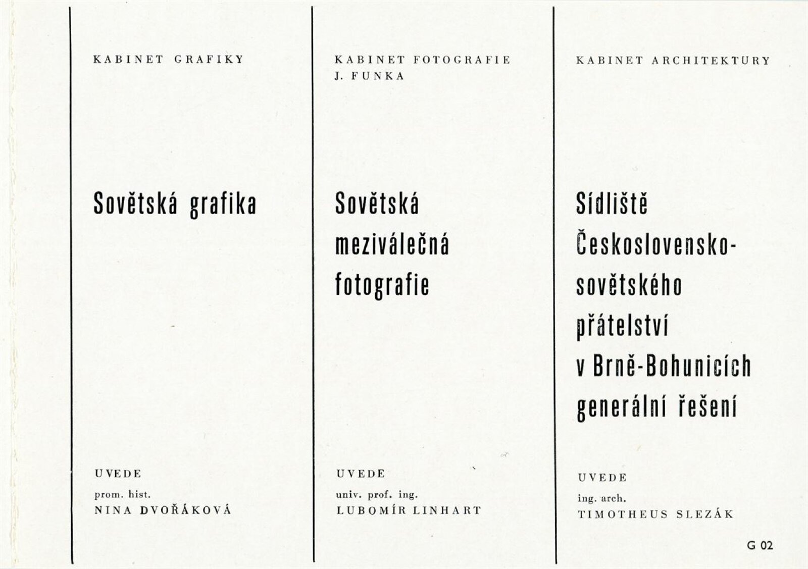 pozvánka, katalog, seznam autorů a vystavených prací, text katalogu, fotografie vernisáže a instalace, provozní korespondence, žádost o povolení tisku katalogu, nabídka výstavy z Domu sovětské vědy a kultury v Praze, recenze v tisku