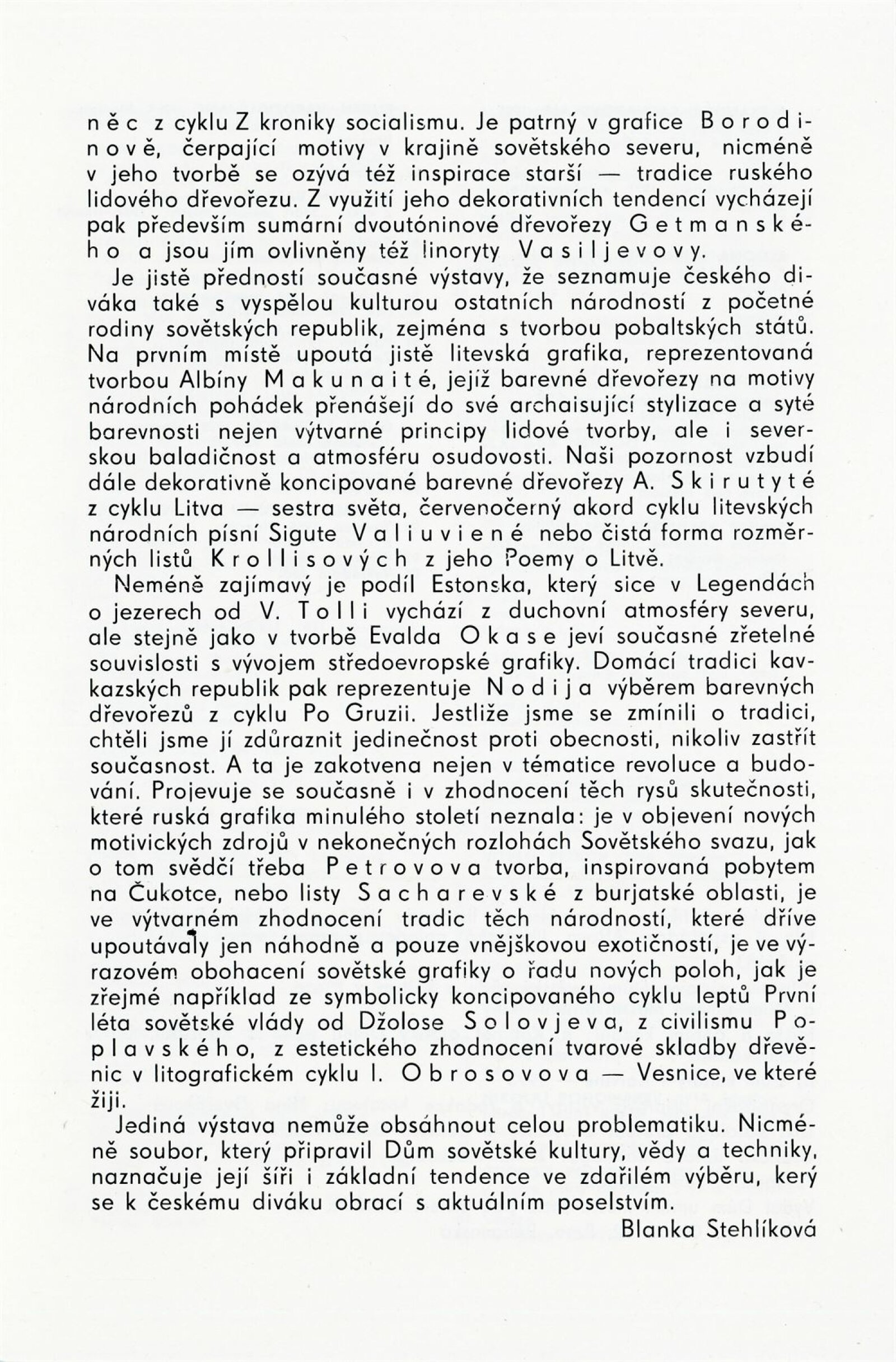 Současná sovětská grafika: Dům umění města Brna / Dům pánů z Kunštátu, 129. výstava Kabinetu grafiky, 12. 12. 1972 – 1. 1. 1973 / Text: Blanka Stehlíková. – Brno: DUmB, 1972. – skládačka, 6 s., obr., DPK 520. – MG