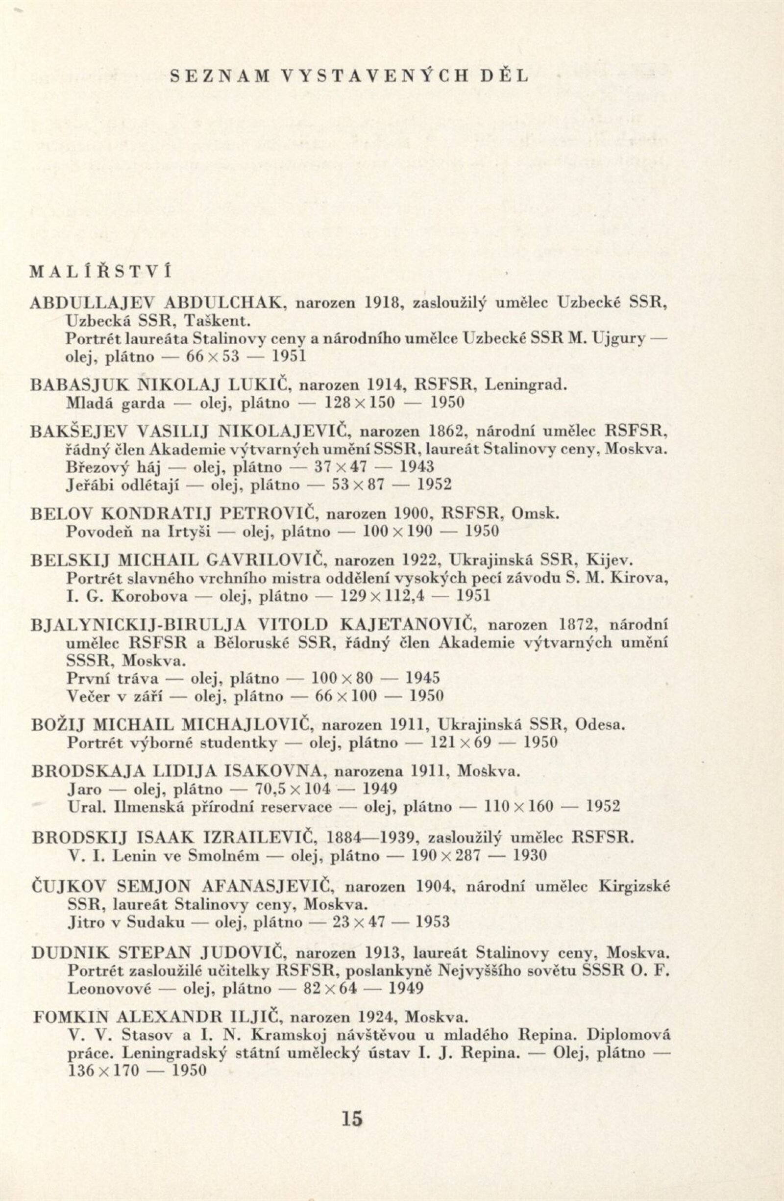 Výstava současného výtvarného umění SSSR: Dům umění města Brna, 11. 4. – 5. 5. 1954 / Převzatý katalog. Výstava současného výtvarného umění SSSR: Jízdárna pražského hradu, leden–únor 1954 / Text: Karel Pokorný. – Praha: Ministerstvo kultury, 1954. – 23 s., 22 s. obr. příl., DU 197. – MZK