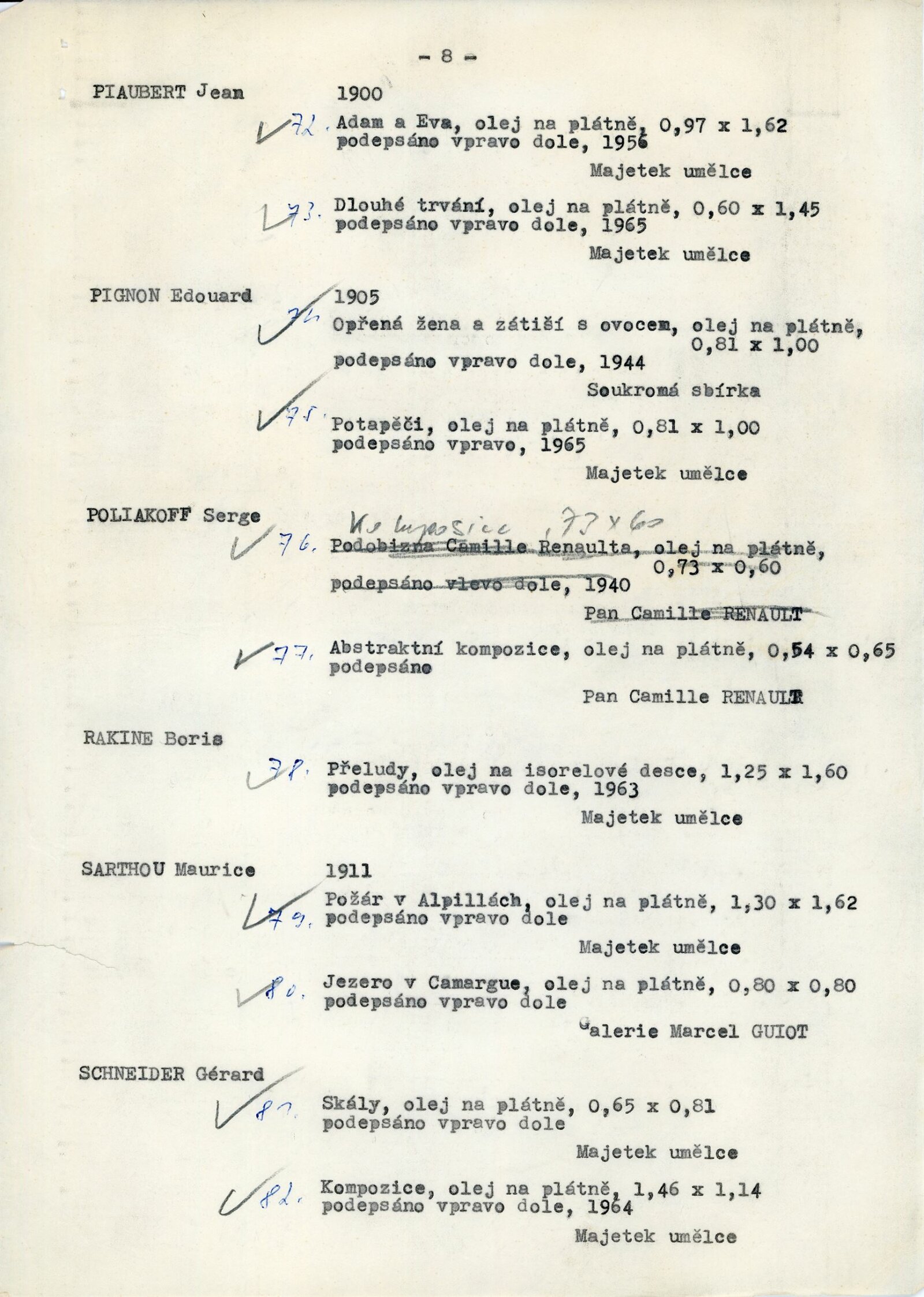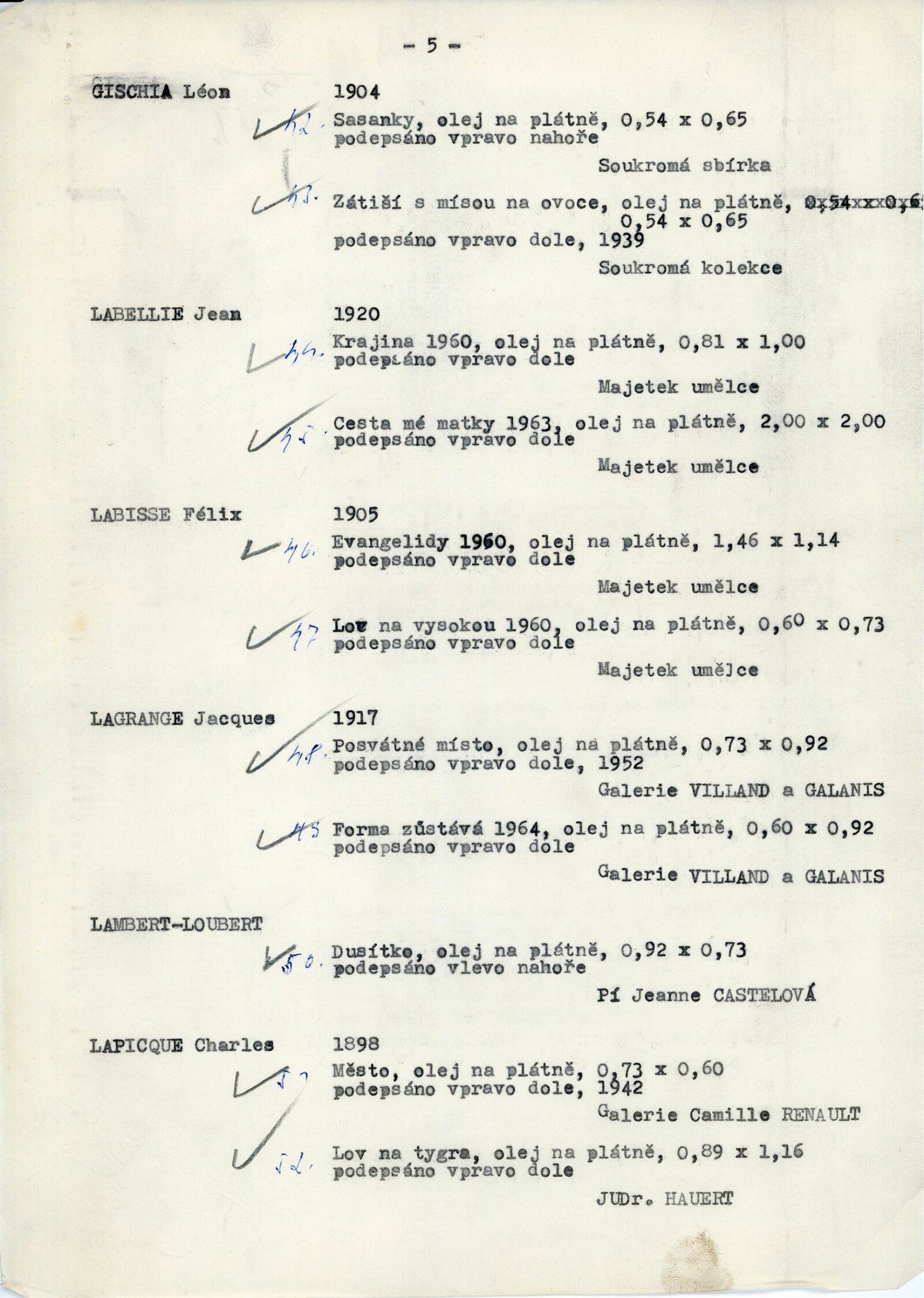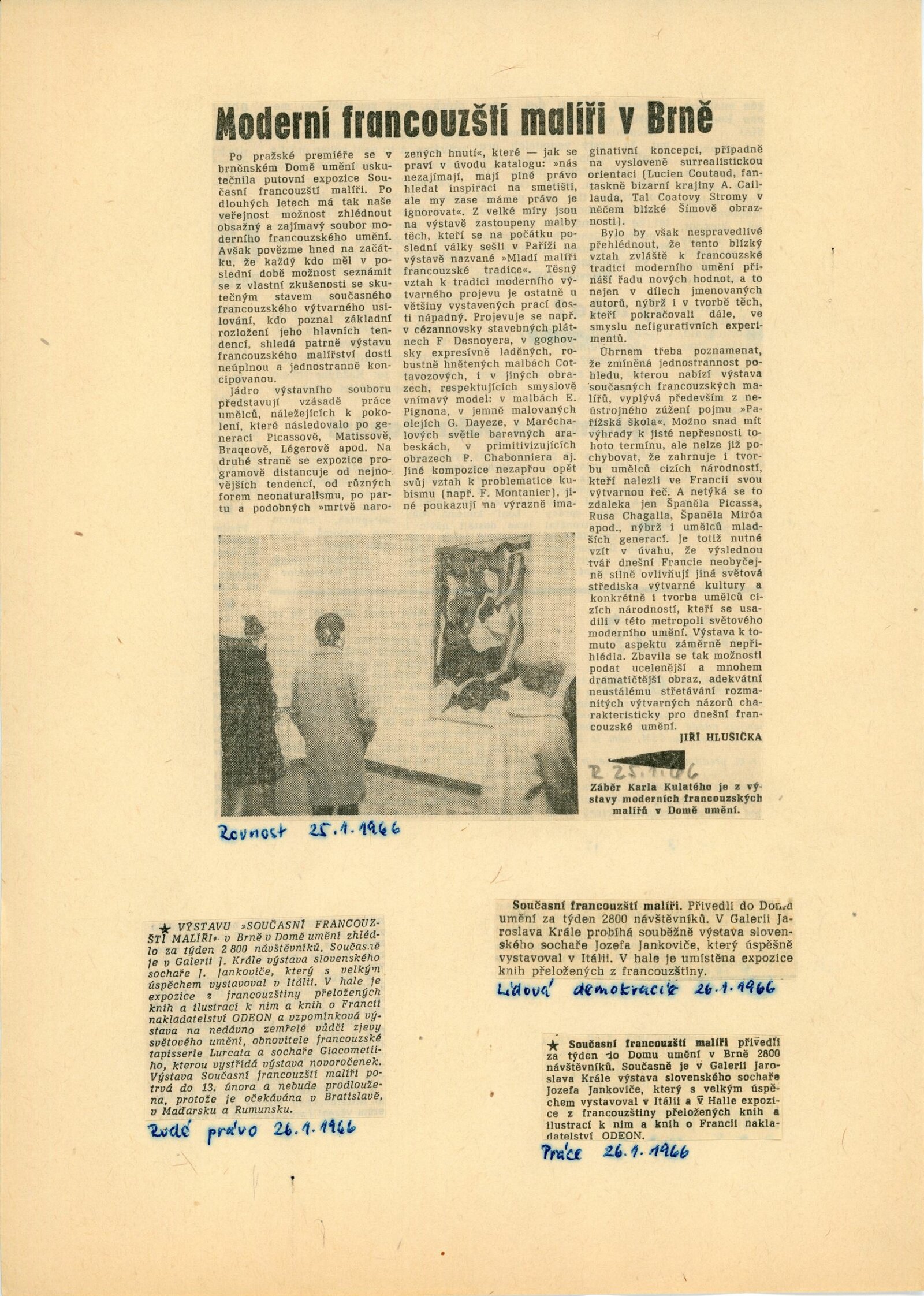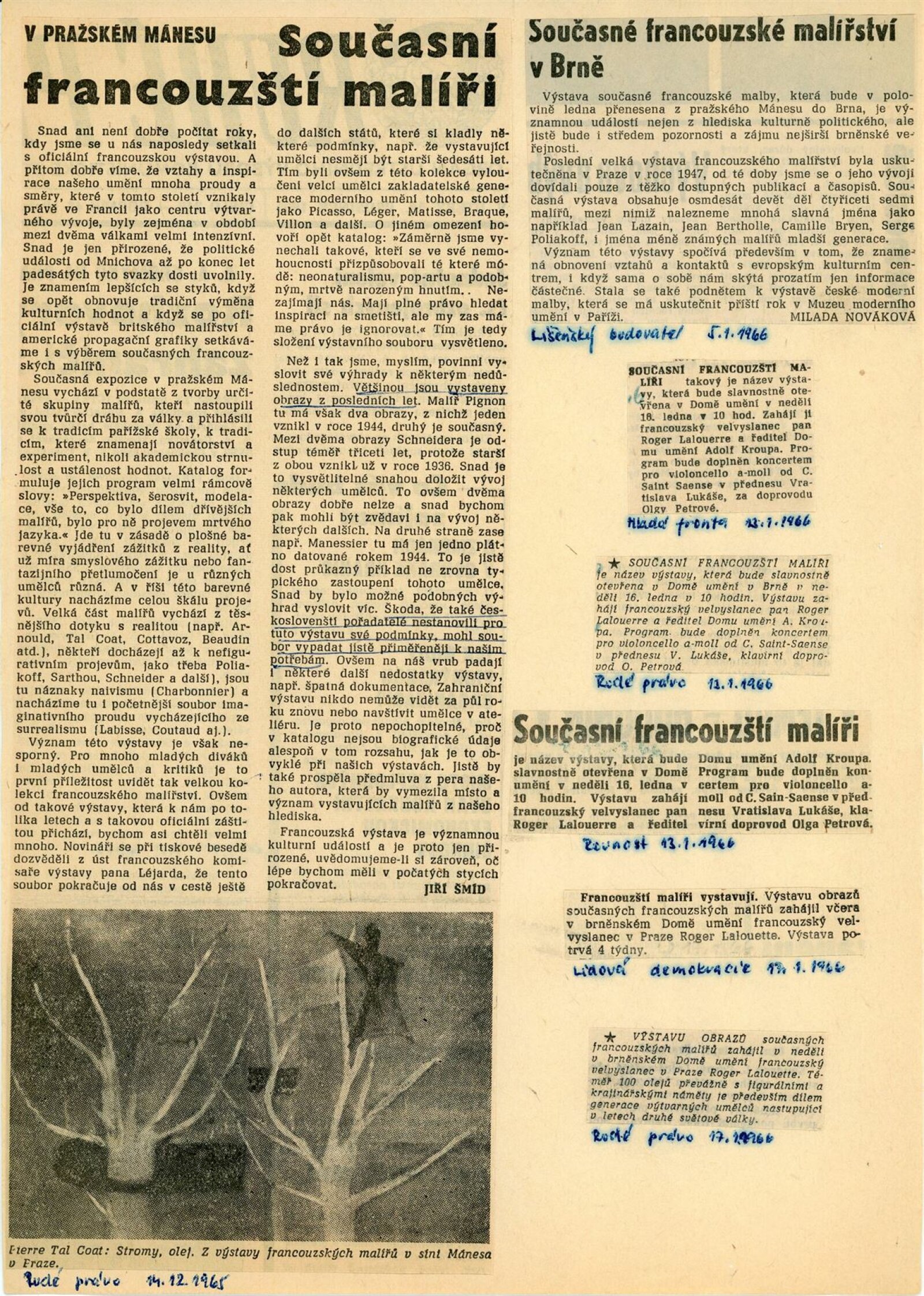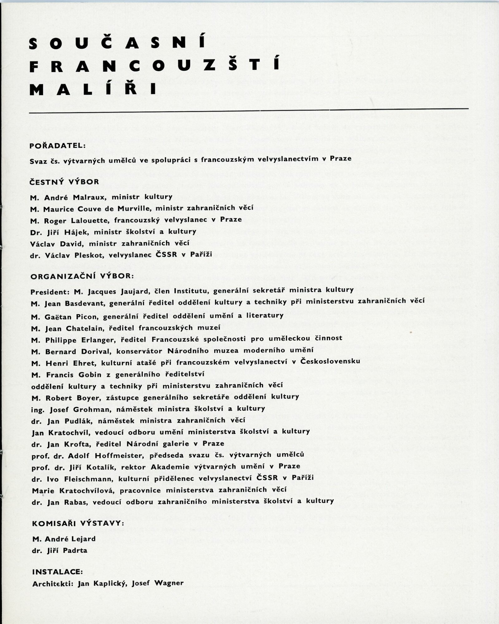 Současní francouzští malíři: Dům umění, 1. patro, 16. 1. – 13. 2. 1966 / Převzatý katalog. Současní francouzští malíři: Mánes, Praha, 26. 11. 1965 – 9. 1. 1966 / Text: André Lejard. – Praha: SČSVU, 1965. – 14 s., obr., seznam vystavených děl 4 s., DU 450. – MG