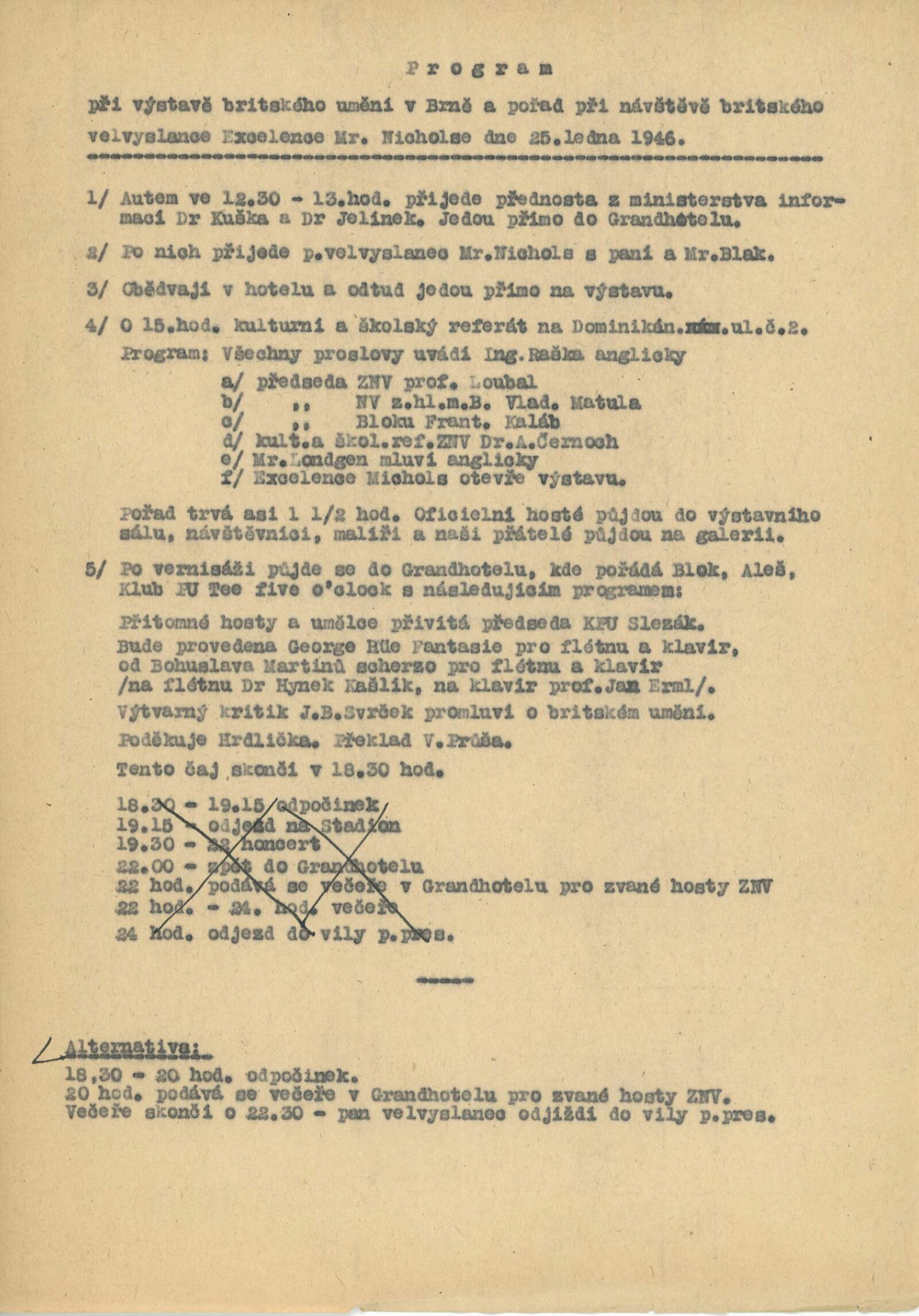 pozvánka, katalog, seznam umělců a prací, zpráva o výstavě (zdůvodnění umístění výstavy v prostorách Kulturního a školského referátu NV Brno na Dominikánské ul.), program vernisáže (projev V. Matuly, A. Černocha, glosy J. B. Svrčka), zápis ze schůzky z dne 25. 1. 1946 mezi zástupci tisku, Bloku, referátu školství a osvěty a A. A. Longenem (ředitelem oddělení krásných umění v Britské radě), provozní korespondence