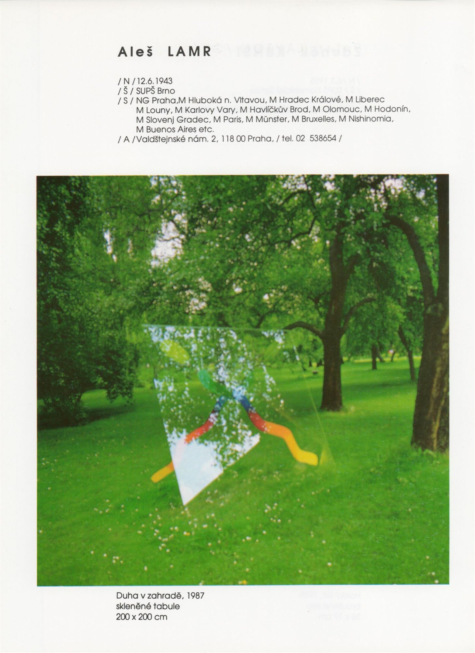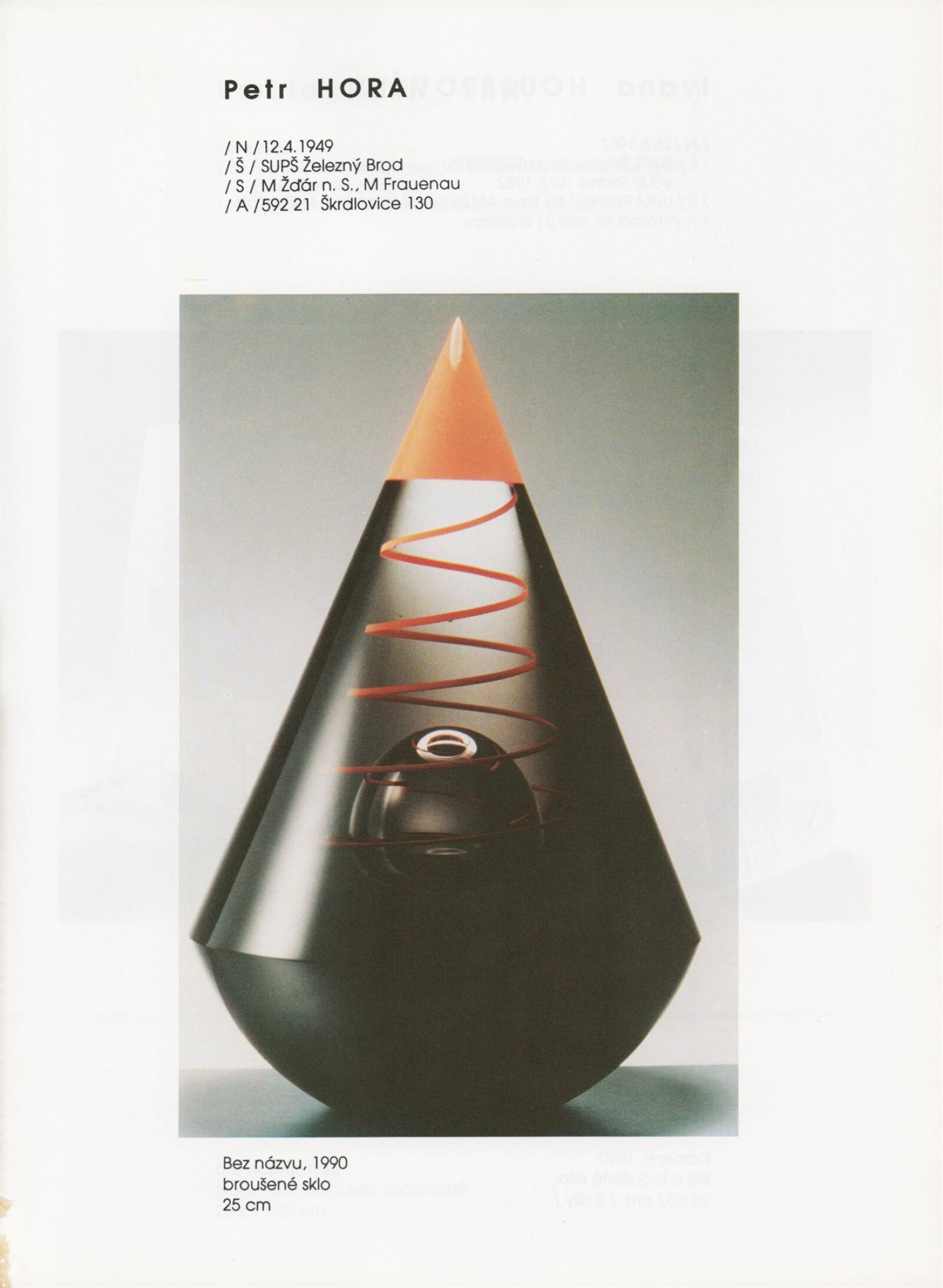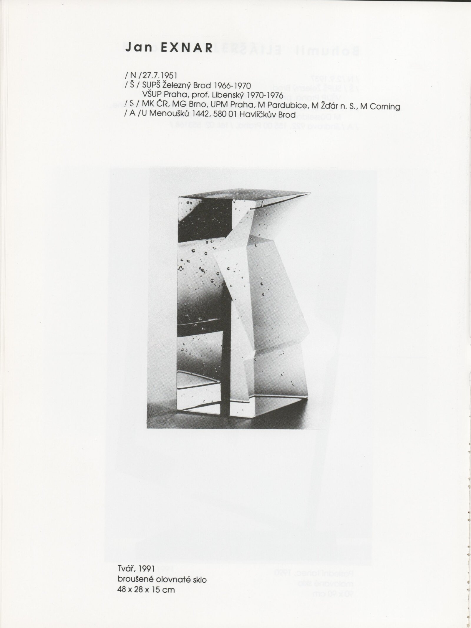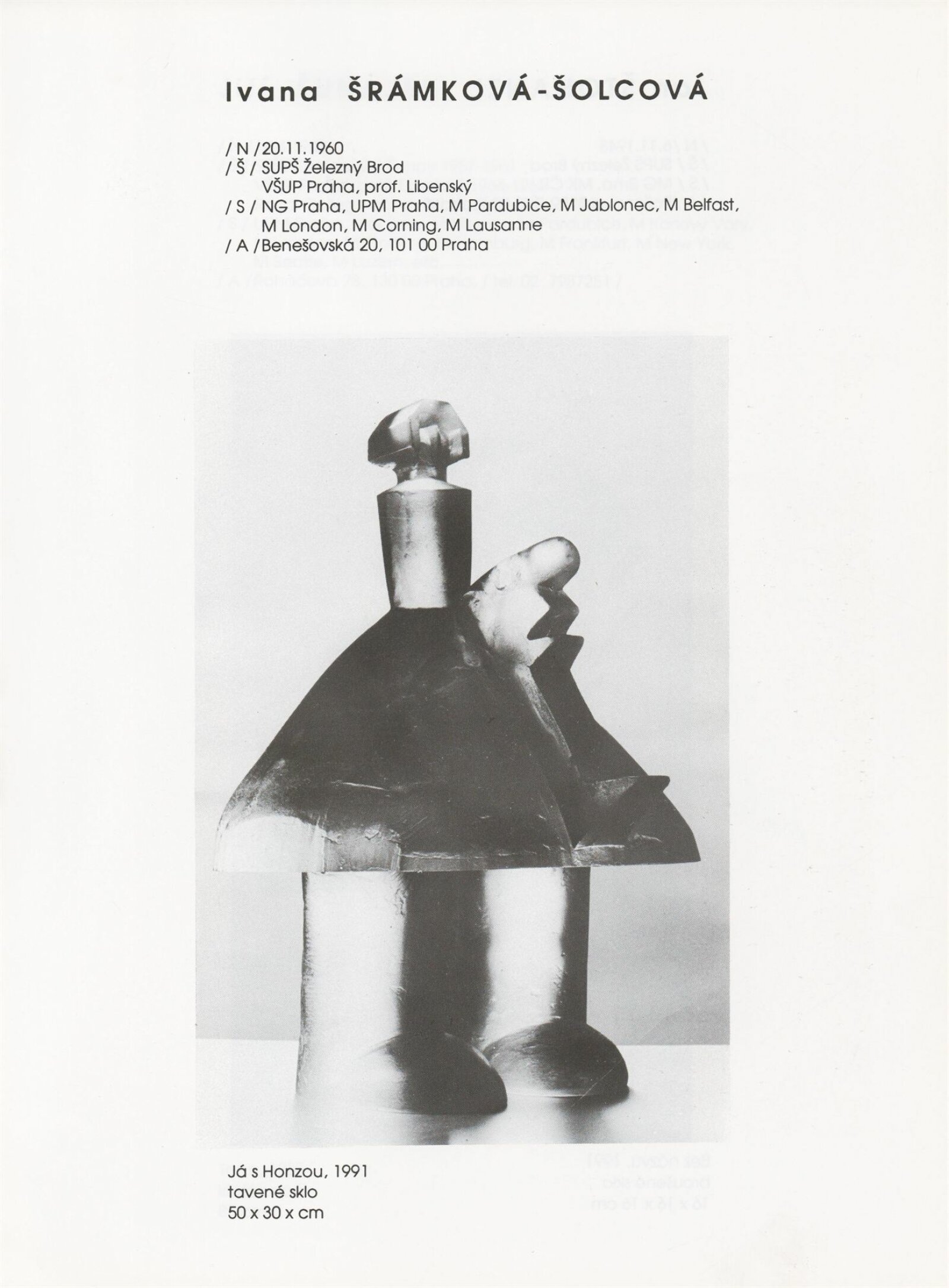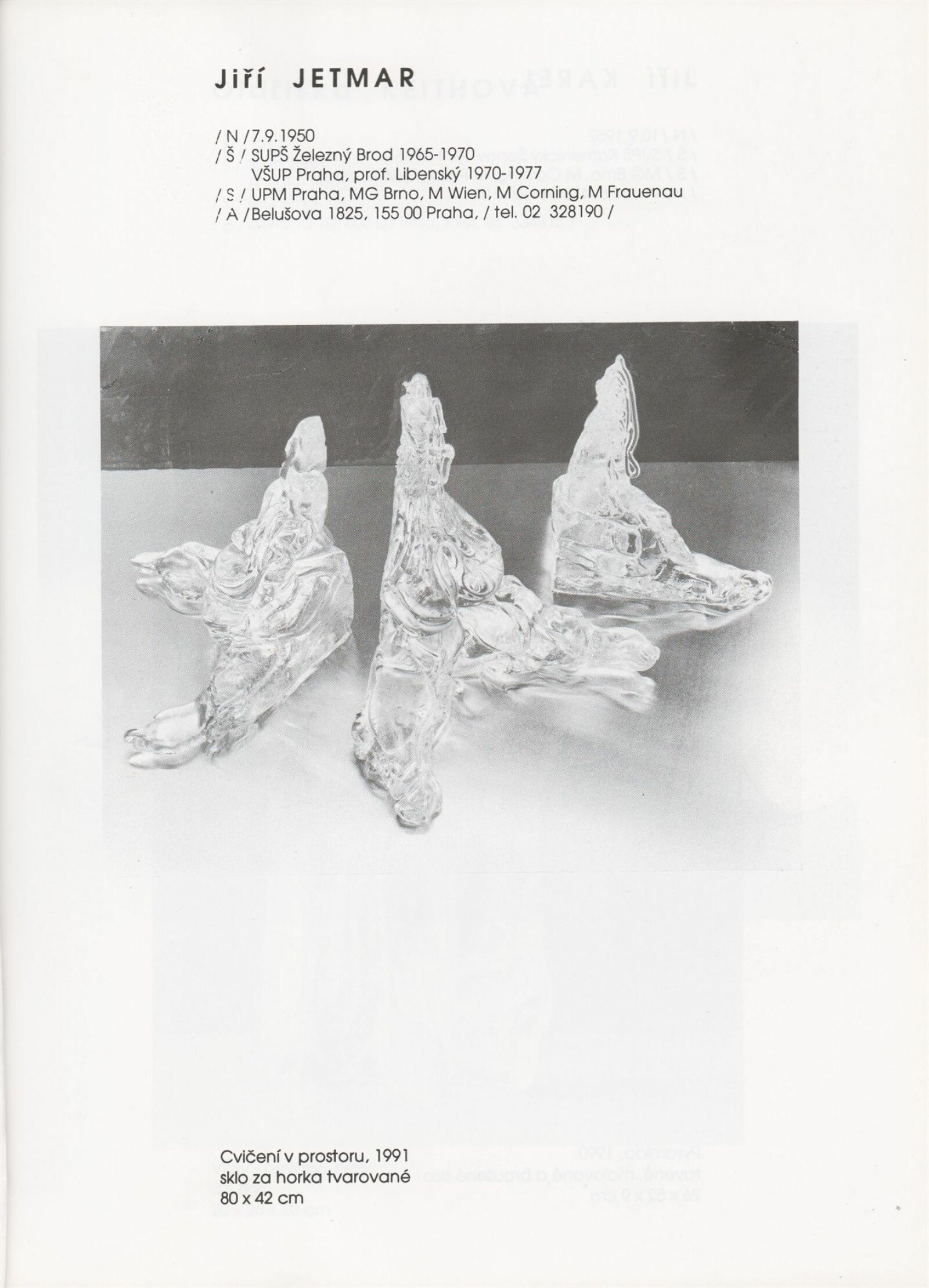 pozvánka, katalog, tisková zpráva, fotografie a negativy děl, záběr z výstavy, seznam děl, pojistný seznam, popisky prací, zápis ze schůzky, provozní a institucionální korespondence, nabídky repríz výstavy v zahraničí, potvrzení o převzetí děl, žádosti, dohody, smlouvy, reverzy, adresy, recenze v tisku, poznámky, katalogy - R. a M. Roubíčkovi., 1992, Eva Heřmanská, P. R. Manoušek, Interglas sympozium Nový Bor 1988, pozvánky k jiným výstavám