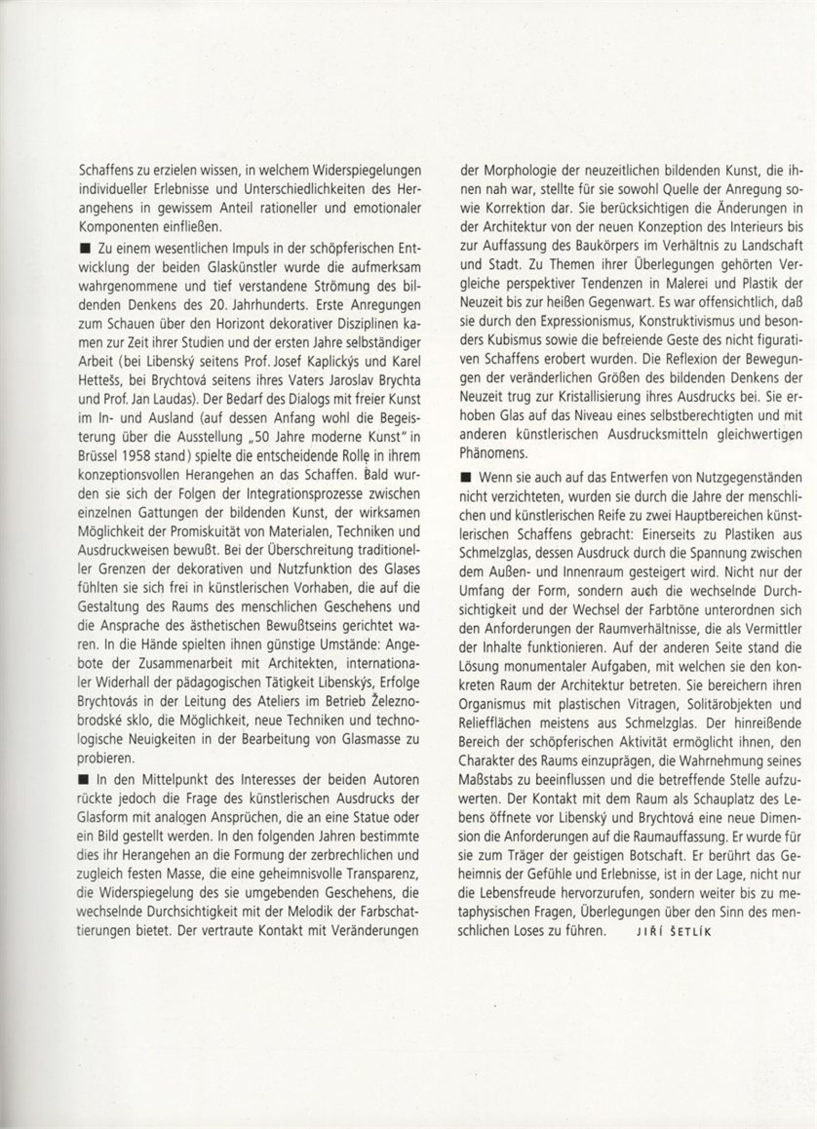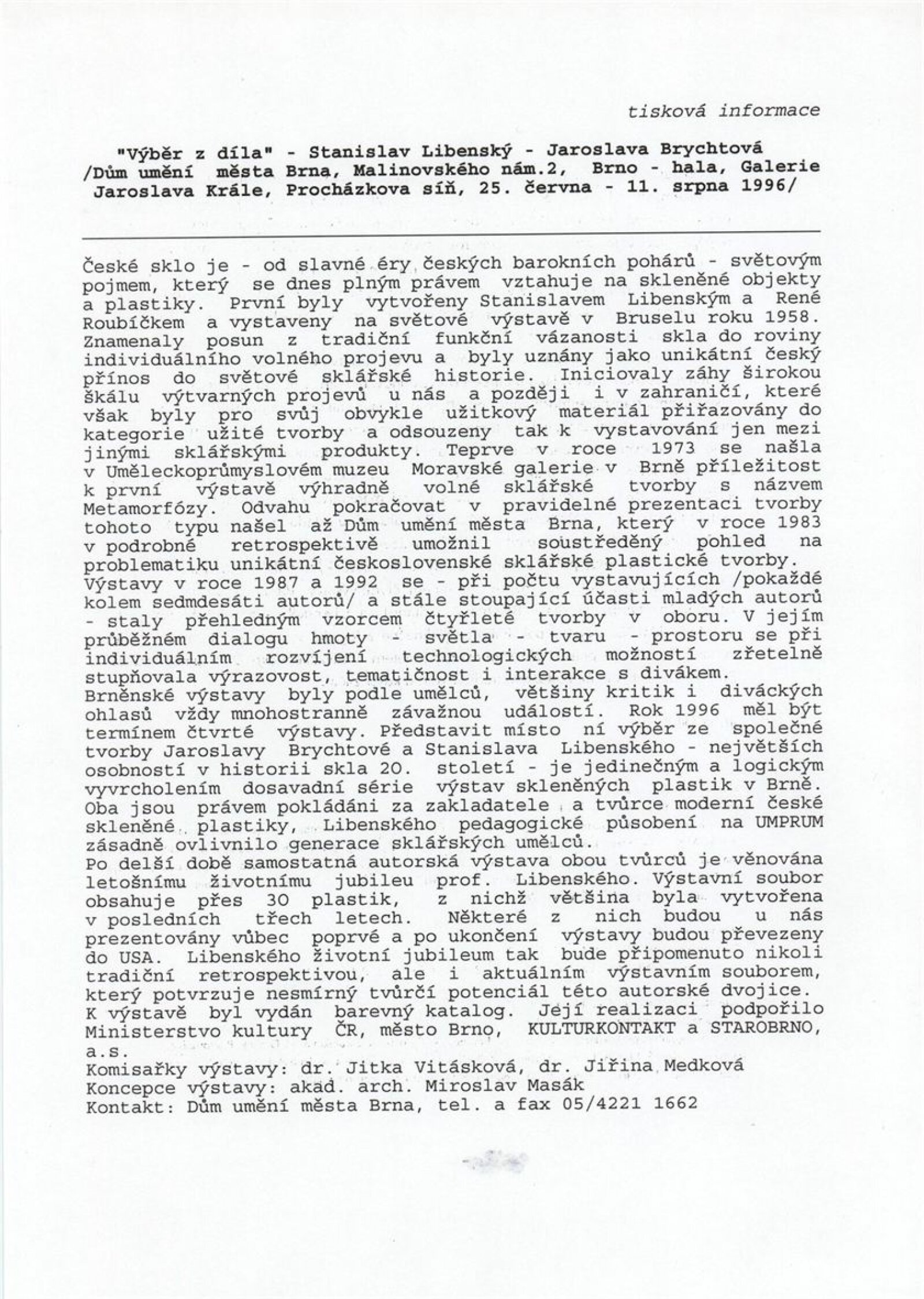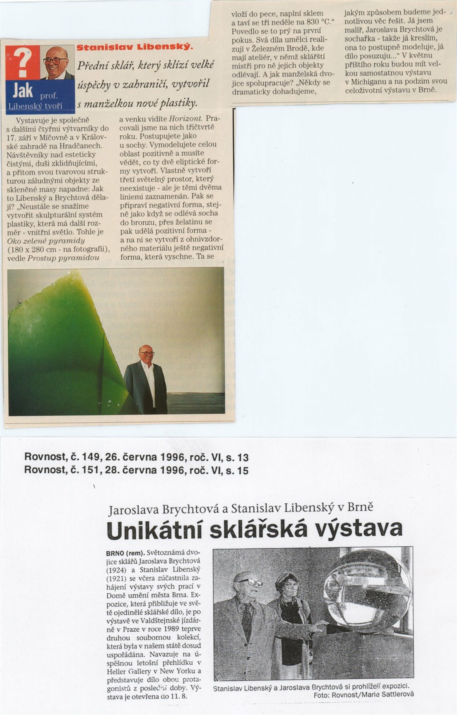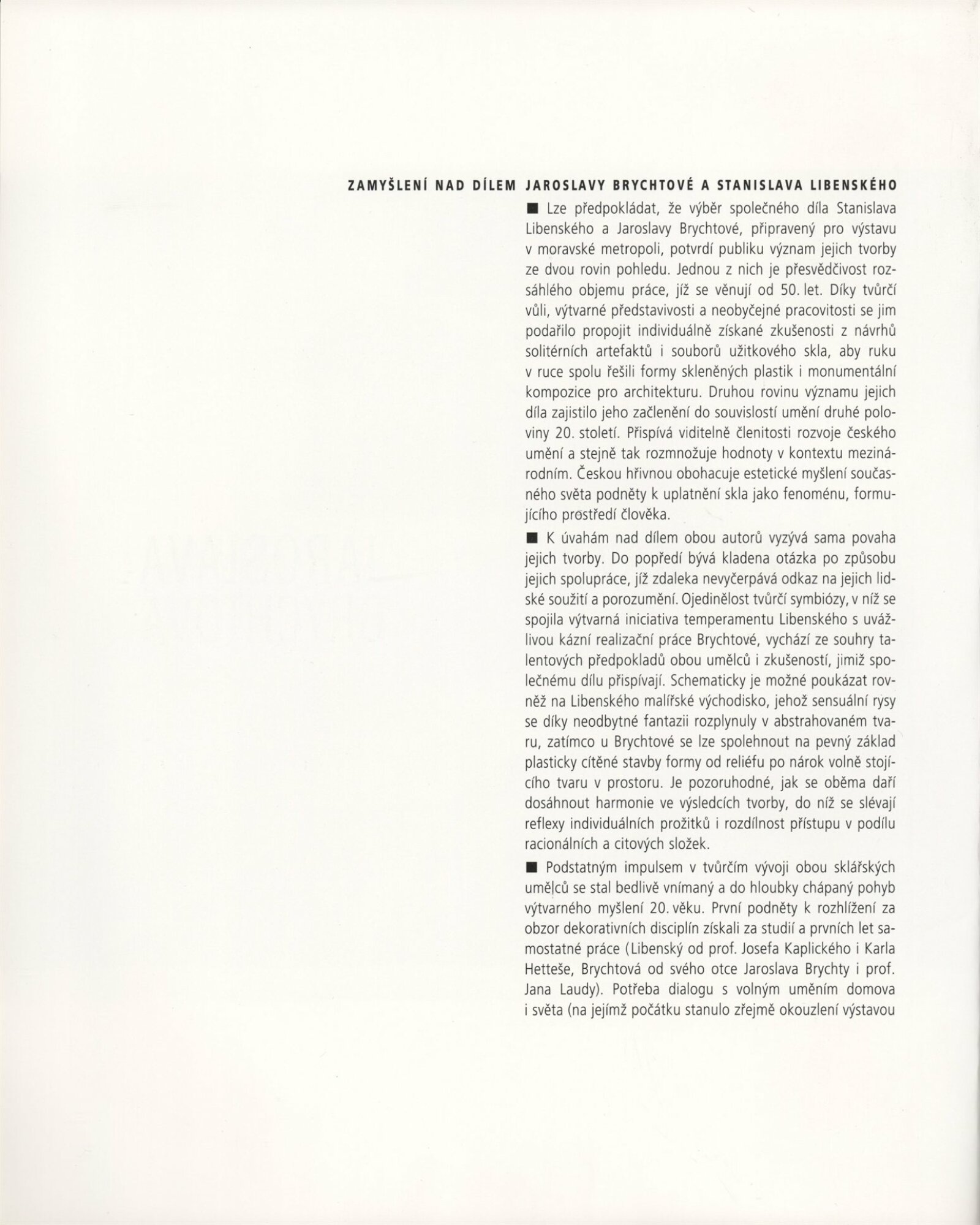 Stanislav Libenský. Jaroslava Brychtová. Výběr z díla: Dům umění města Brna, 27. [spr. 25.] 6. – 11. 8. 1996 / Text: Jiří Šetlík. – Brno: DUmB, 1996. – [40] s., obr., portréty, ceny, realizace v architektuře, výstavy, DU 1029. – MZK; MG