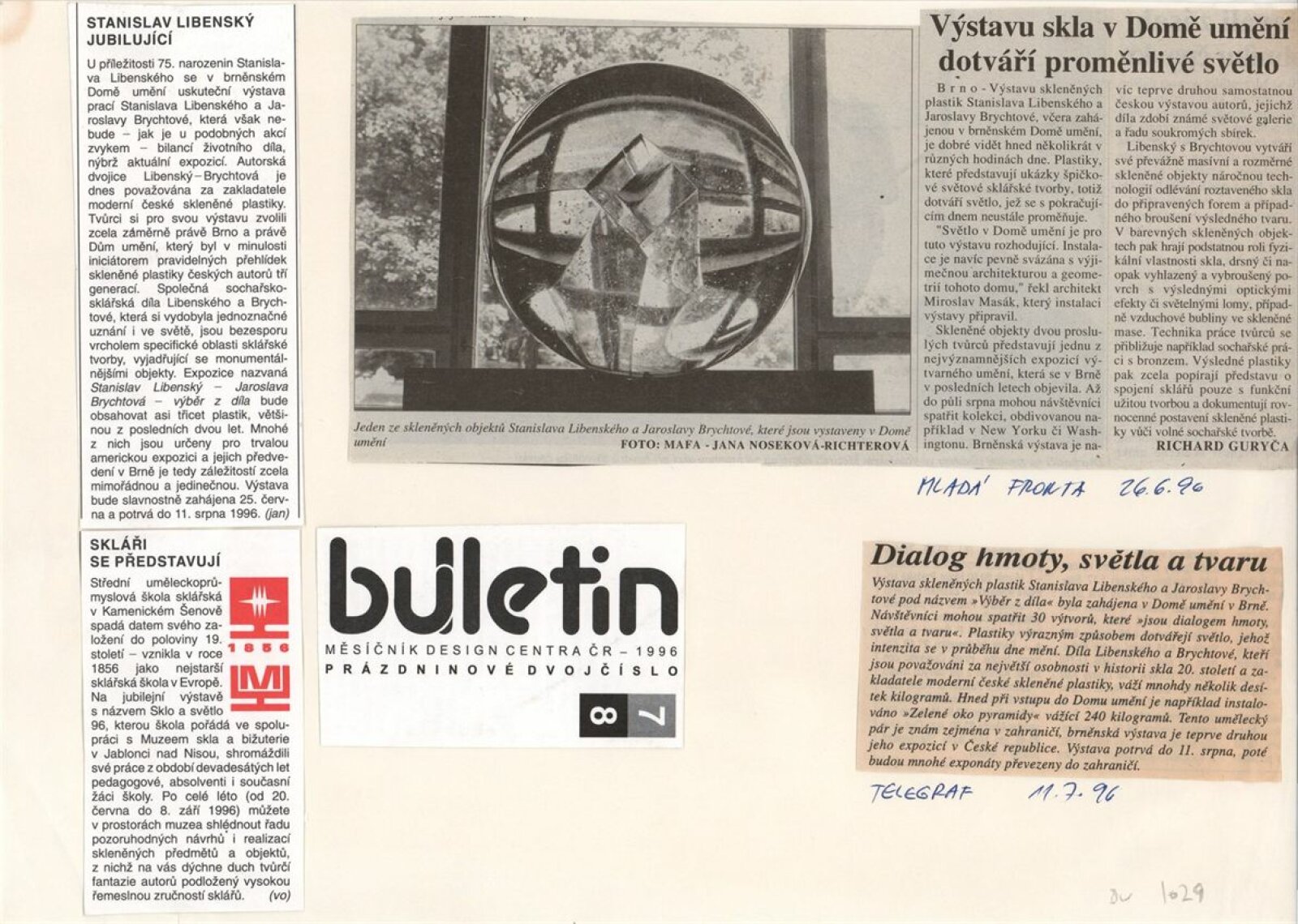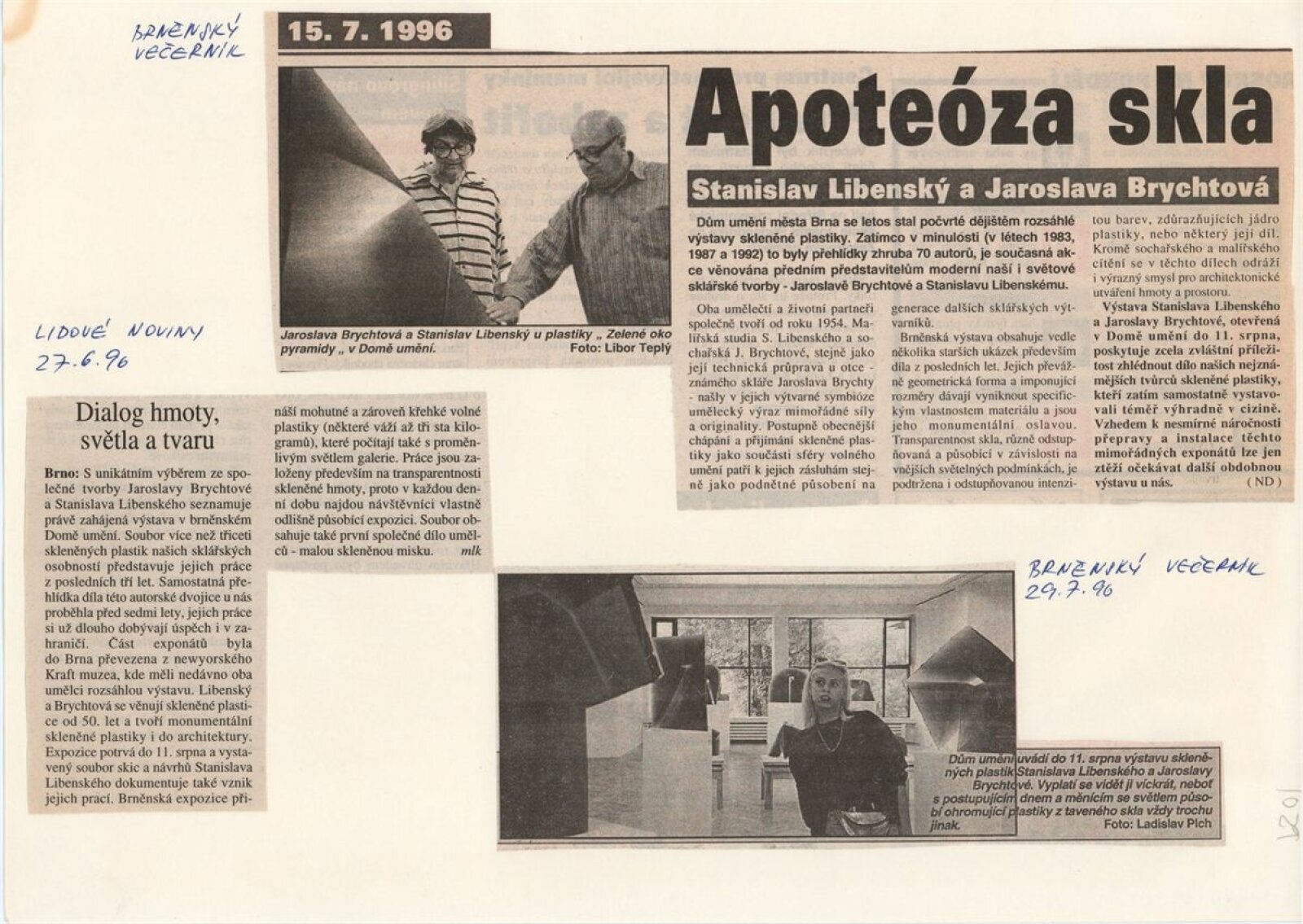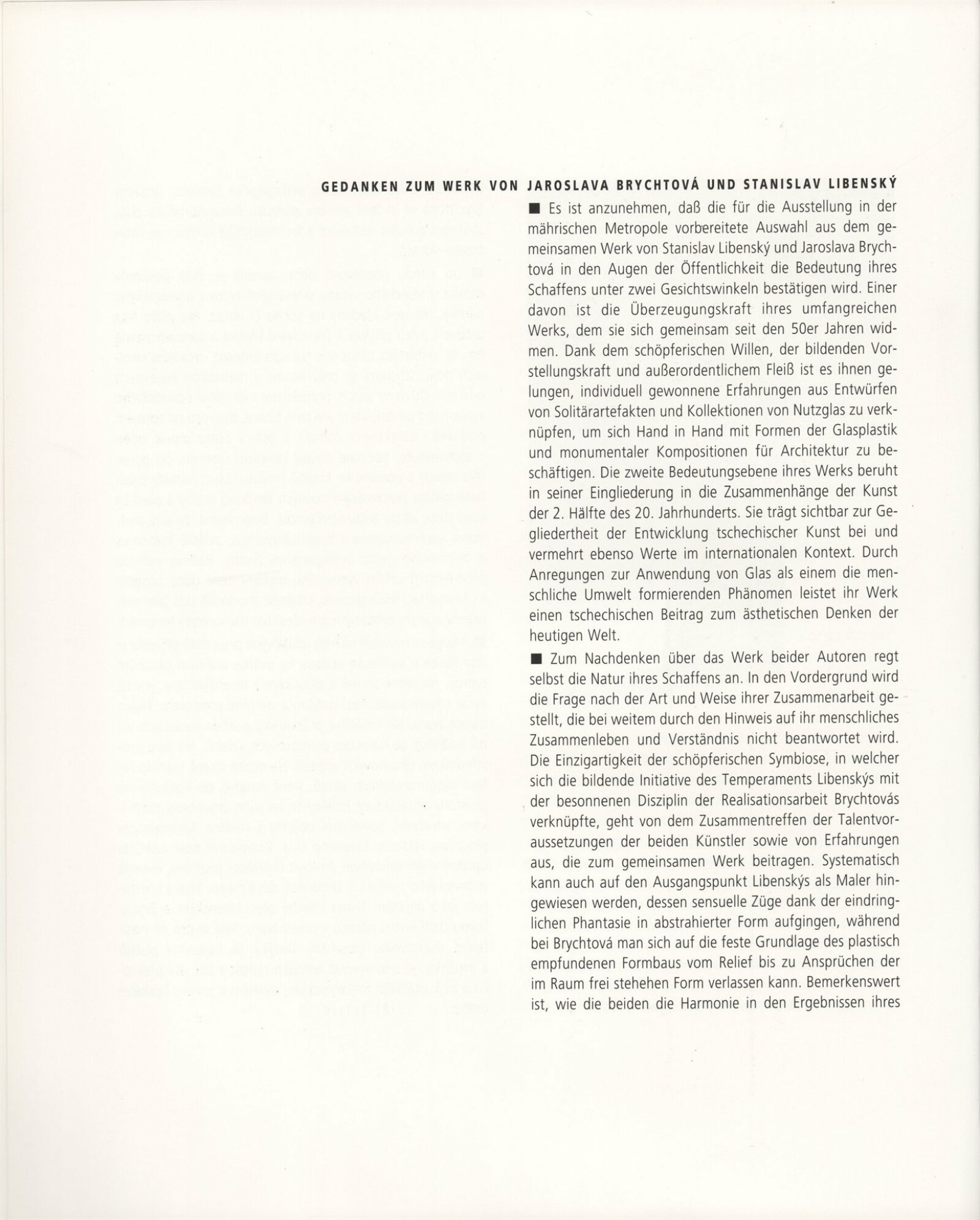 Stanislav Libenský. Jaroslava Brychtová. Výběr z díla: Dům umění města Brna, 27. [spr. 25.] 6. – 11. 8. 1996 / Text: Jiří Šetlík. – Brno: DUmB, 1996. – [40] s., obr., portréty, ceny, realizace v architektuře, výstavy, DU 1029. – MZK; MG