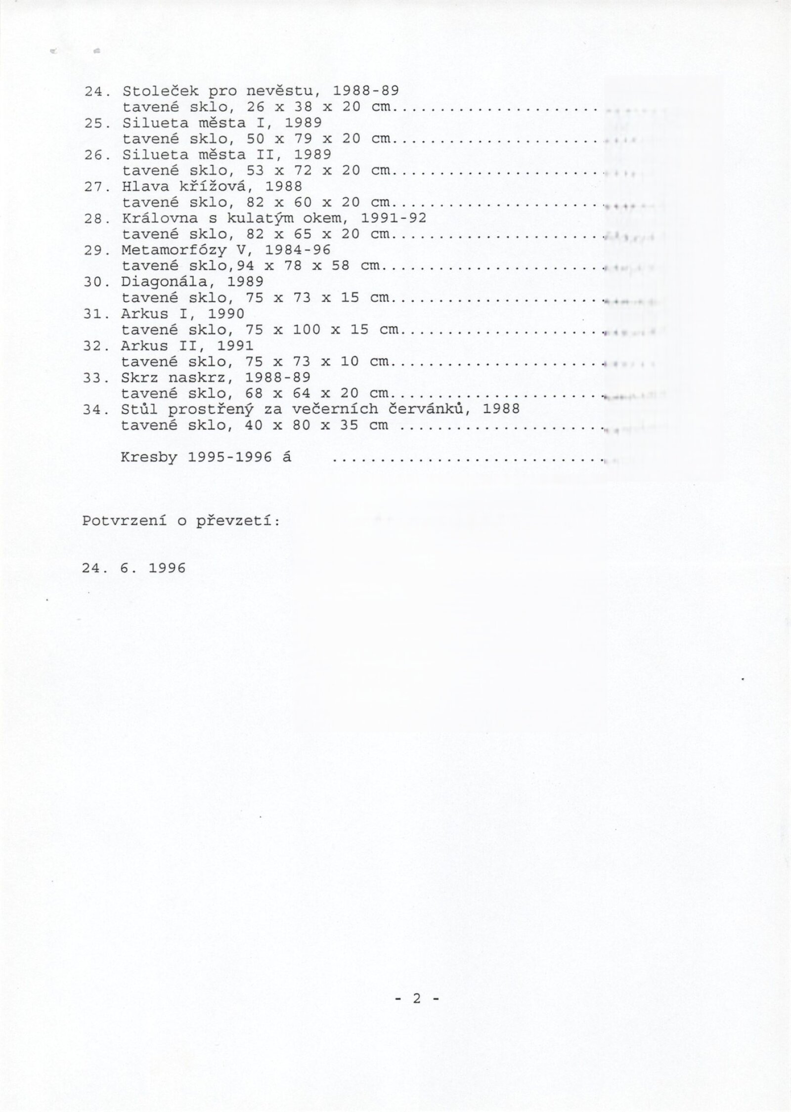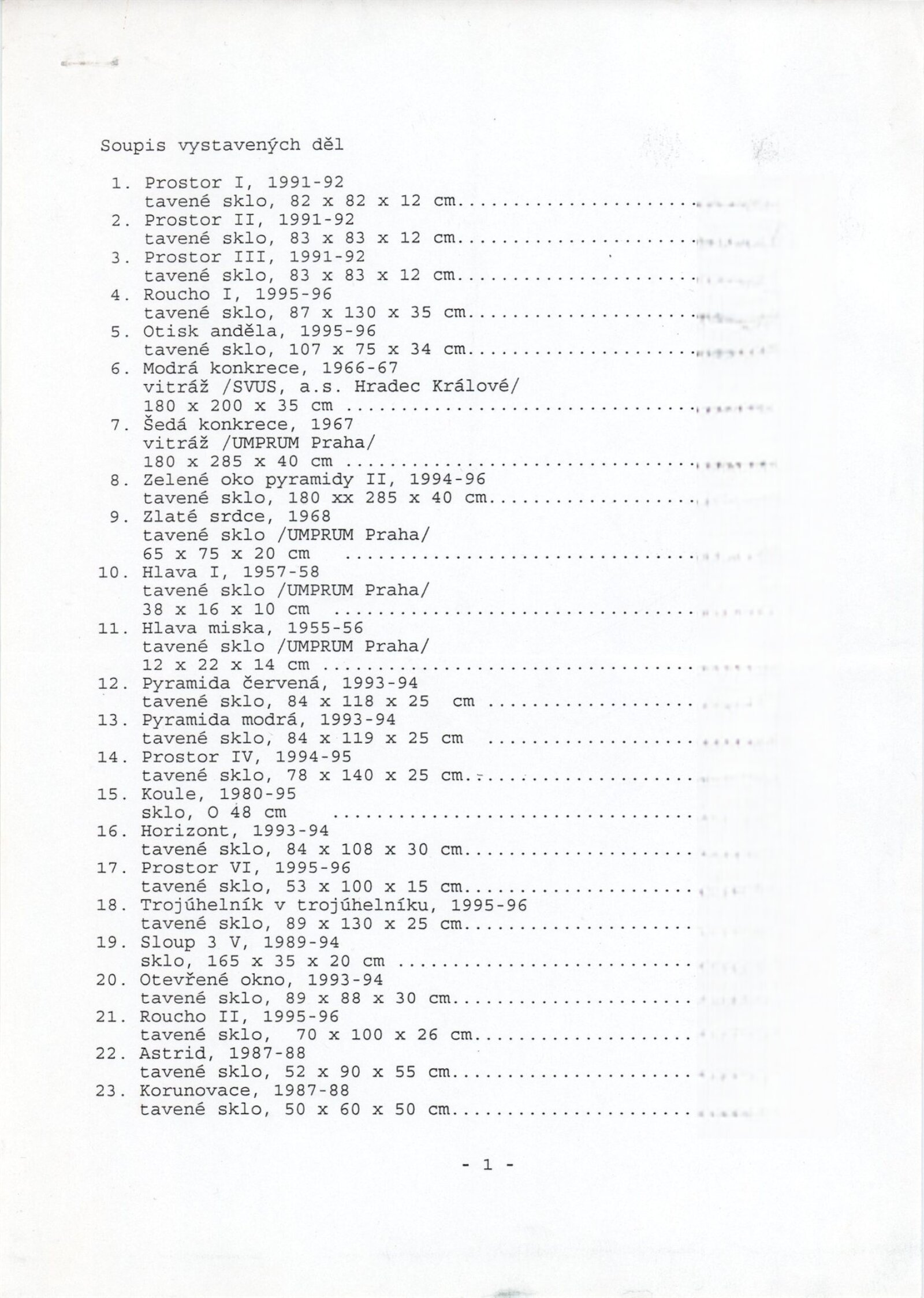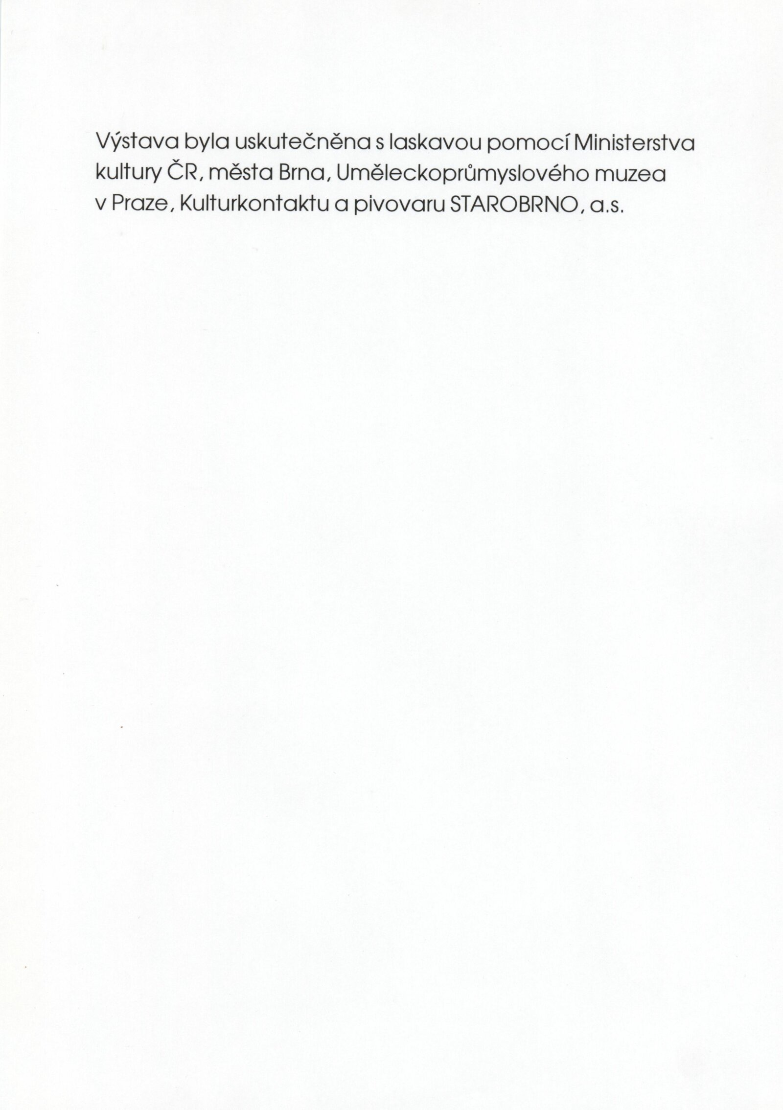 pozvánka, katalog, fotografie výstavy a vernisáže, seznam vystavených děl, materiály pro katalog a pozvánku, nátisky textů katalogu, smlouvy, faktury provozní korespondence, žádost o výstavu, poznámky, kresebné náčrtky vybraných děl, plán instalace výstavy, recenze v tisku, katalog Jaroslava Brychtová, digitalizovaný videozáznam z výstavy (VHS)