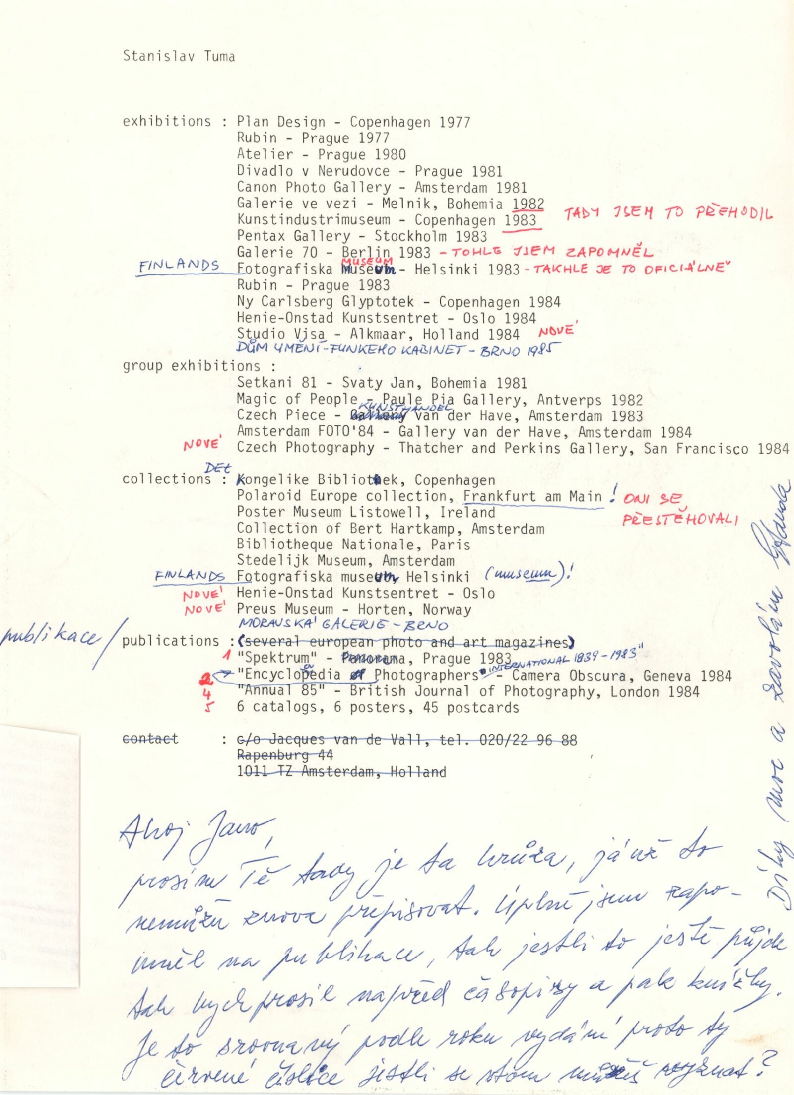 pozvánka, podklady pro katalog (texty zaslané Stanislavem Tůmou a tiráž), úvodní slovo Jany Vránové, žádost o povolení výstavy, fotografie vystavených fotografií, provozní korespondence (ohledně tisku katalogů, korespondence mezi J. Vránovou a autorem), recenze v tisku