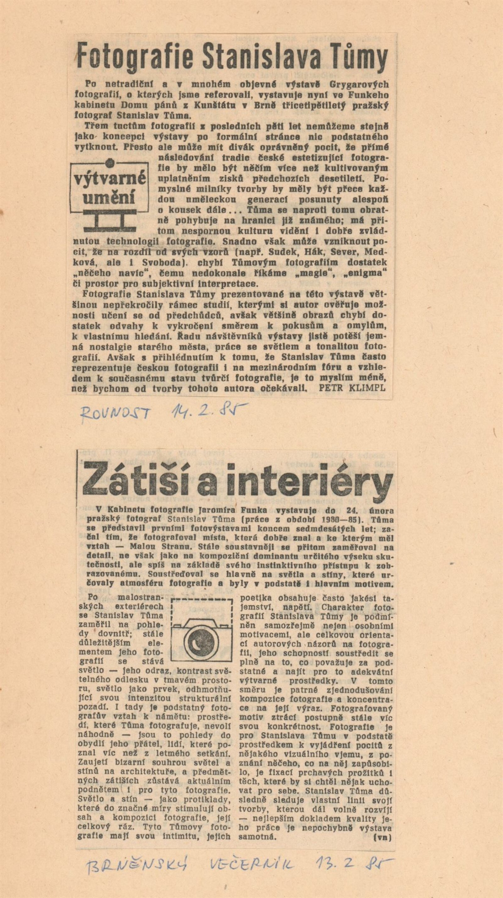 Stanislav Tůma. Fotografie 1980–1985: Dům umění / Dům pánů z Kunštátu, Kabinet fotografie Jaromíra Funka, 22. 1. – 24. 2. 1985 / Text: Antonín Dufek. – Brno: DUmB, 1985. – 9 s., obr., životní data, zastoupení ve sbírkách, výstavy, DPK 835. – MZK; MG; MMB