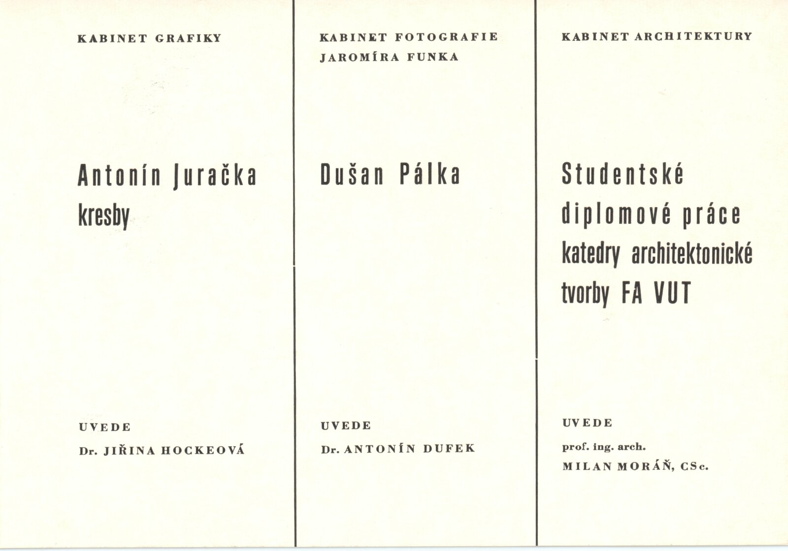 Výstava diplomových prací studentů katedry architektonické tvorby fakulty architektury Vysokého učení technického v Brně za období 1980–1985: Dům umění / Dům pánů z Kunštátu, 161. výstava Kabinetu architektury, 6. 12. 1985 – 12. 1. 1986 / Brno: FA VUT, 1985. – skládačka 6 s. v obalu, DPK 859