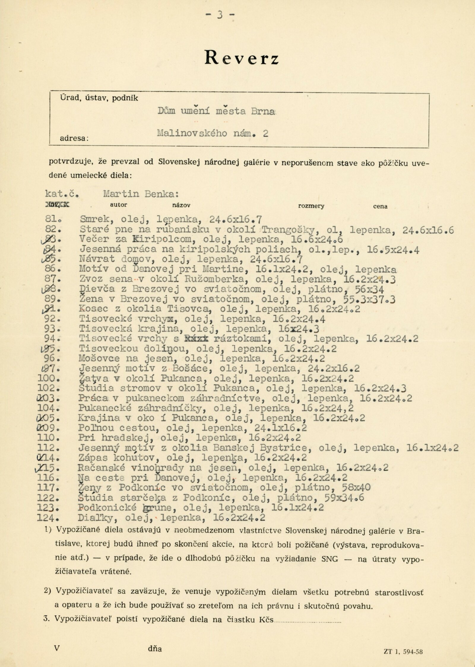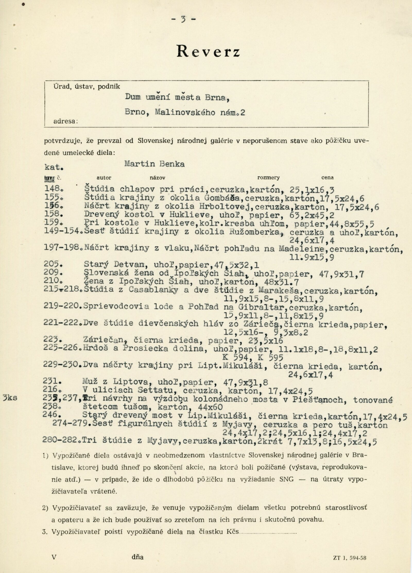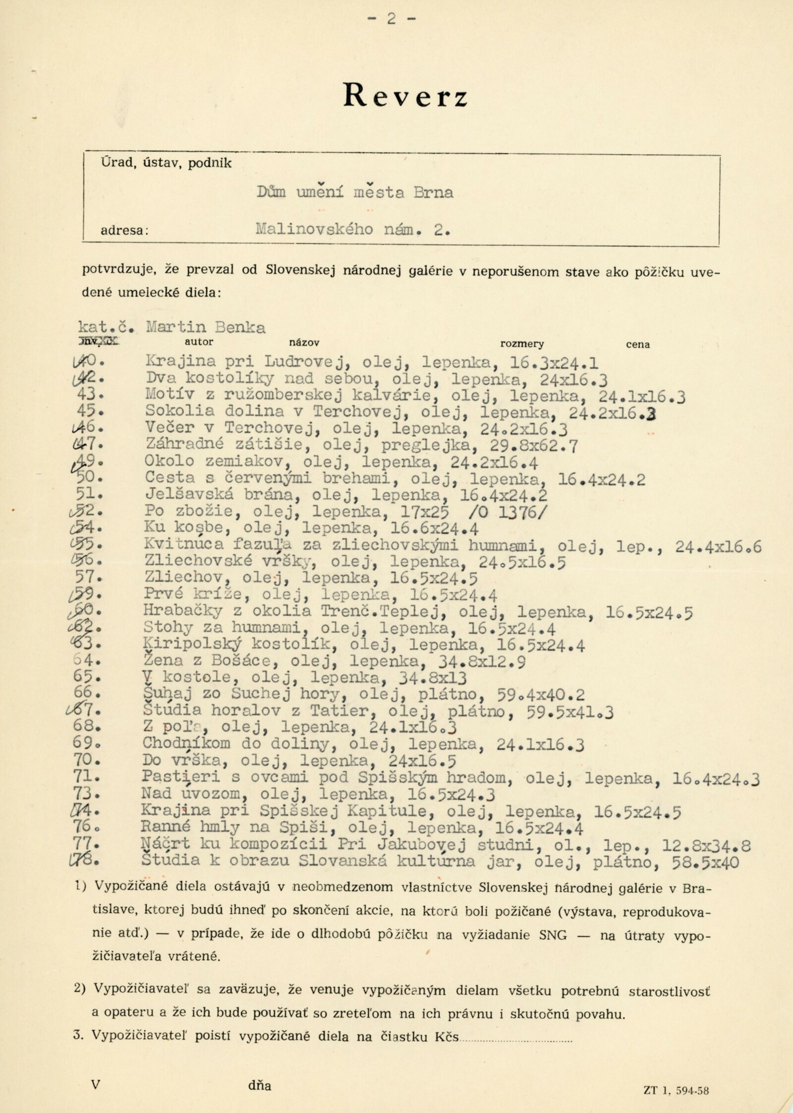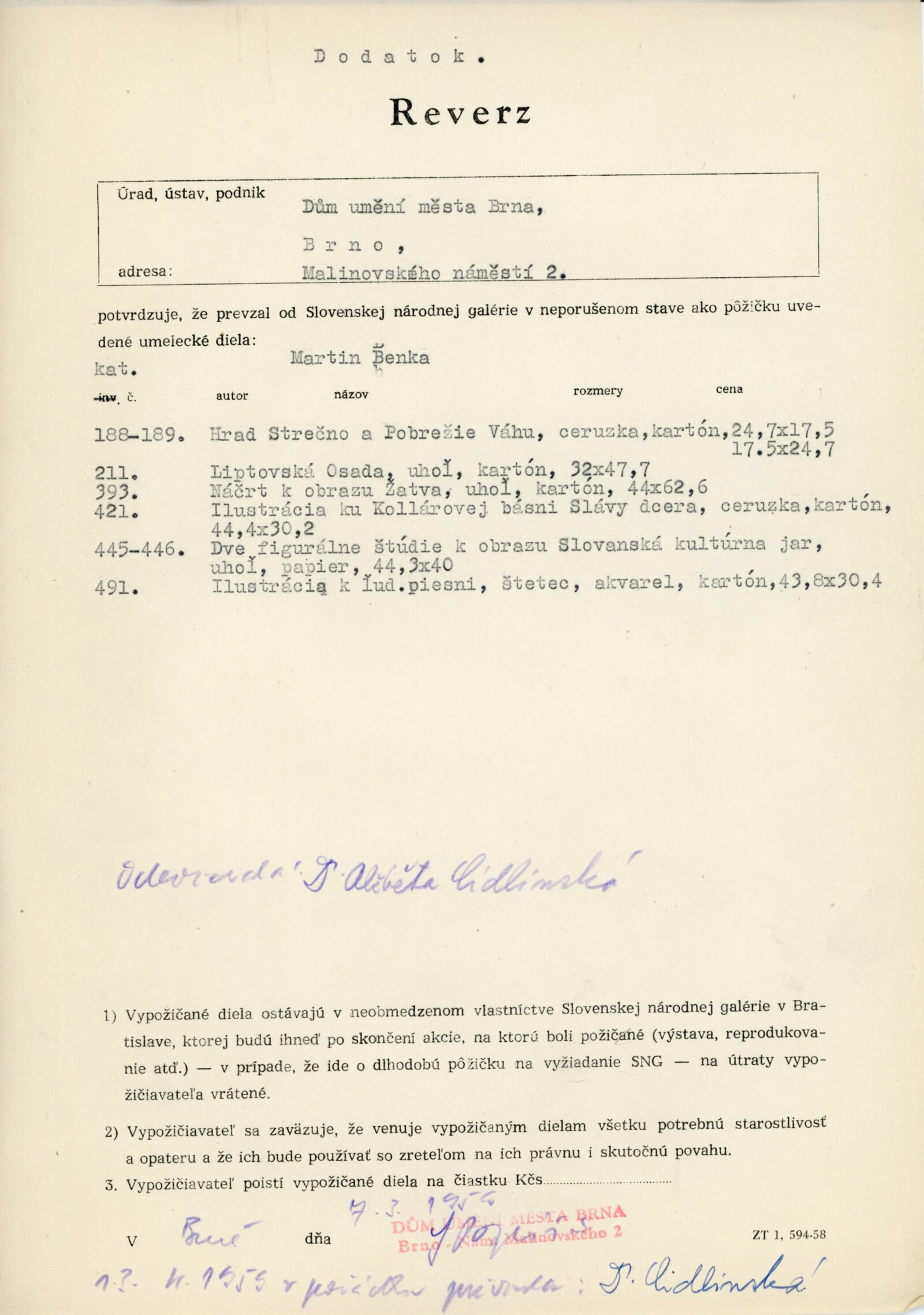 pozvánka, katalog, korespondence (s SNG), reversy (SNG – soupis děl), plakát SNG