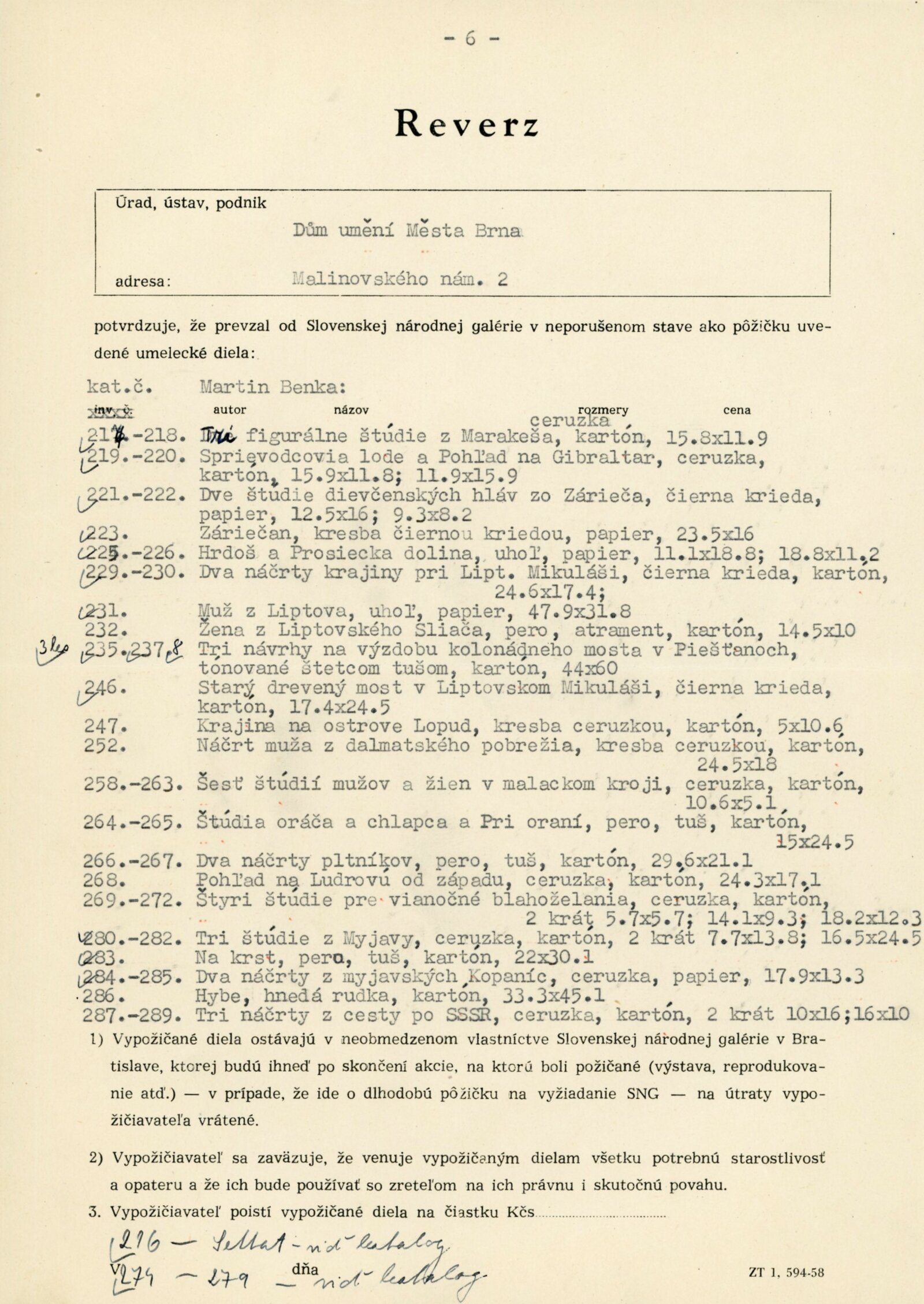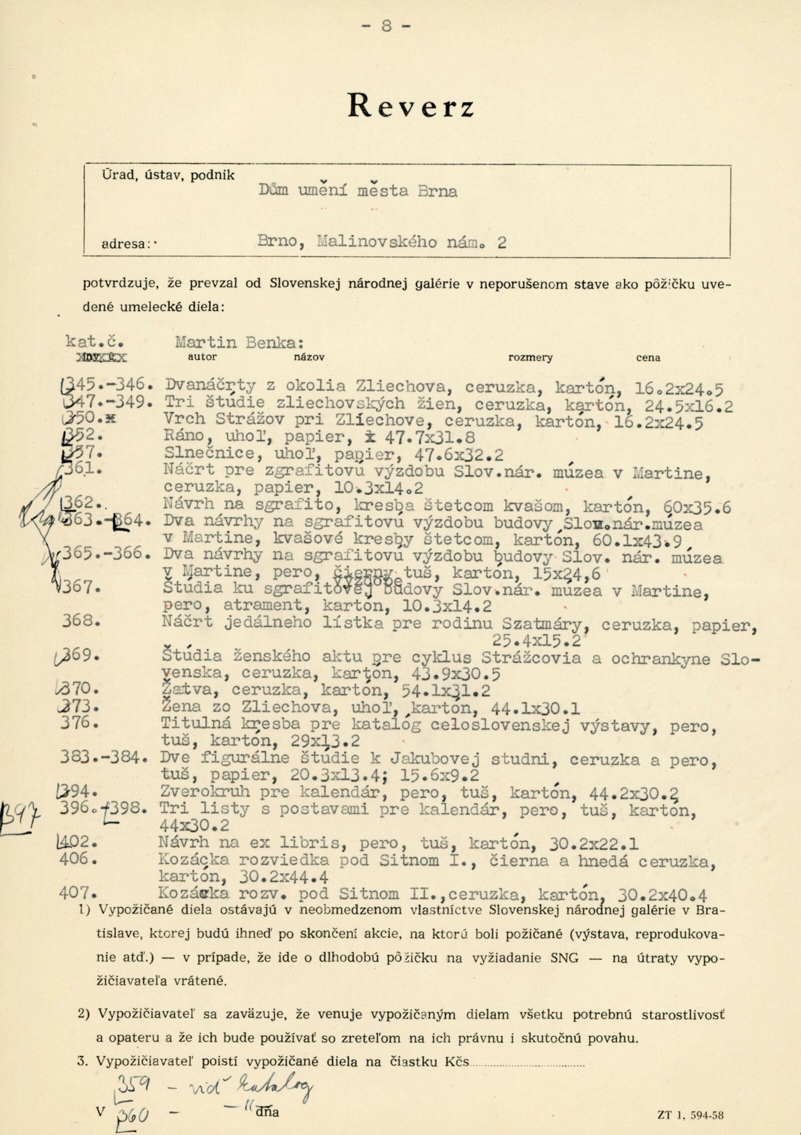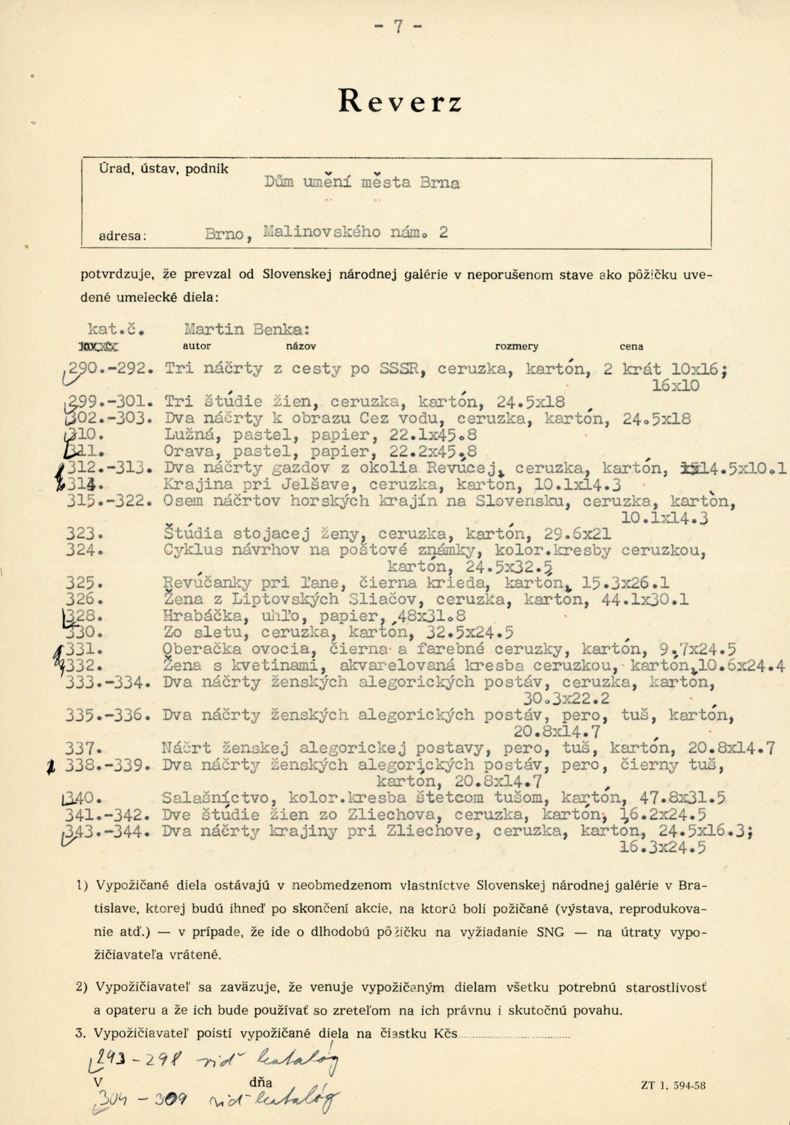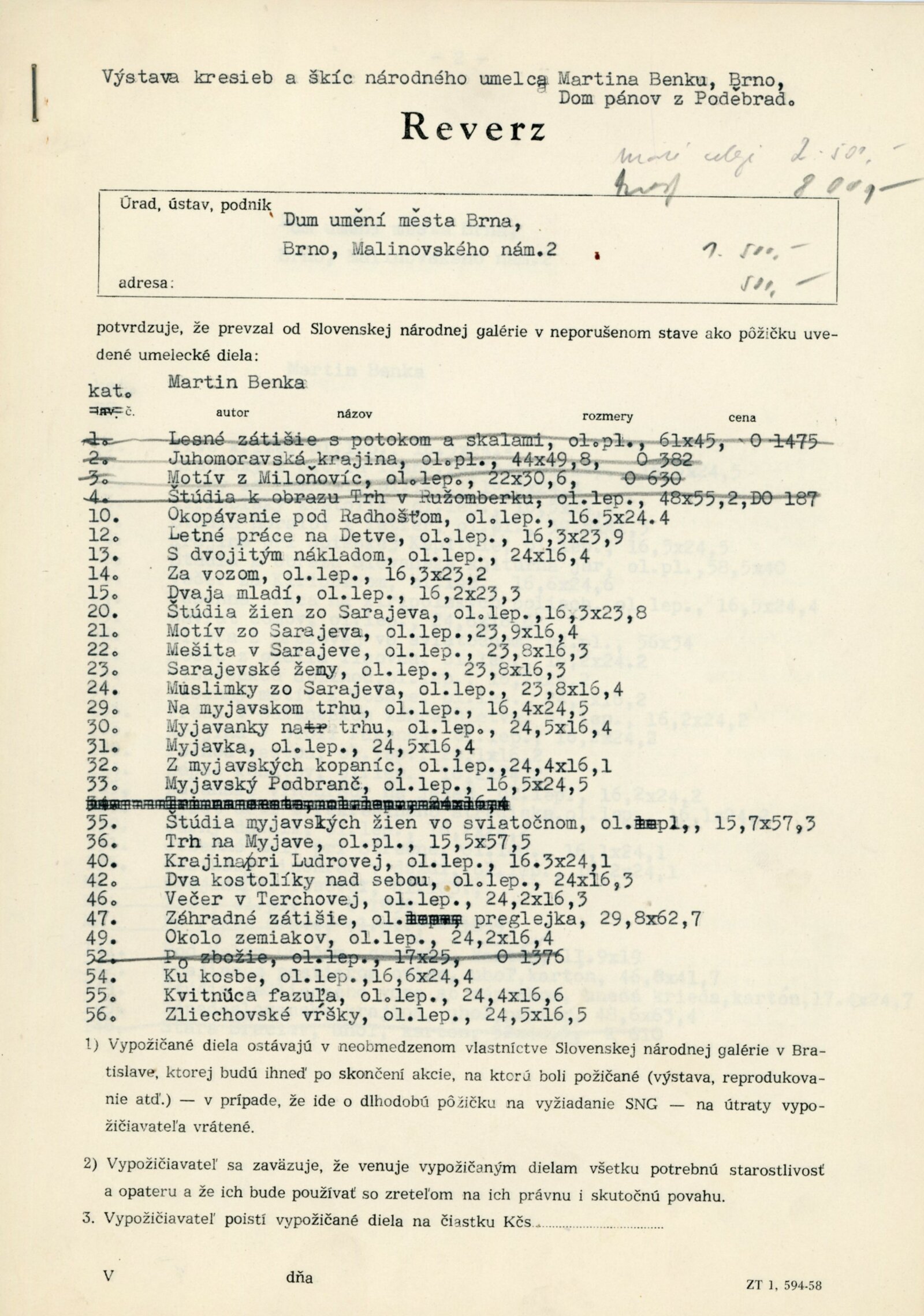 pozvánka, katalog, korespondence (s SNG), reversy (SNG – soupis děl), plakát SNG