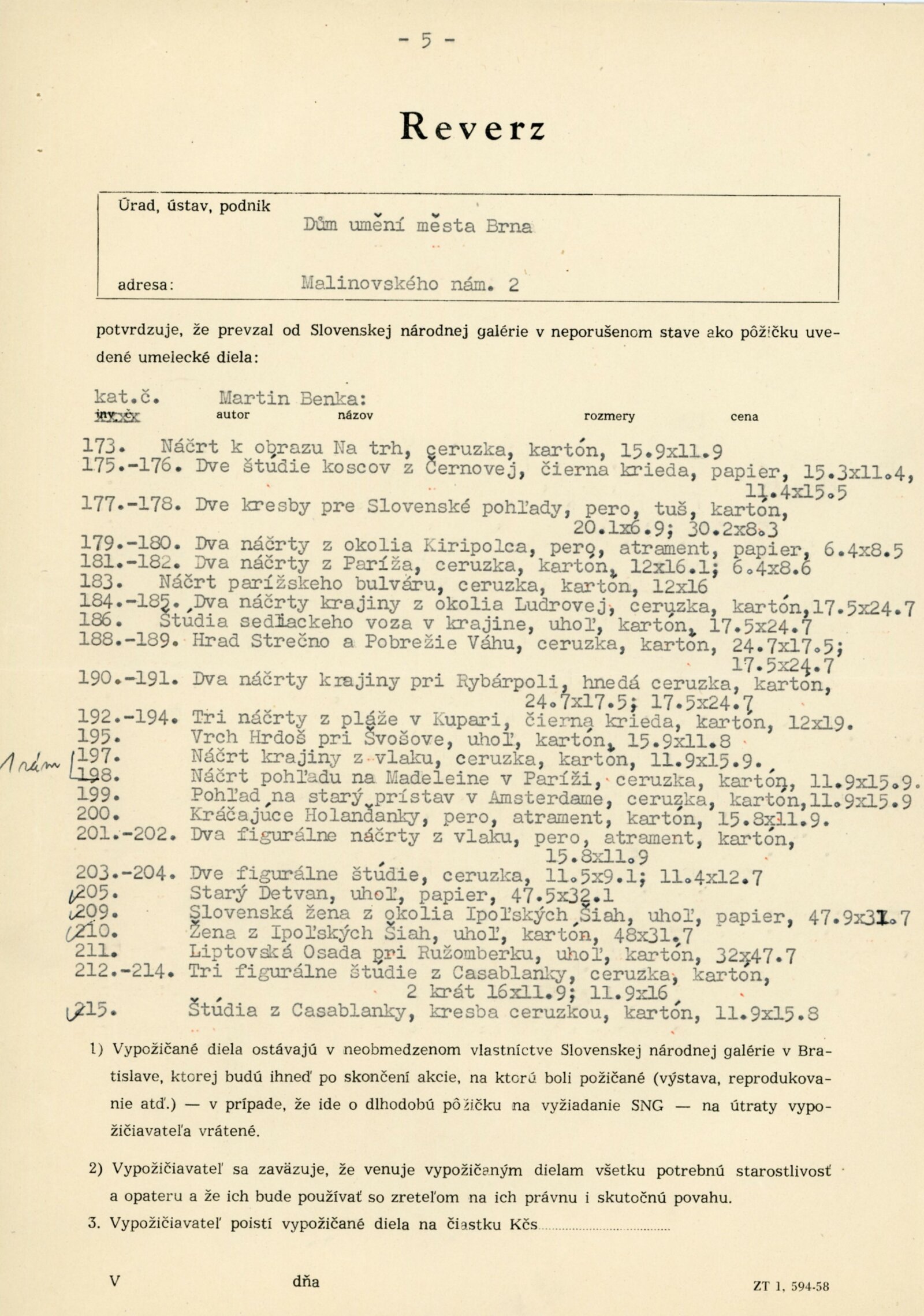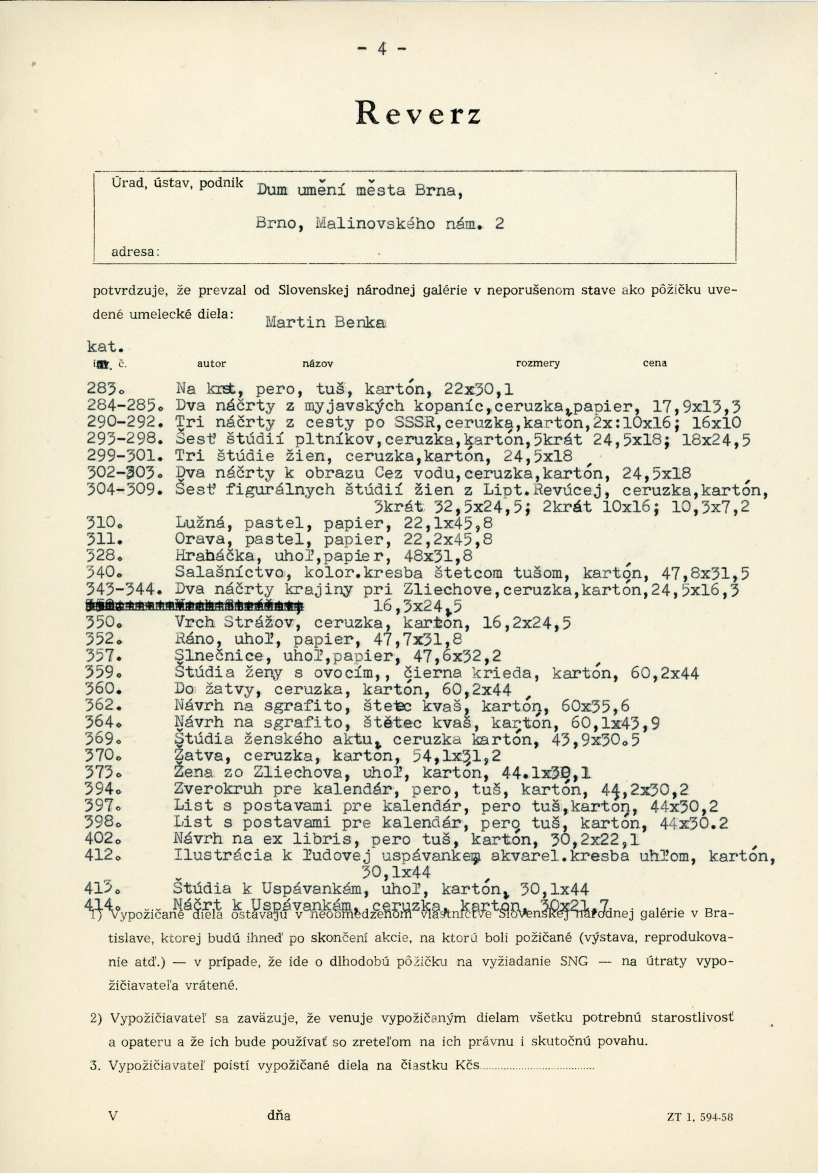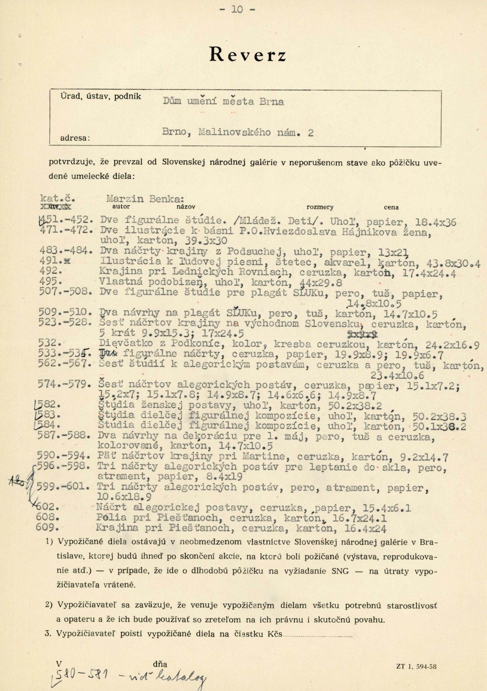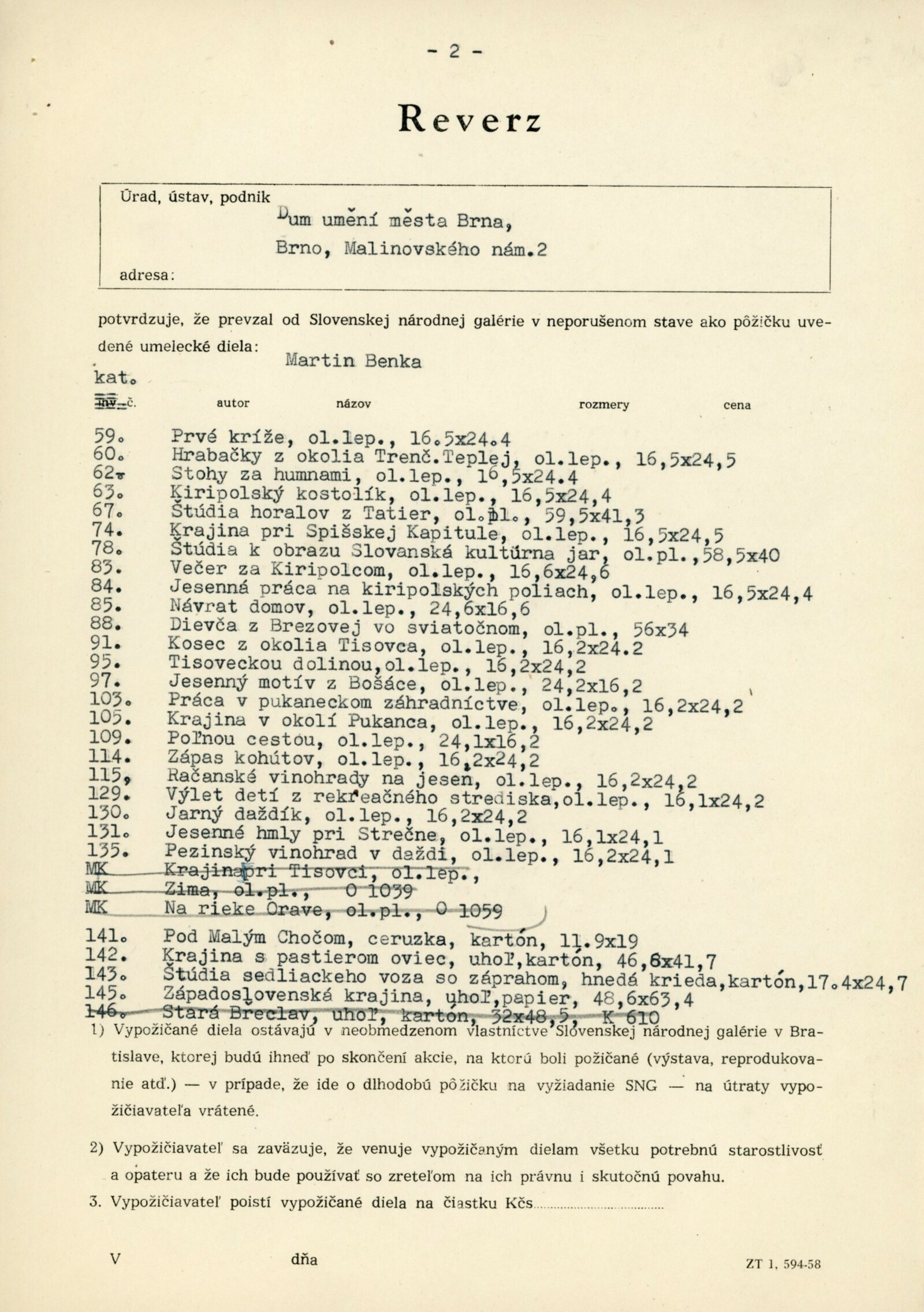 pozvánka, katalog, korespondence (s SNG), reversy (SNG – soupis děl), plakát SNG
