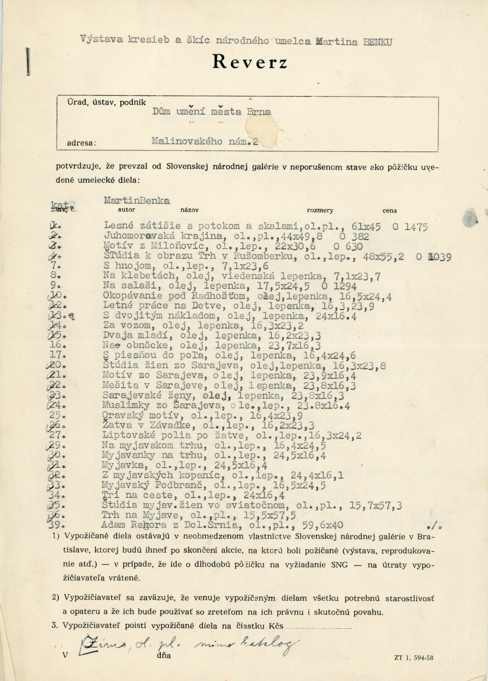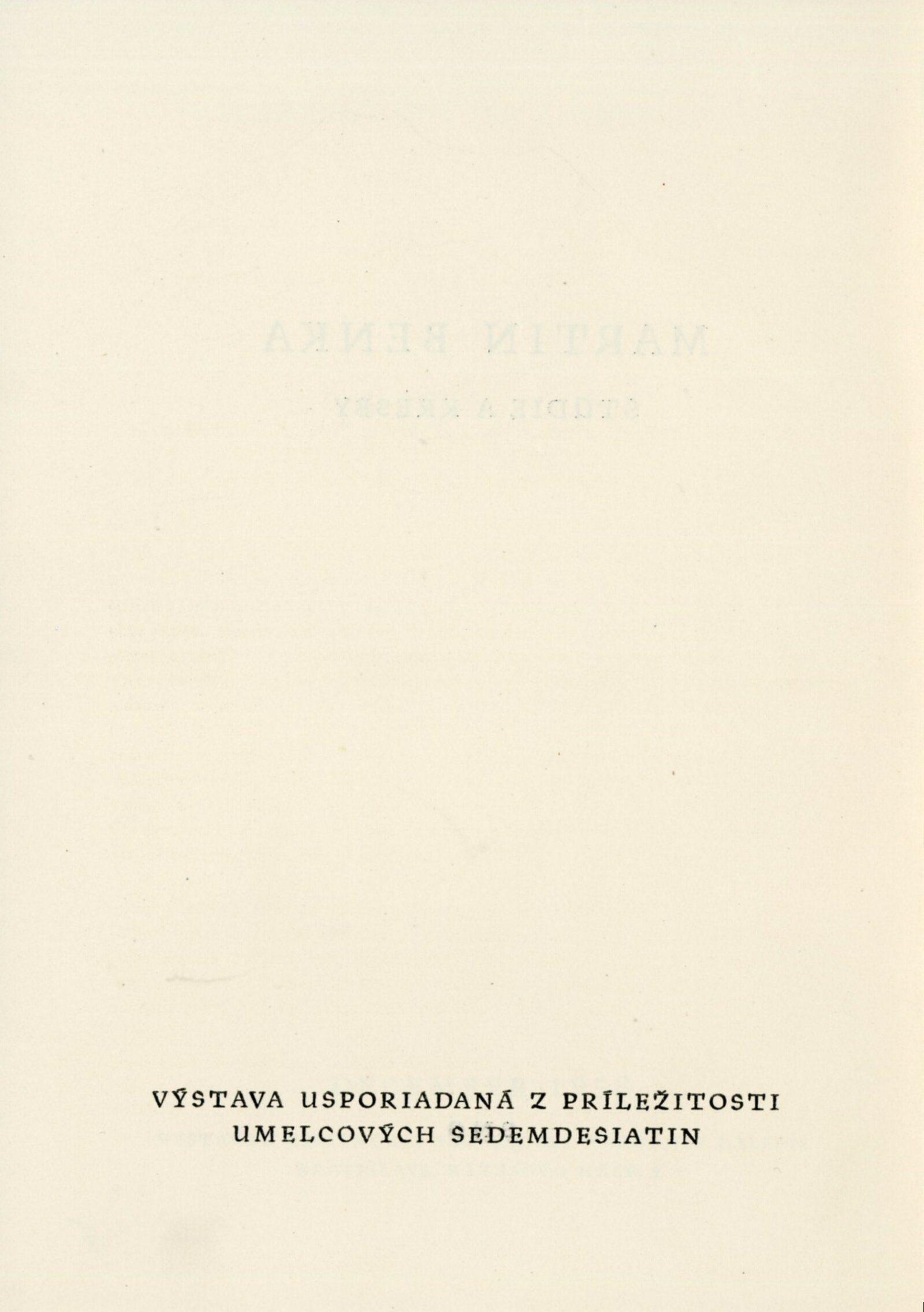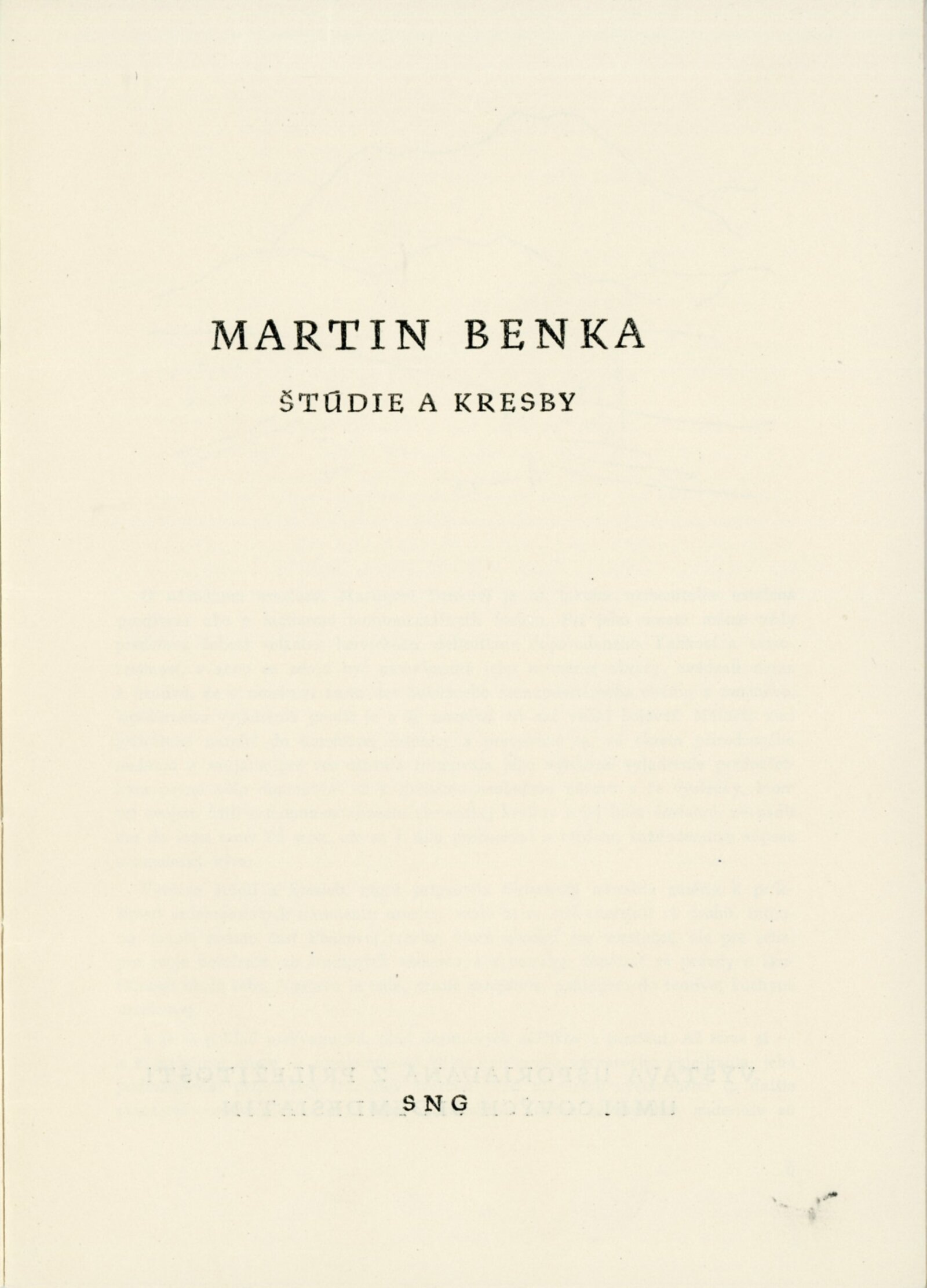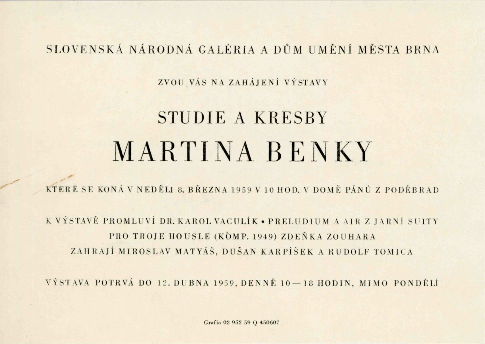 Studie a kresby Martina Benky: Dům umění města Brna / Dům pánů z Poděbrad, 8. 3. – 12. 4. 1959 / Převzatý katalog. Martin Benka. Štúdie a kresby: výstavní místnosti Slovenské národní galerie Bratislava, prosinec 1958 / Text: Karol Vaculík. – Bratislava: Slovenská národná galéria, 1958. – 21 s., 8 s. obr. příl., DPK 31. – MZK