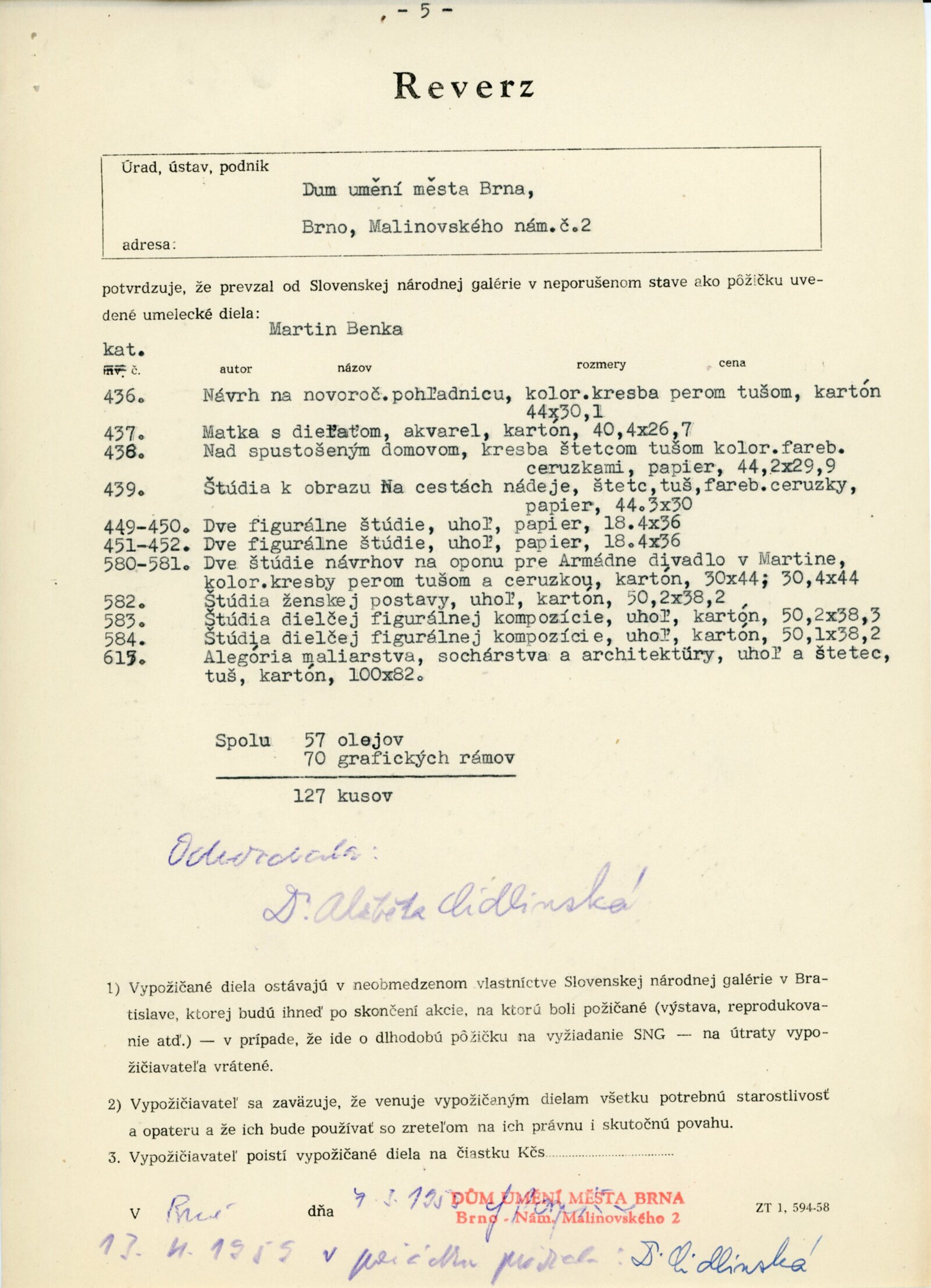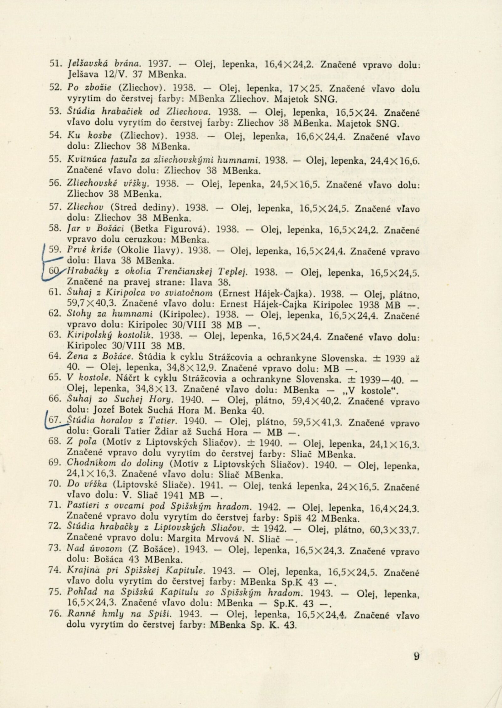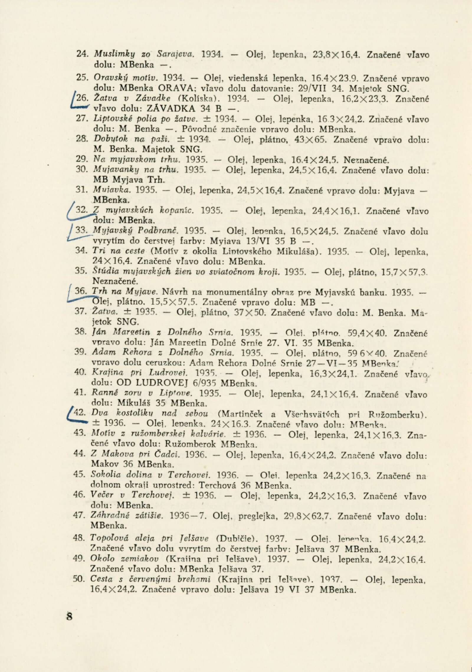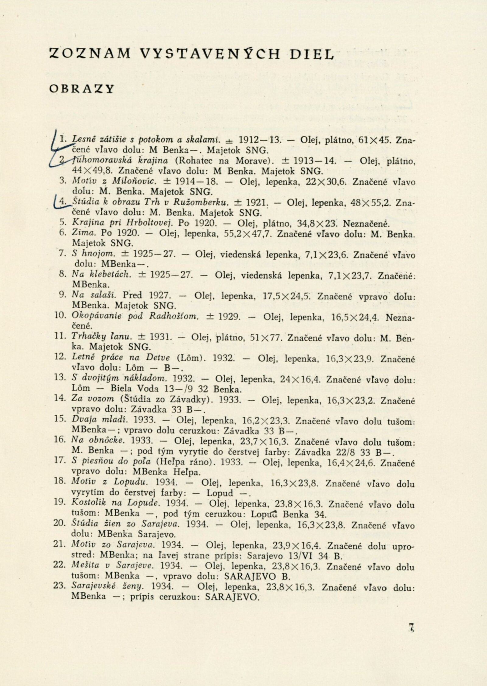 Studie a kresby Martina Benky: Dům umění města Brna / Dům pánů z Poděbrad, 8. 3. – 12. 4. 1959 / Převzatý katalog. Martin Benka. Štúdie a kresby: výstavní místnosti Slovenské národní galerie Bratislava, prosinec 1958 / Text: Karol Vaculík. – Bratislava: Slovenská národná galéria, 1958. – 21 s., 8 s. obr. příl., DPK 31. – MZK