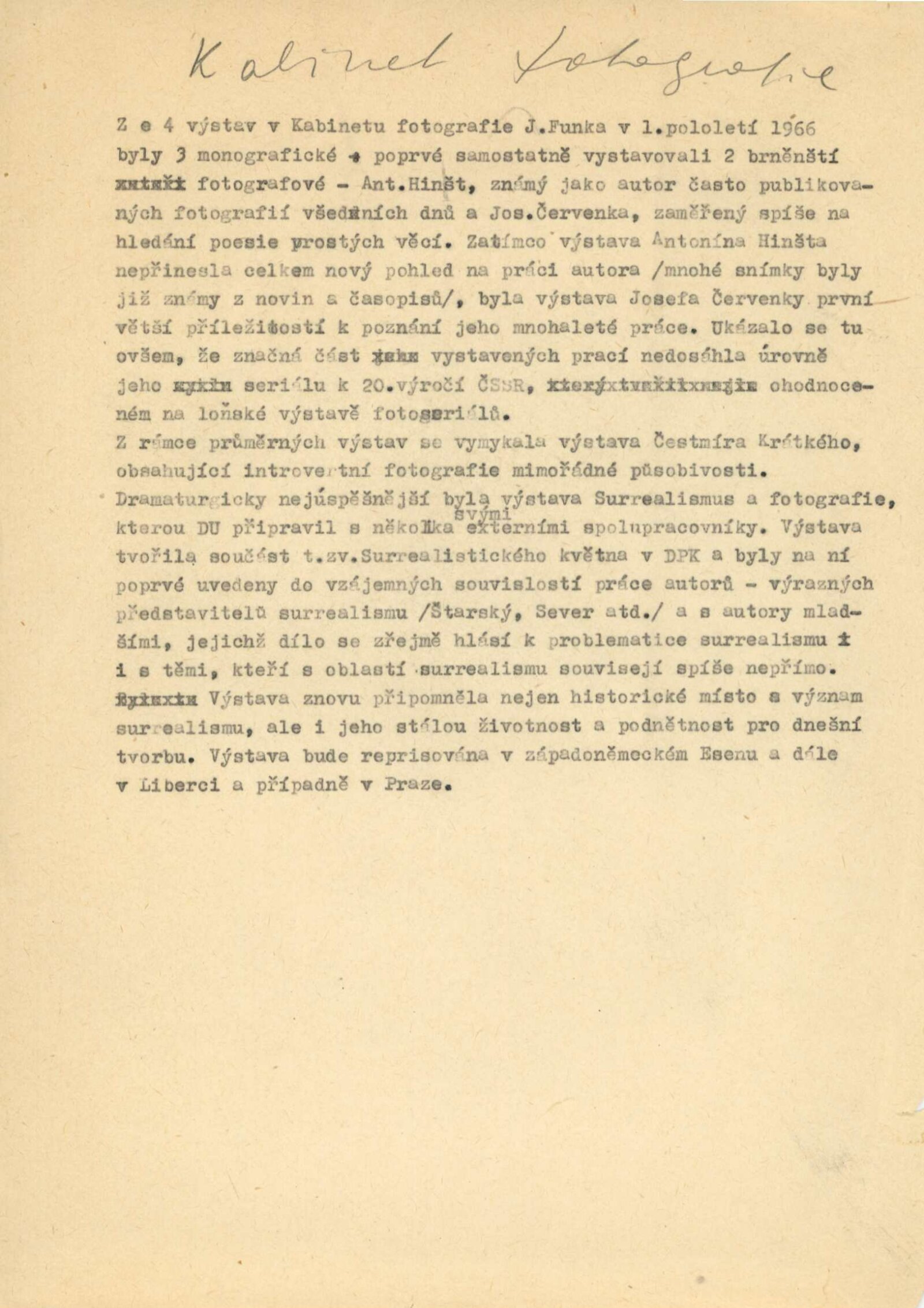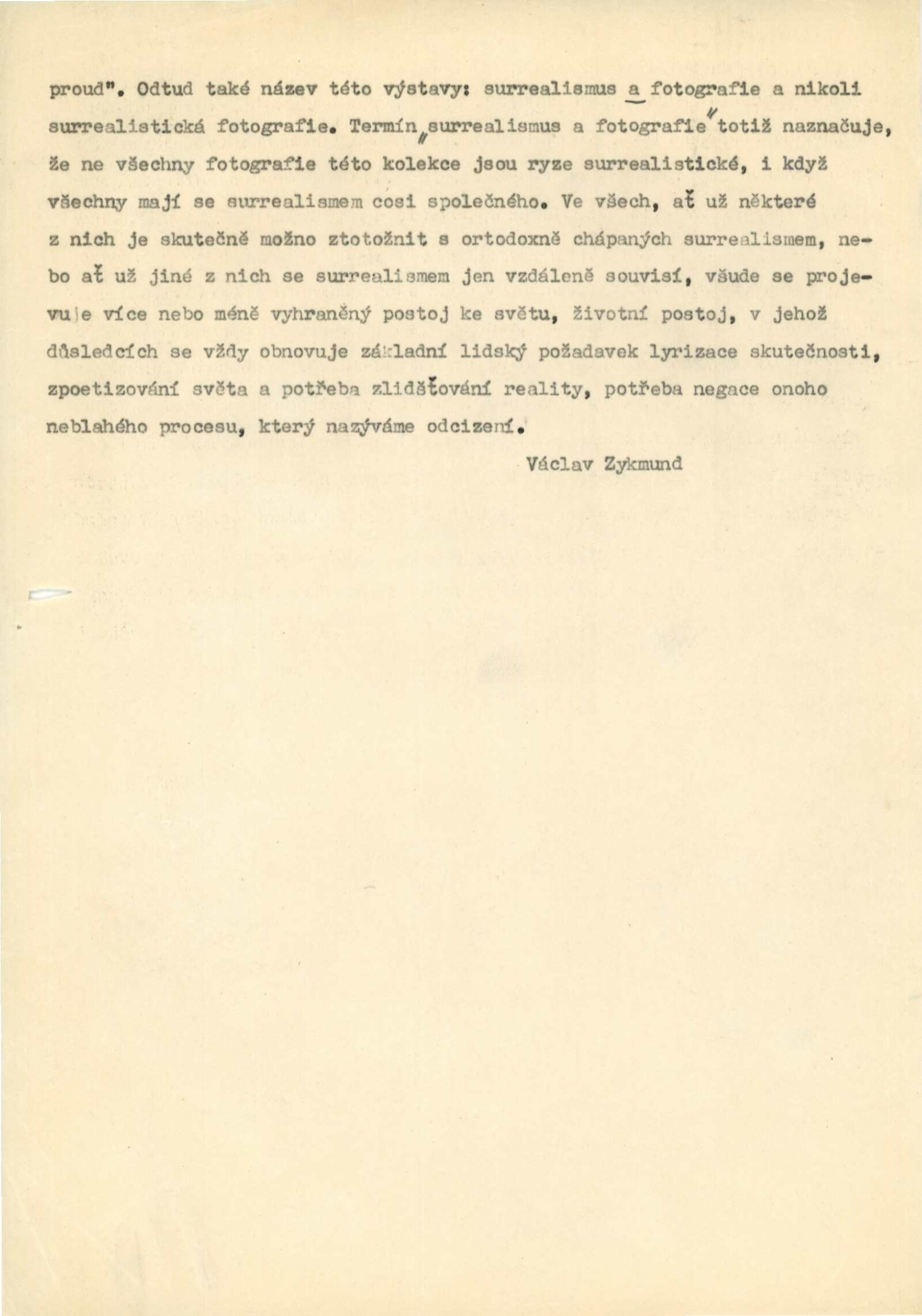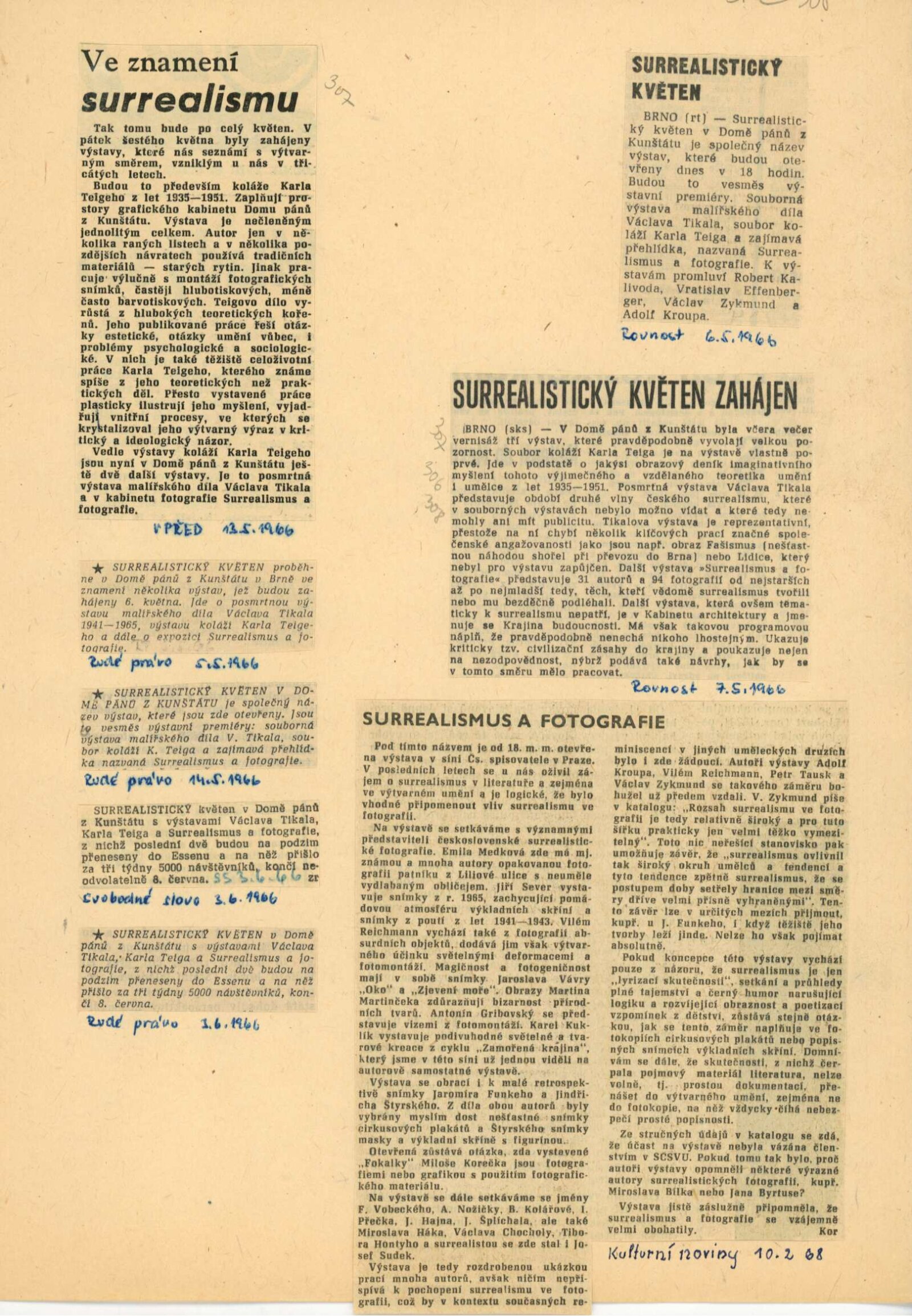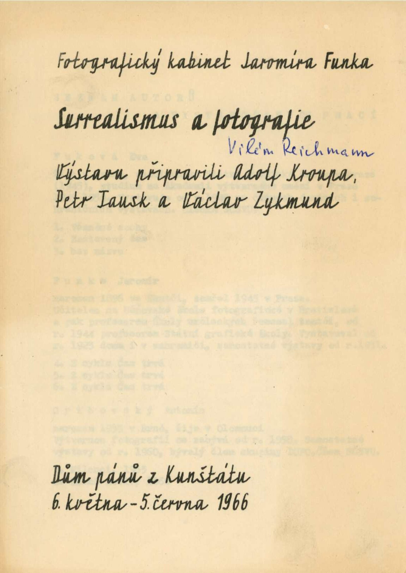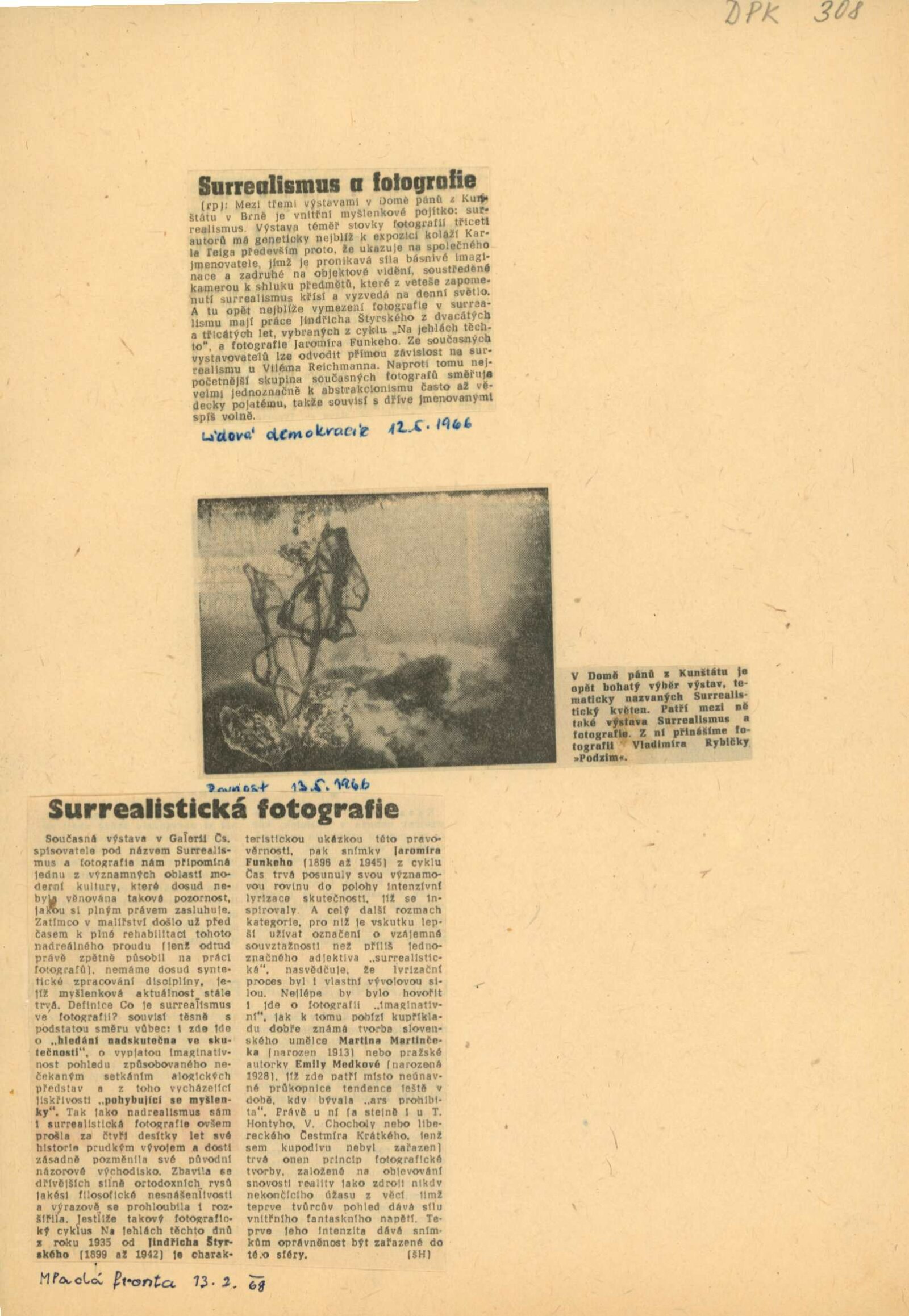 Surrealismus a fotografie: Dům umění města Brna / Dům pánů z Kunštátu, 74. výstava Kabinetu fotografie Jaromíra Funka, 6. 5. – 5. 6. 1966 / Text: Václav Zykmund. – Brno: DUmB, 1966. – 4 s., 9 s., DPK 308. – MZK; MG