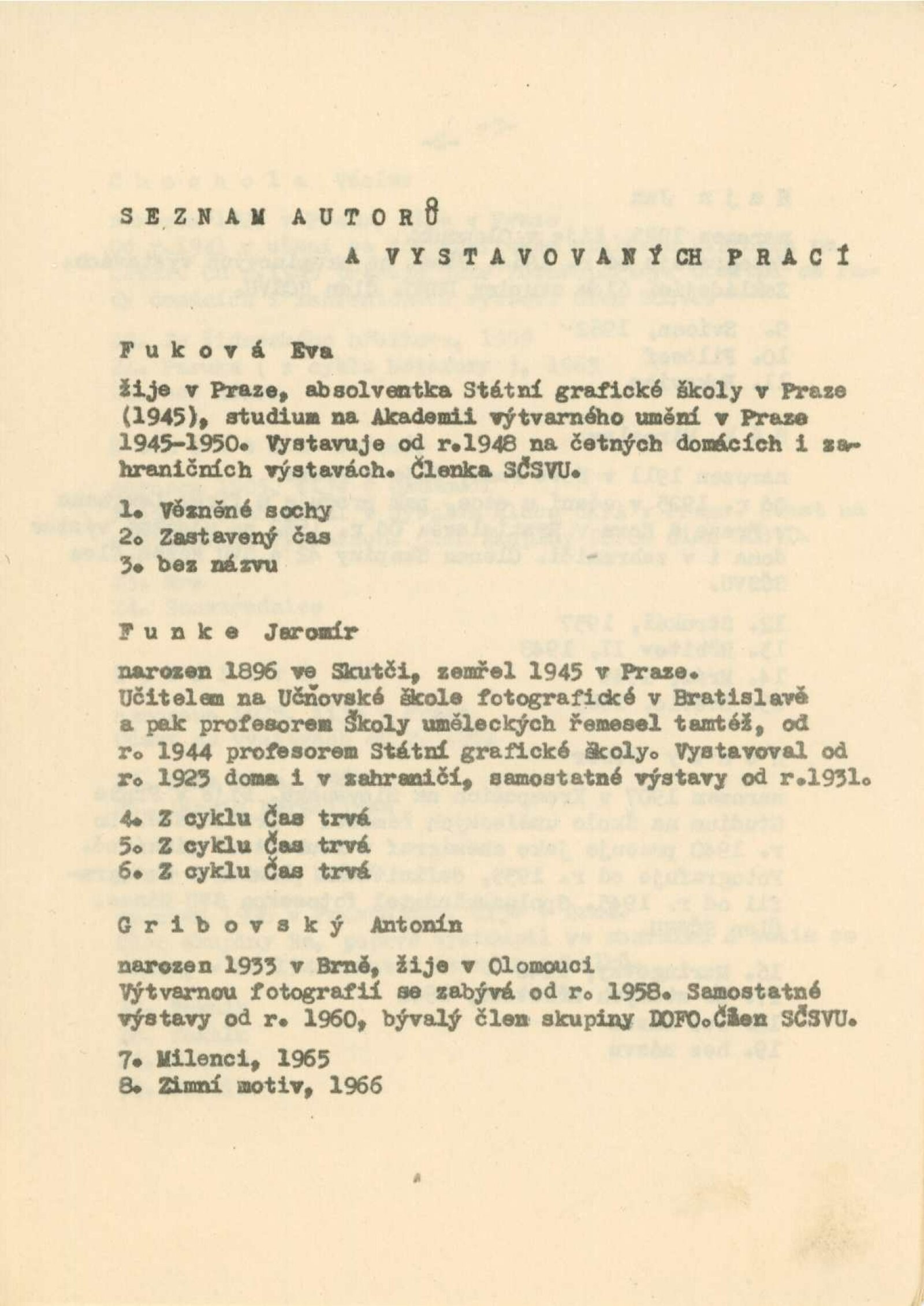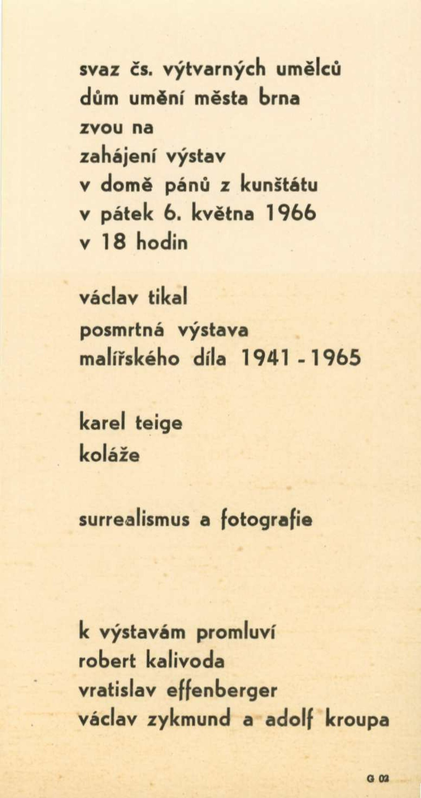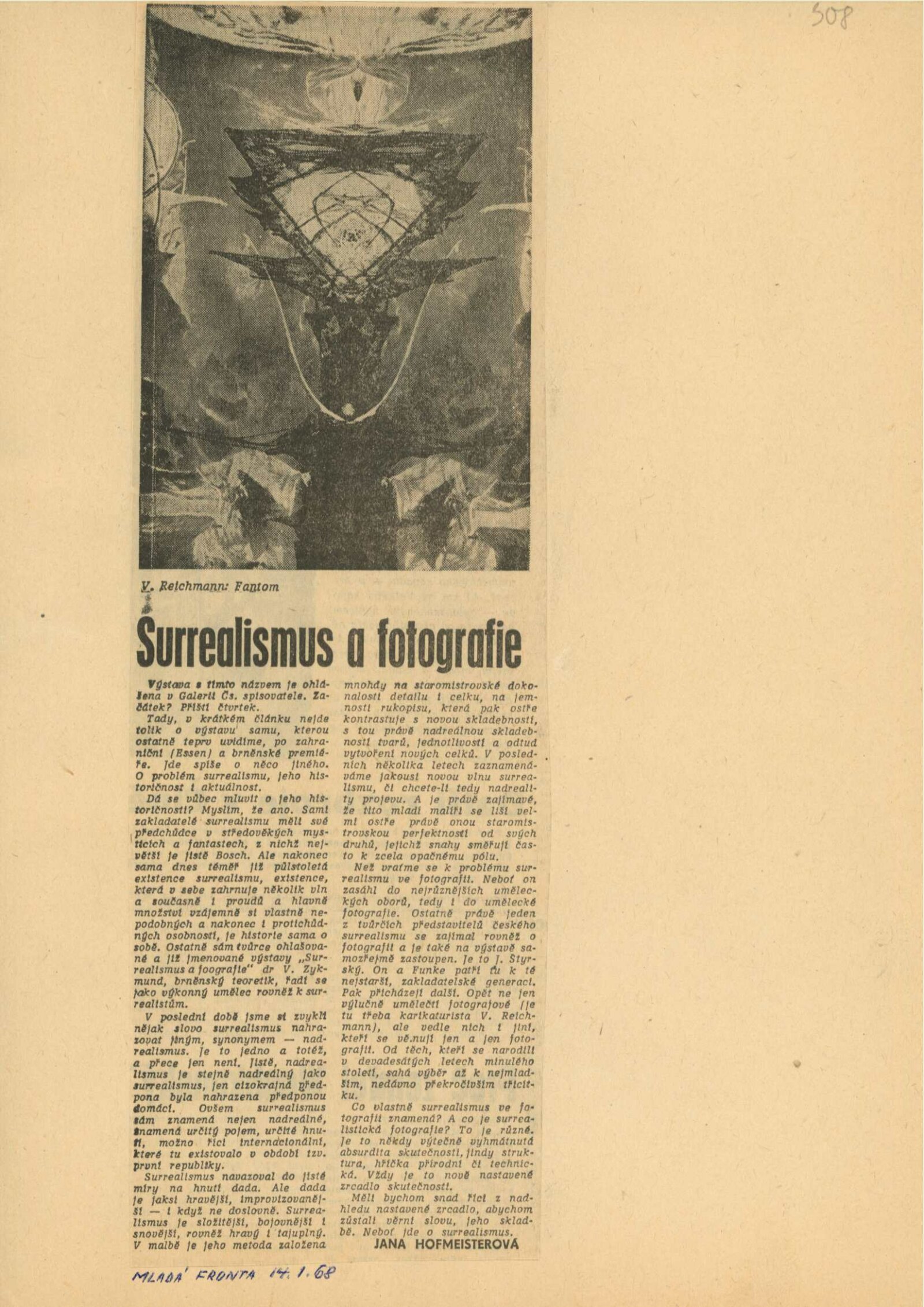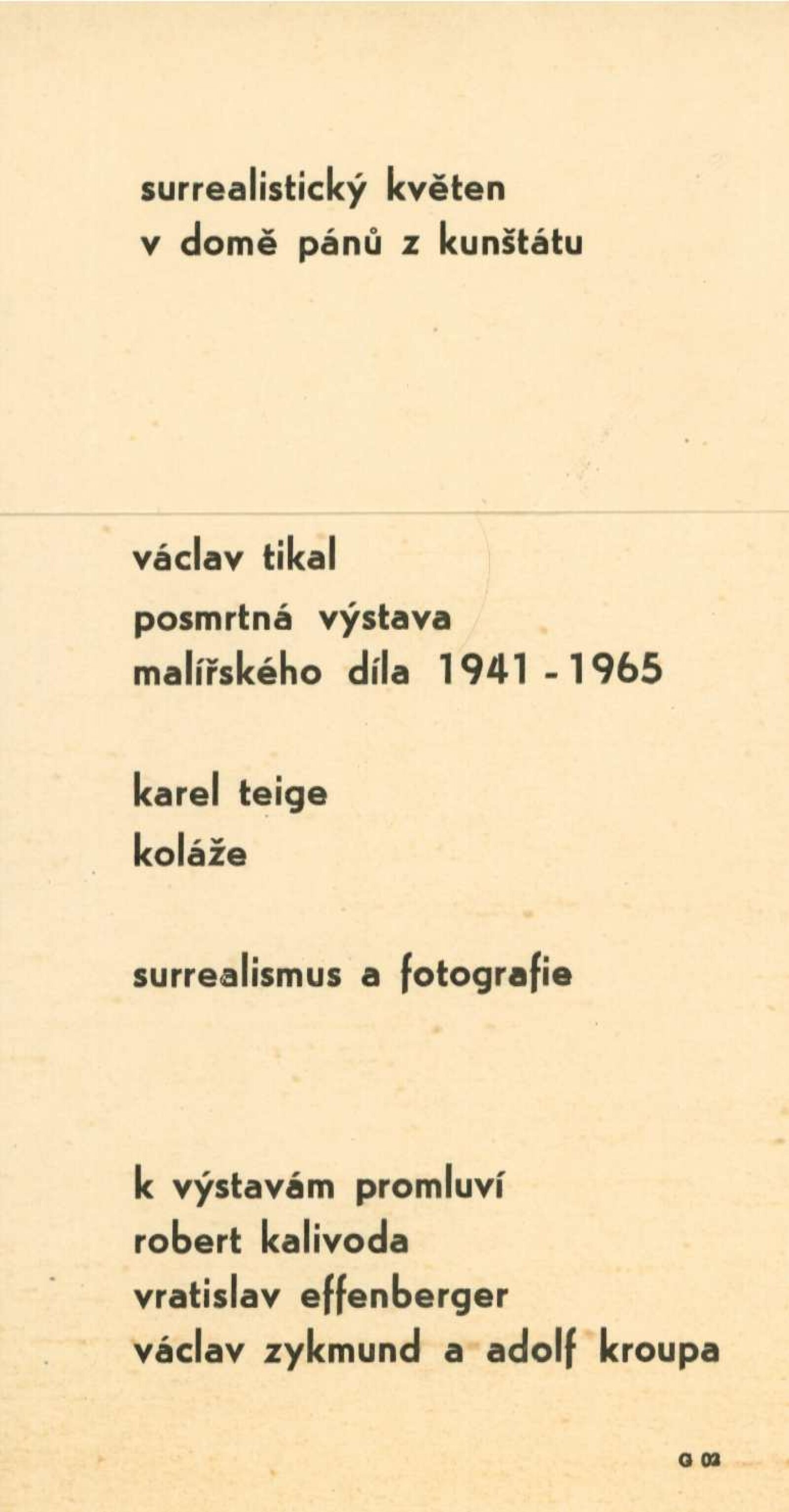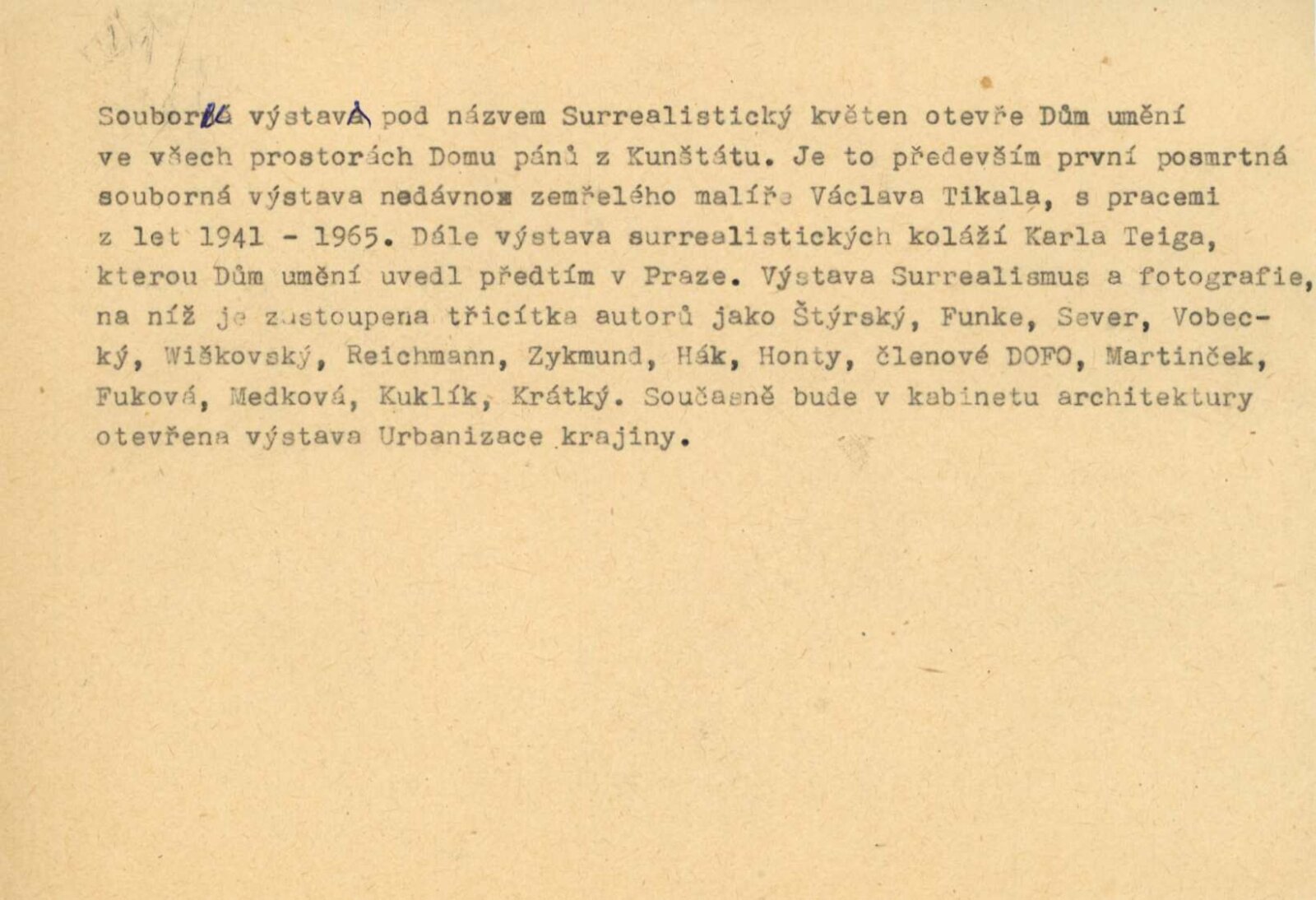 Surrealismus a fotografie: Dům umění města Brna / Dům pánů z Kunštátu, 74. výstava Kabinetu fotografie Jaromíra Funka, 6. 5. – 5. 6. 1966 / Text: Václav Zykmund. – Brno: DUmB, 1966. – 4 s., 9 s., DPK 308. – MZK; MG