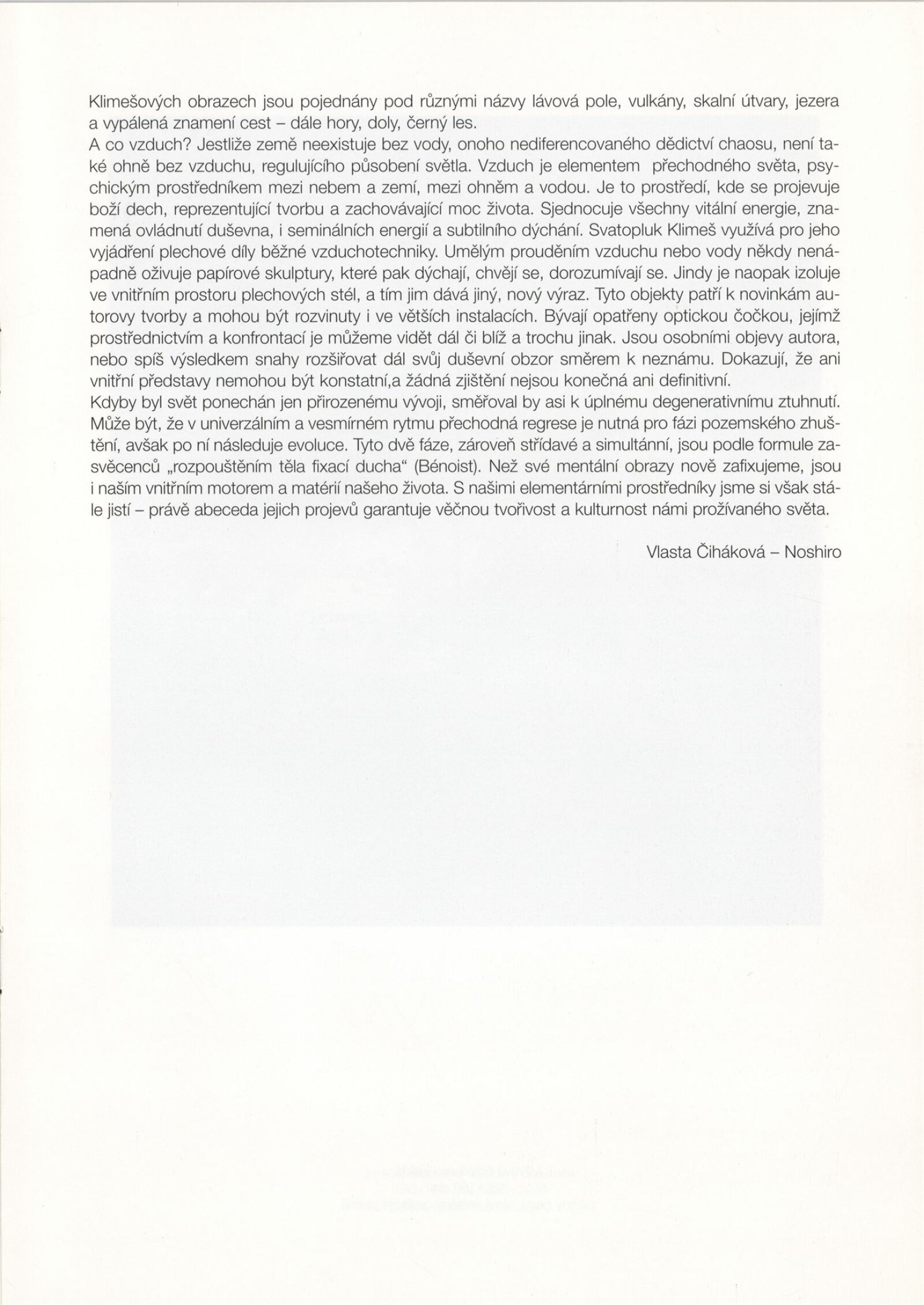 Svatopluk Klimeš. Ohěn, voda, vzduch, země: Dům umění města Brna, 204. výstava v Galerii Jaroslava Krále, 17. 12. 1996 – 19. 1. 1997 / Text: Vlasta Čiháková-Noshiro. – Brno: DUmB, 1996. – [14] s., obr., životní data, výstavy, zastoupení ve sbírkách, DU 1039. – MZK