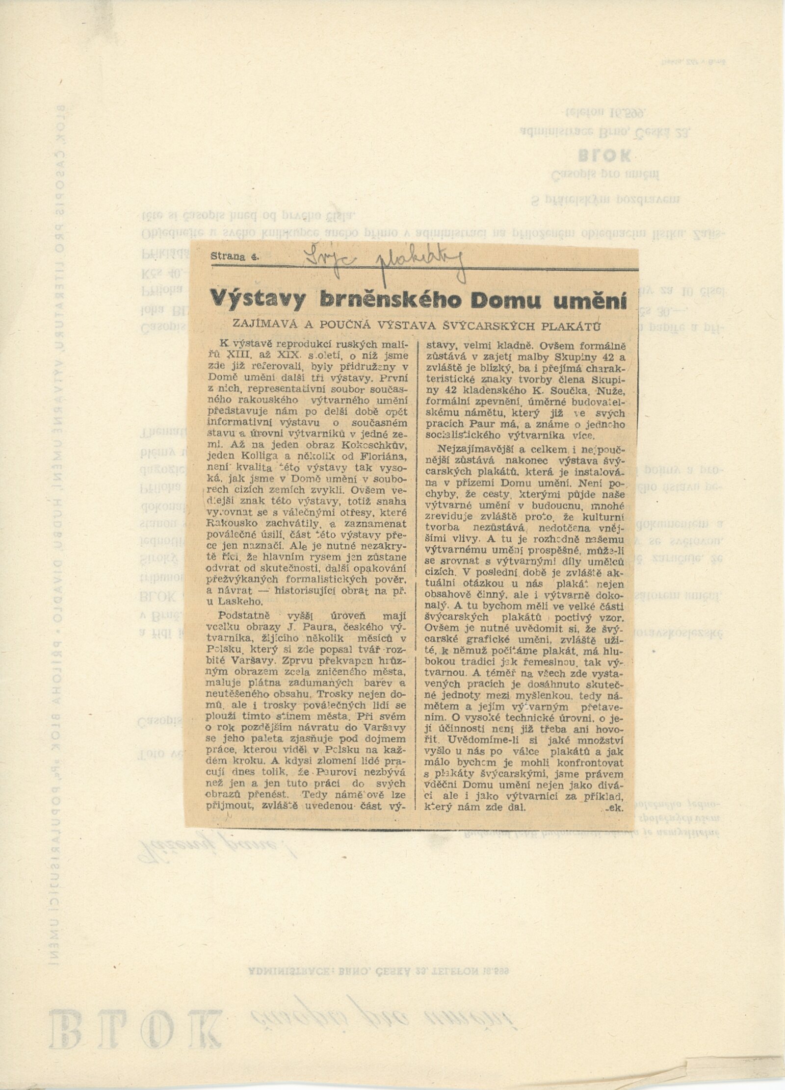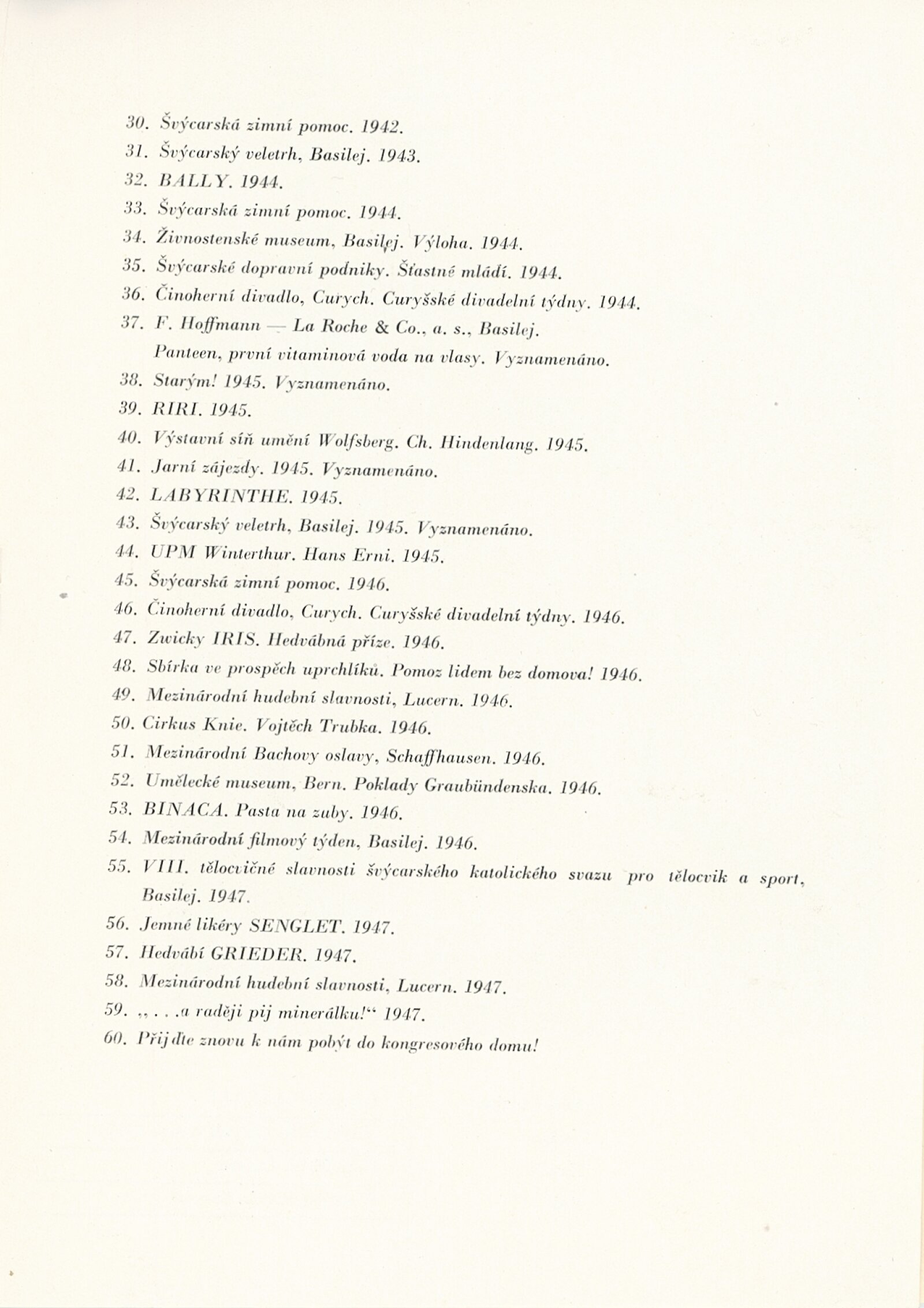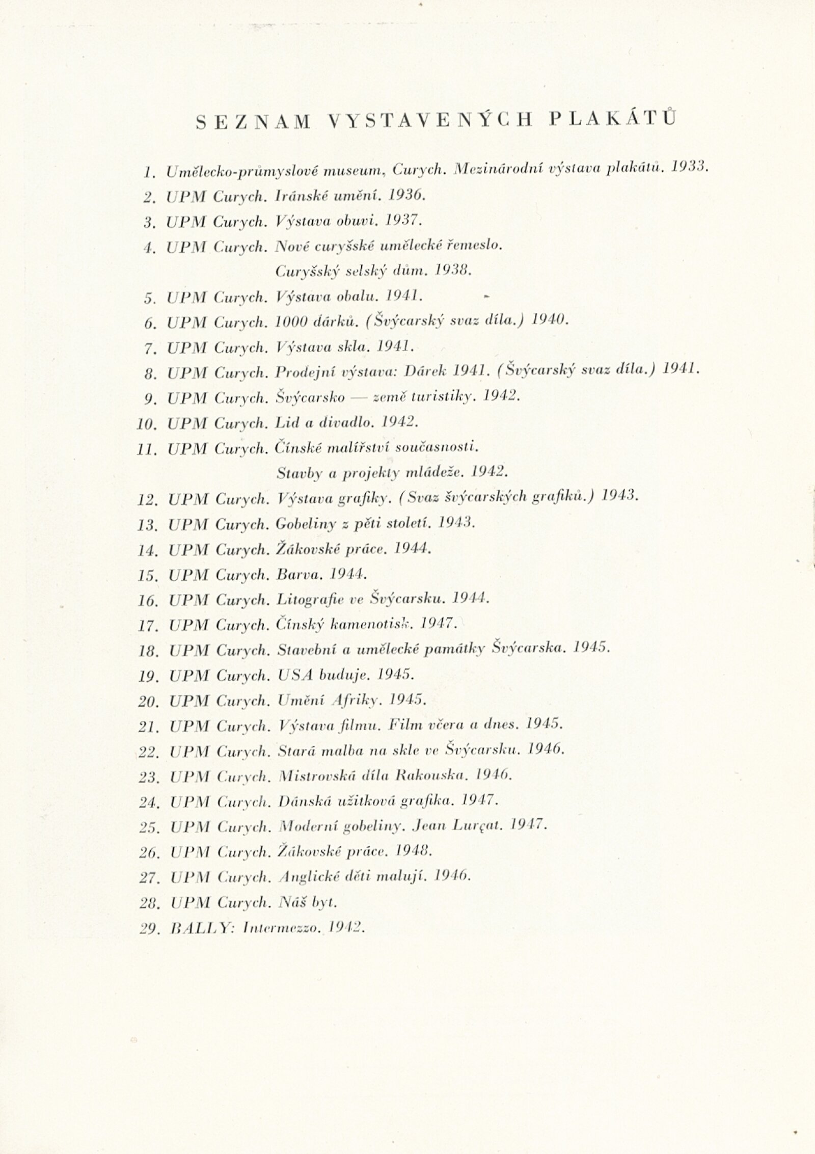 Katalog výstav Domu umění, pořádaných 3. 3. – 27. 3. 1949 / Obsahuje výstavy: Reprodukce ruského malířství 13.–19. století. 96. výstava, Jaroslav Paur: Varšava 1946. 97. výstava, Současné rakouské umění. 98. výstava, Švýcarský plakát. 99. výstava / Brno: Dům umění, 1948. – 11 s., DU 96–99. – Kubíček 7638; MZK; MG / Švýcarský plakát: Dům umění města Brna, 3. 3. – 27. 3. 1949 / Převzatý katalog. Švýcarský plakát: Praha, 1947 / Praha: Československo-švýcarská společnost, 1947. – 4 s., DU 99