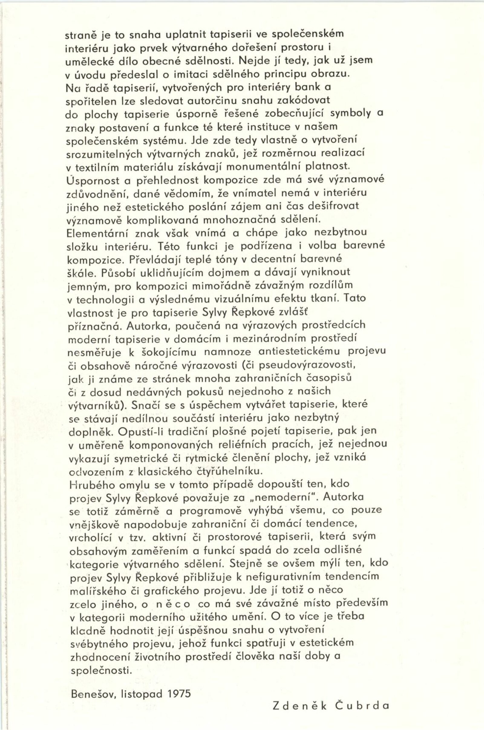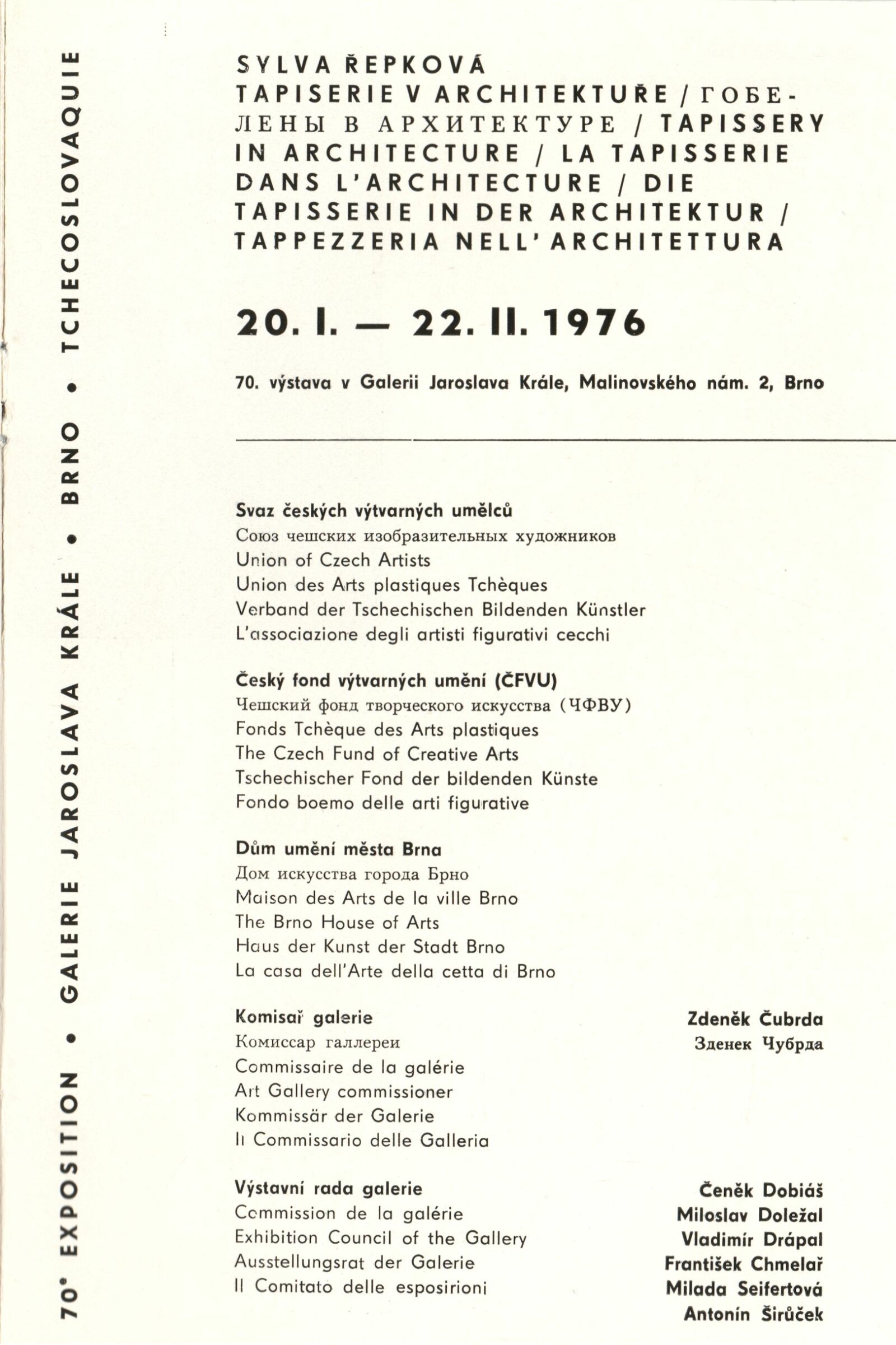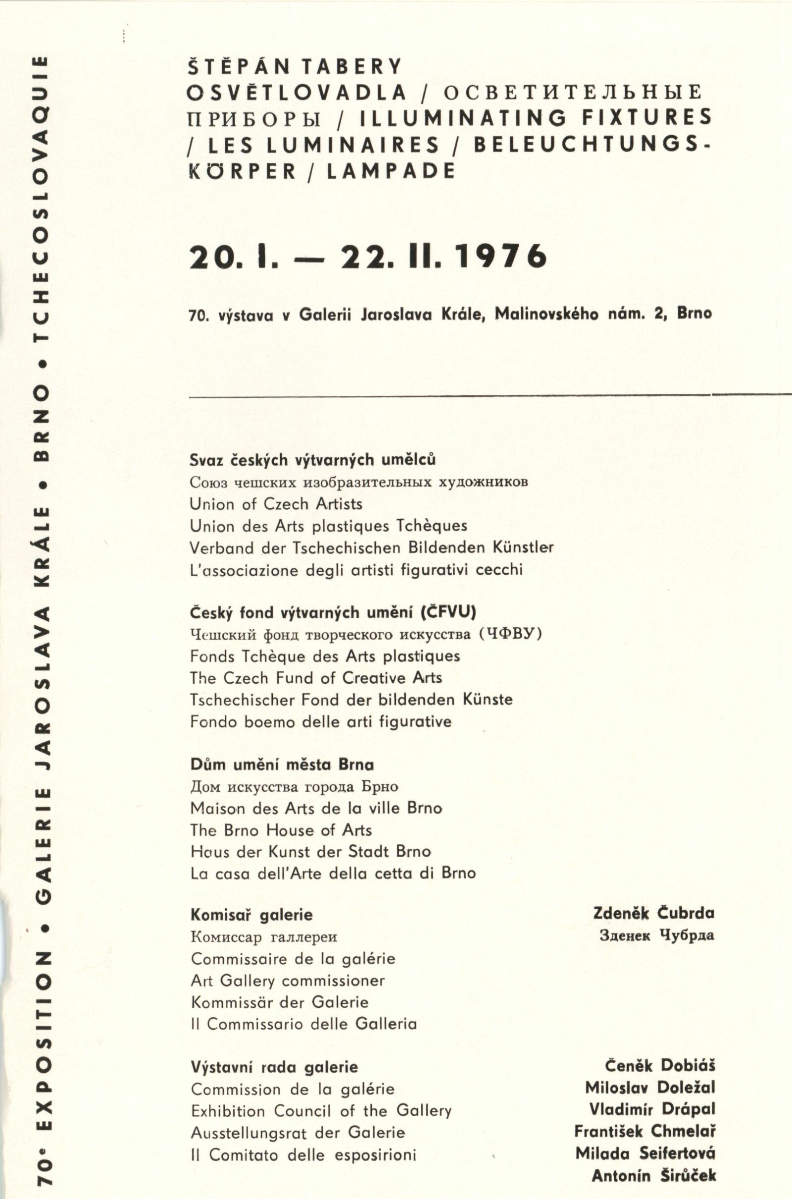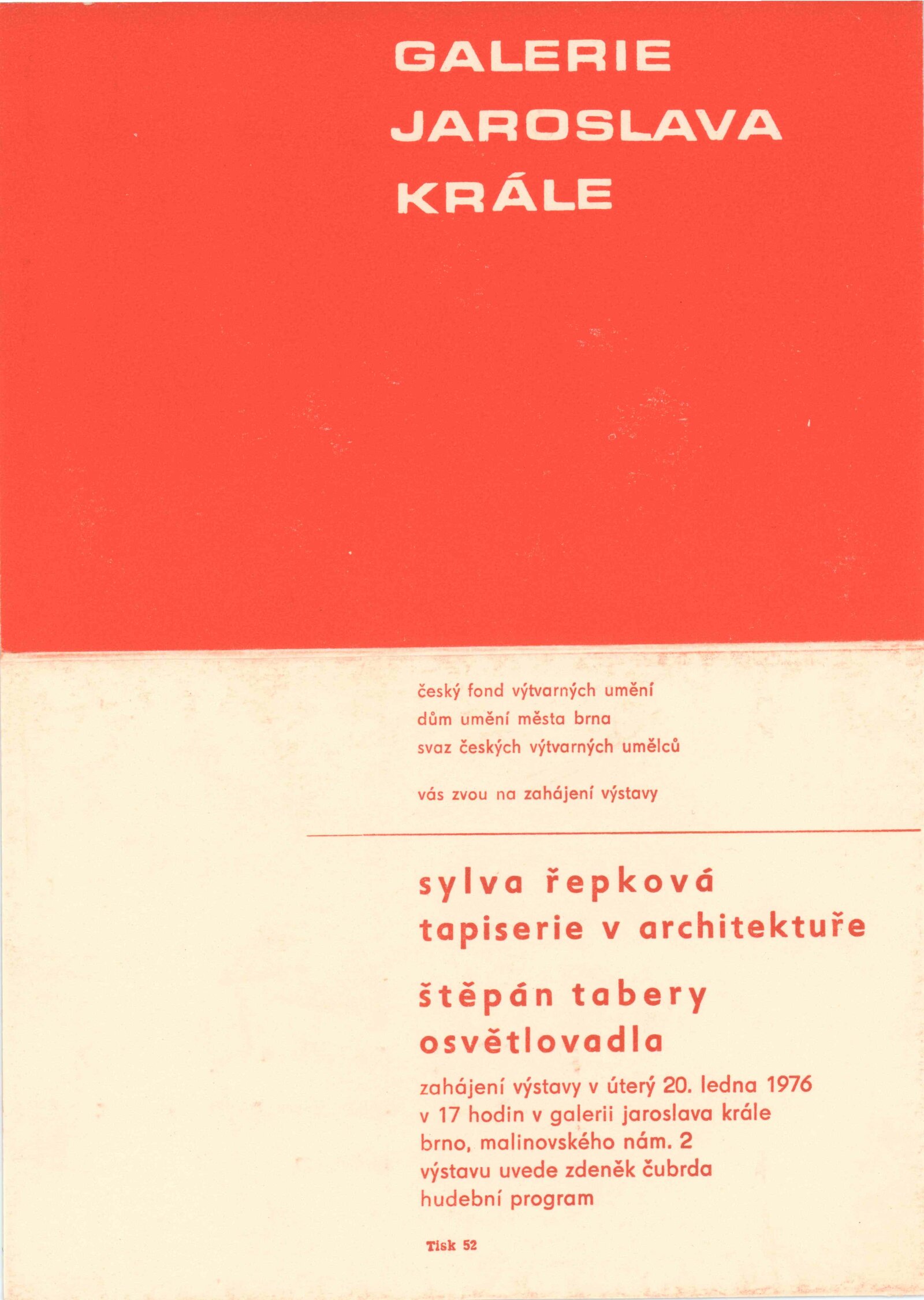 Sylva Řepková. Tapiserie v architektuře: Dům umění, 70. výstava v Galerii Jaroslava Krále, 20. 1. – 22. 2. 1976 / Text: Zdeněk Čubrda. – Brno: ČFVU, 1976. – 10 s., obr., seznam vystavených prací 1 s., portrét, životní data, seznam výstav, DU 633. – MZK; MG / Štěpán Tabery. Osvětlovadla: Dům umění. 70. výstava v Galerii Jaroslava Krále, 20. 1. – 22. 2. 1976 / Text: Zdeněk Čubrda. – Brno: ČFVU, 1976. – 10 s., obr., seznam vystavených prací 2 s., portrét, životopis, DU 633. – MZK; MG; MMB