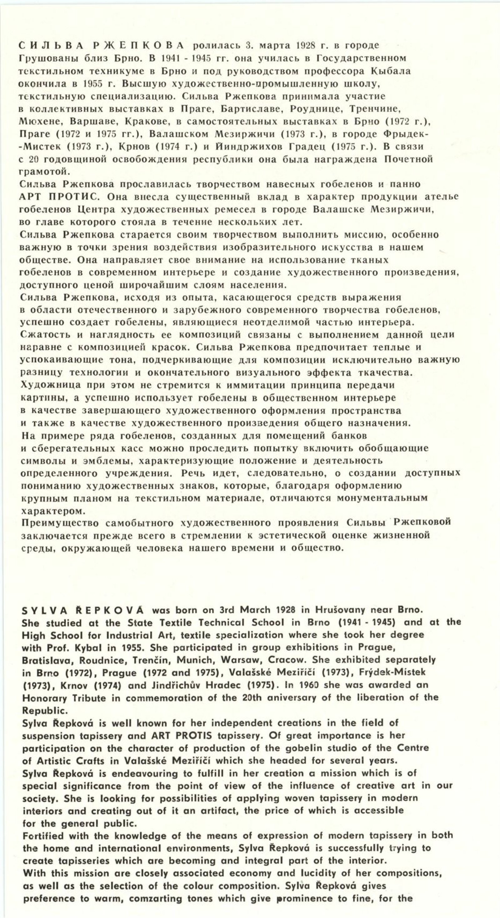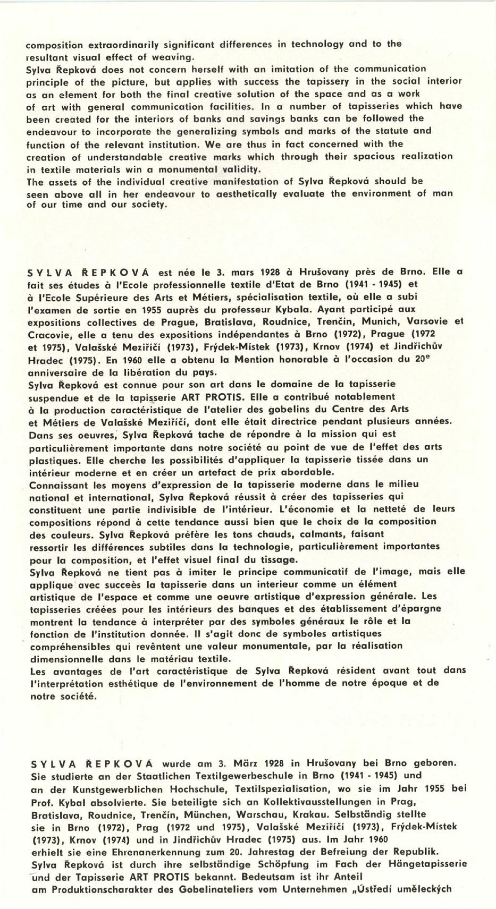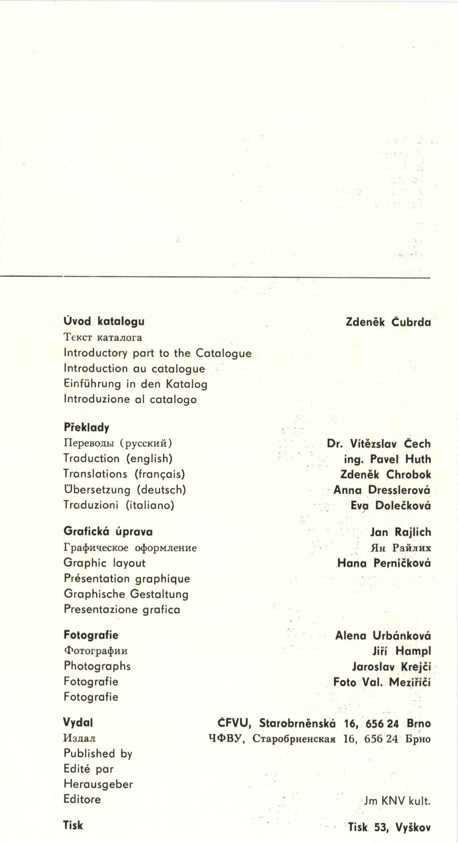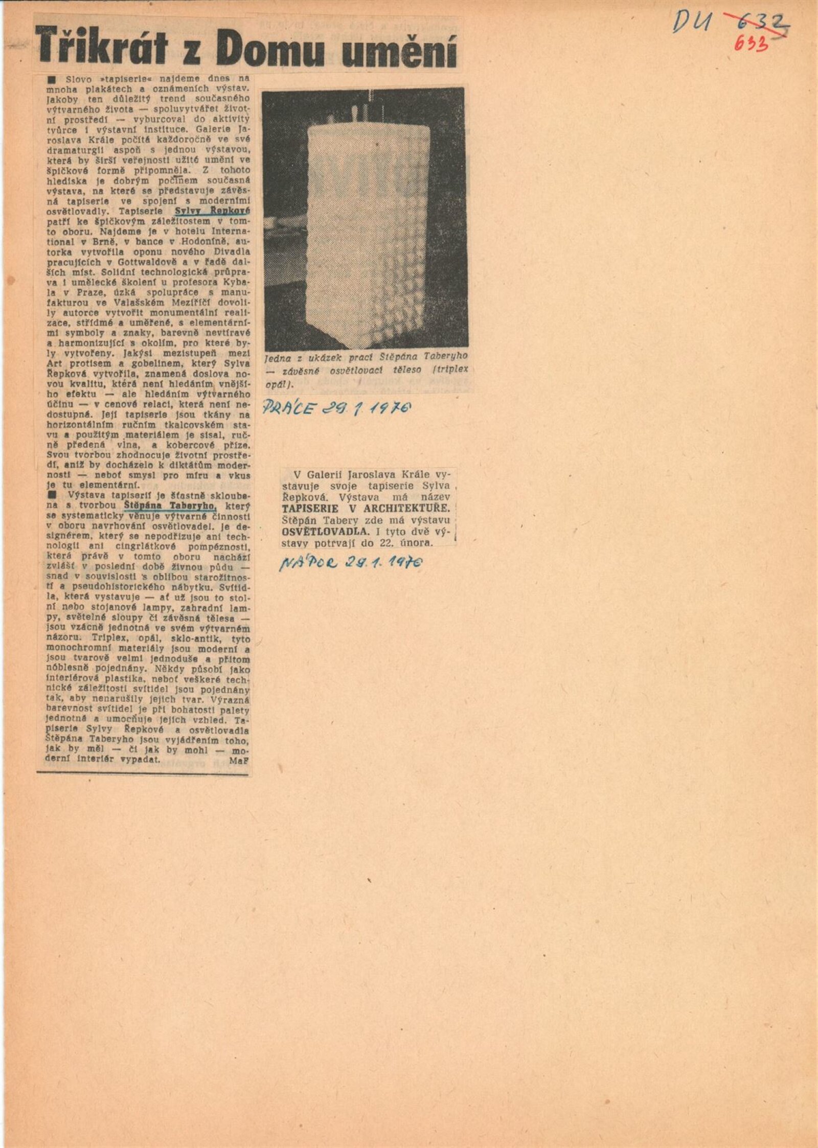 Sylva Řepková. Tapiserie v architektuře: Dům umění, 70. výstava v Galerii Jaroslava Krále, 20. 1. – 22. 2. 1976 / Text: Zdeněk Čubrda. – Brno: ČFVU, 1976. – 10 s., obr., seznam vystavených prací 1 s., portrét, životní data, seznam výstav, DU 633. – MZK; MG / Štěpán Tabery. Osvětlovadla: Dům umění. 70. výstava v Galerii Jaroslava Krále, 20. 1. – 22. 2. 1976 / Text: Zdeněk Čubrda. – Brno: ČFVU, 1976. – 10 s., obr., seznam vystavených prací 2 s., portrét, životopis, DU 633. – MZK; MG; MMB