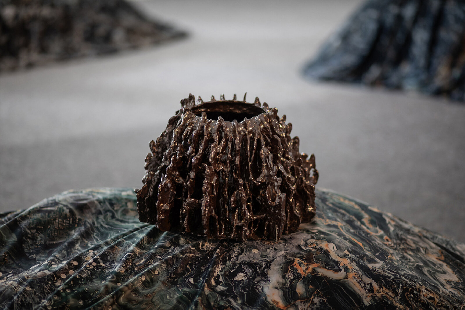 Symbionts 2.0 is a new version of a project by artist and ceramicist Csilla Nagy and musician, musicologist and sound artist Slavo Krekovic originally created in 2021. The concept of Symbionts began as a speculative reflection on the future of life on the planet. Formally, the objects are inspired by the study of marine fungi of the Porifera species representing an ancient blind evolutionary branch. The project aims to explore the interrelationships between humans, the environment, nature and technology through the creation of hybrid environments in which the boundaries between nature and technology, human and non-human (or post-human) actors are blurred. For their exhibition at the House of Arts, Slavo and Csilla created a site-specific environment. It consists of sonic interactive ceramic objects which are data-connected and thus capable of communication based on the reception of conditions in the surrounding environment. Symbionts algorithmically transform sounds from a shared and freely available web database. The ceramic objects have varying metallic glazes that reflect the surrounding environment mirroring their interaction component.