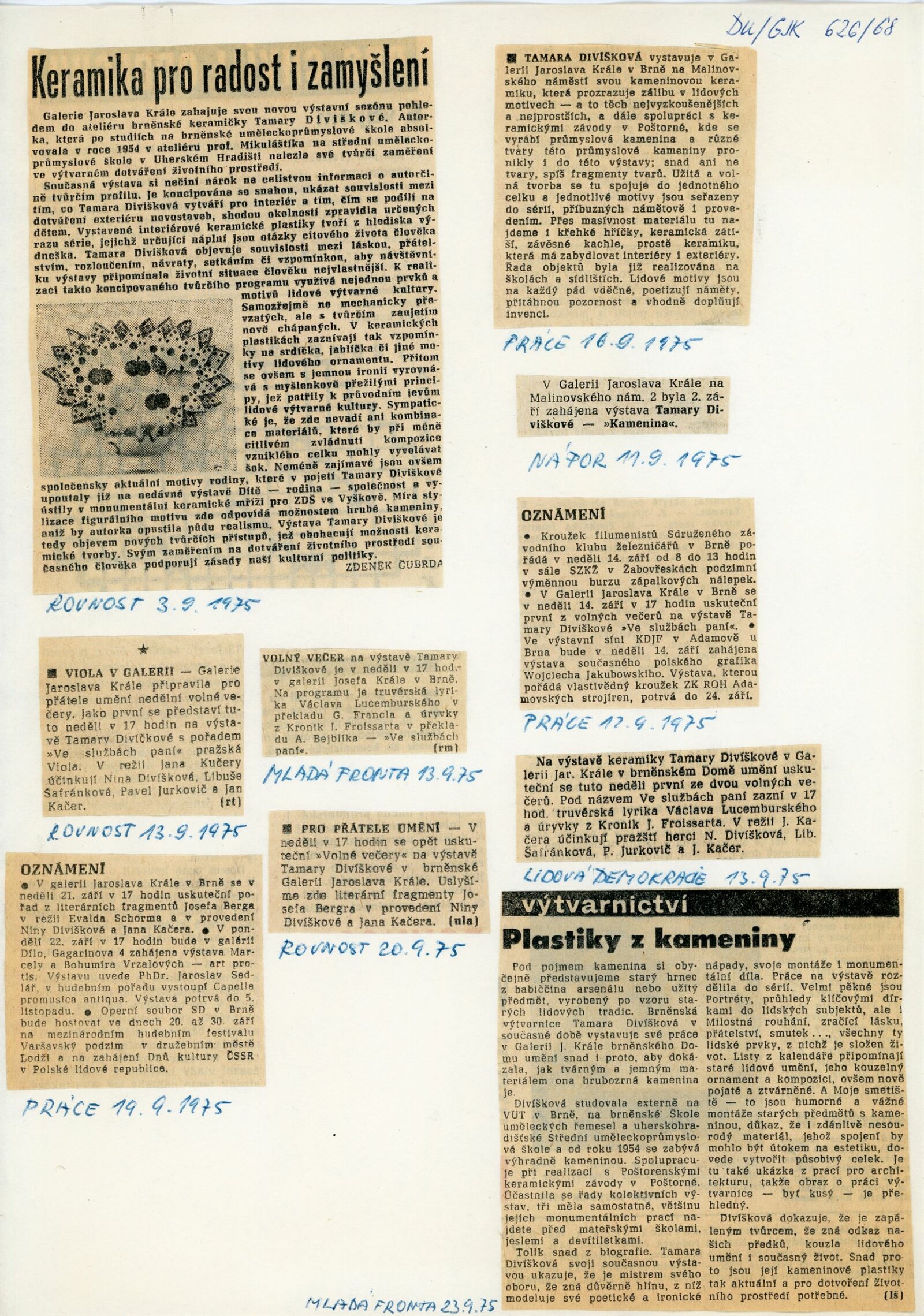 Tamara Divíšková. Kamenina: Dům umění, Galerie Jaroslava Krále, 2. 9. – 28. 9. 1975 / Text: Evald Sckorm. – Brno: ČFVU, 1975. – 12 s., obr., seznam vystavených prací 2 s., portrét, životopis, DU 626. – Kubíček 7742; MZK; MG; MMB