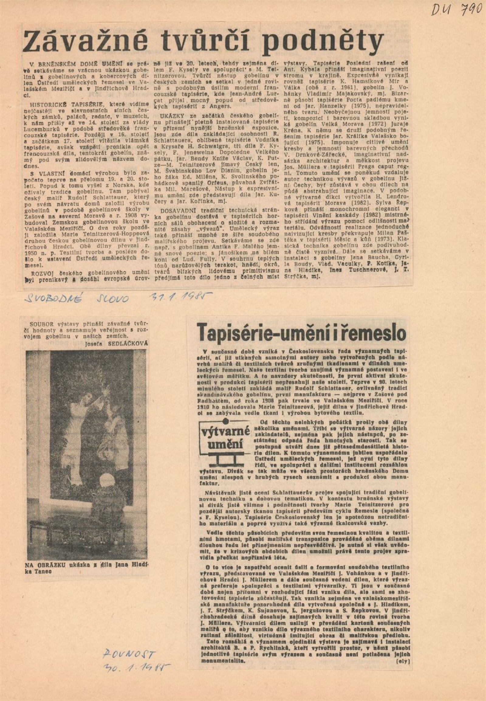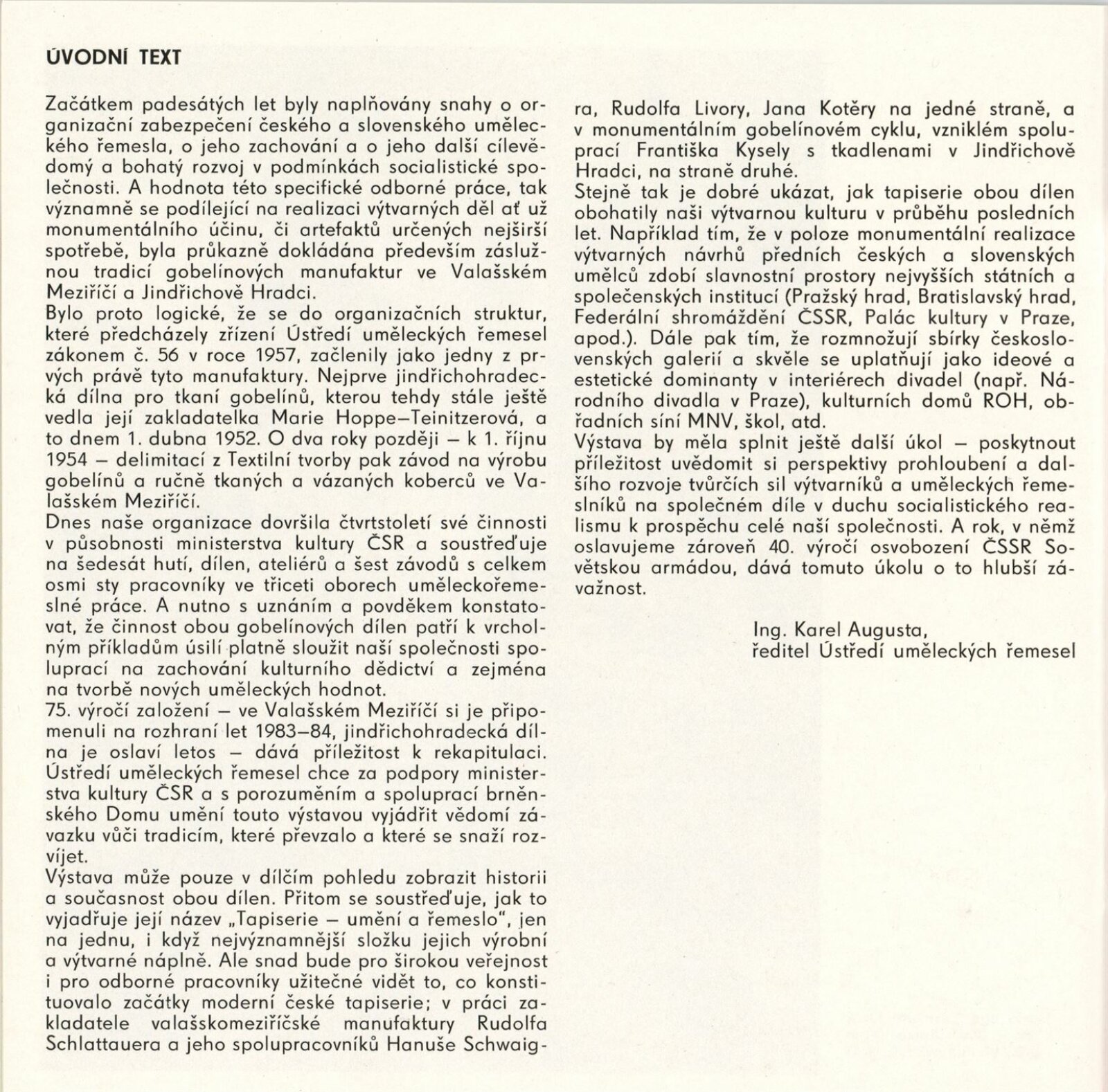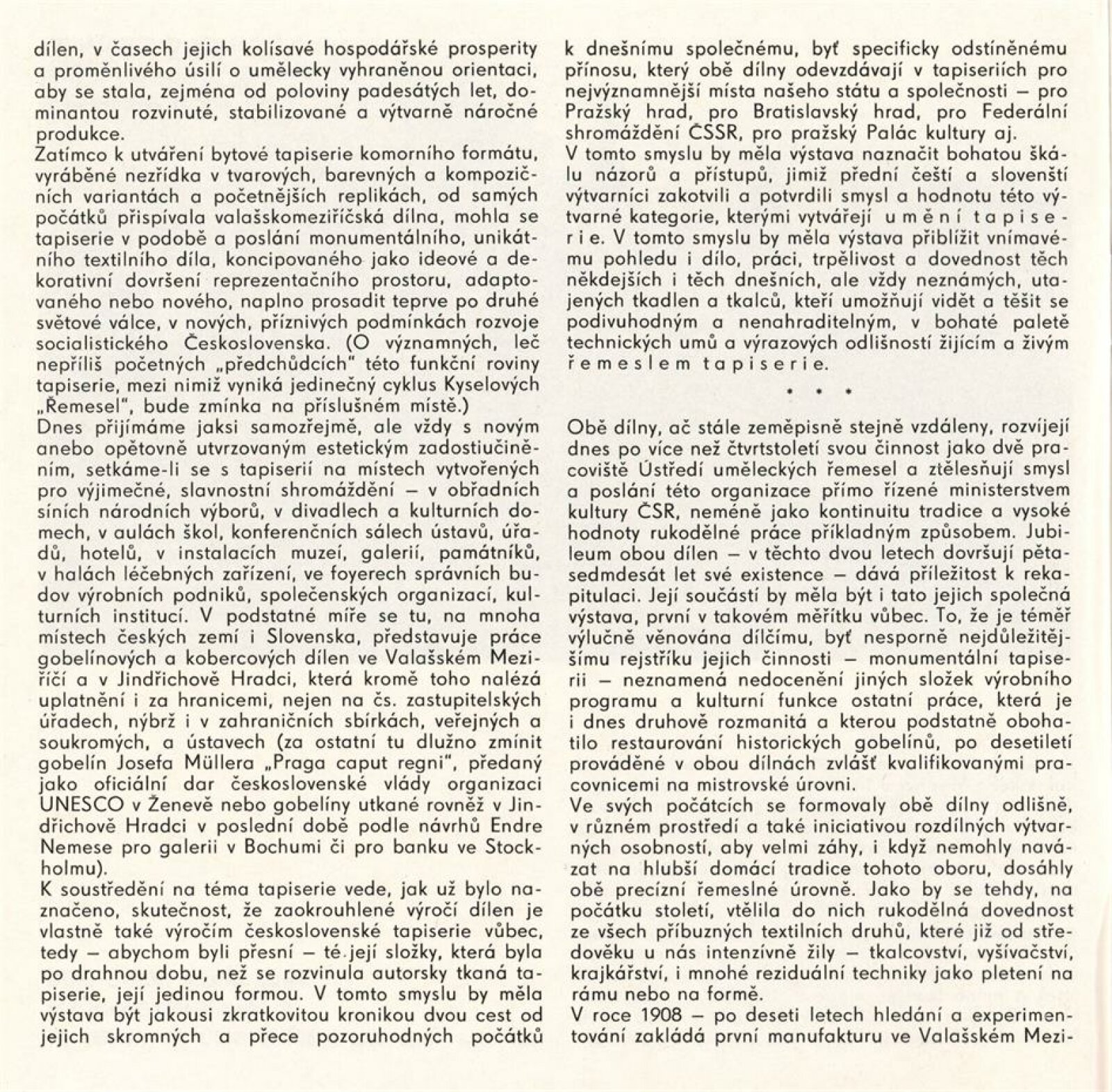 Tapiserie, umění a řemeslo. Výstava k 75. výročí založení gobelínových a kobercových dílen Ústřední uměleckých řemesel ve Valašském Meziříčí a v Jindřichově Hradci: Dům umění města Brna, 1. patro, 11. 1. – 10. 2. 1985 / Text: Ludmila Kybalová. – Brno: DUmB, 1985. – 32 s., obr., seznam vystavených tapiserií 2 s., historiografie dílen, DU 790. – MZK; MG
