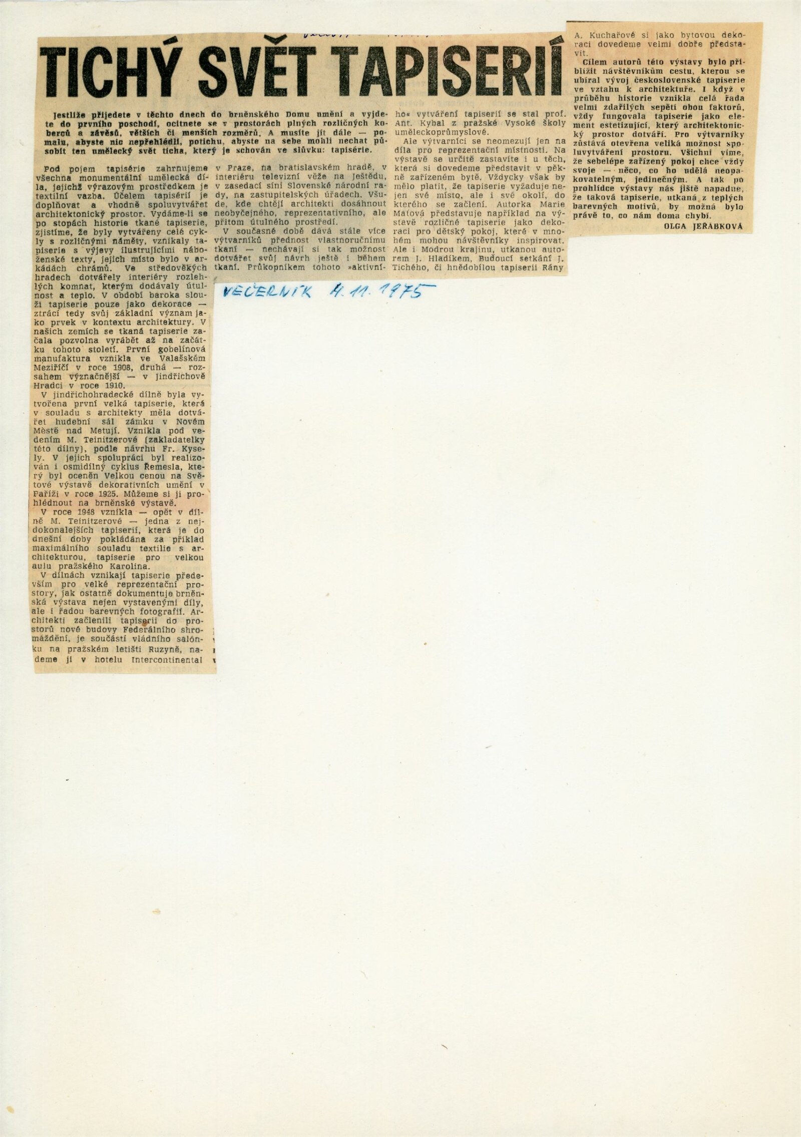 Tapiserie v architektuře: Dům umění města Brna, 10. 10. – 16. 11. 1975 / Text: Věra Klimešová. – Brno: DUmB, 1975. – 4 s., DU 628. – MZK; MG; MMB