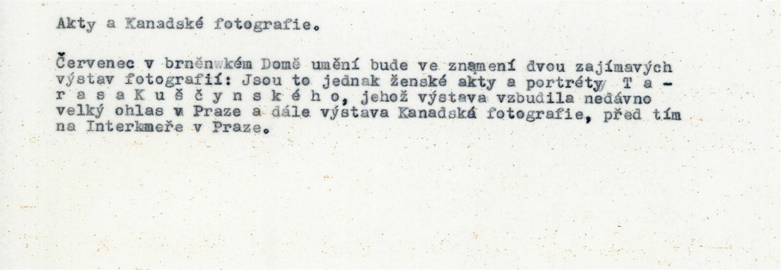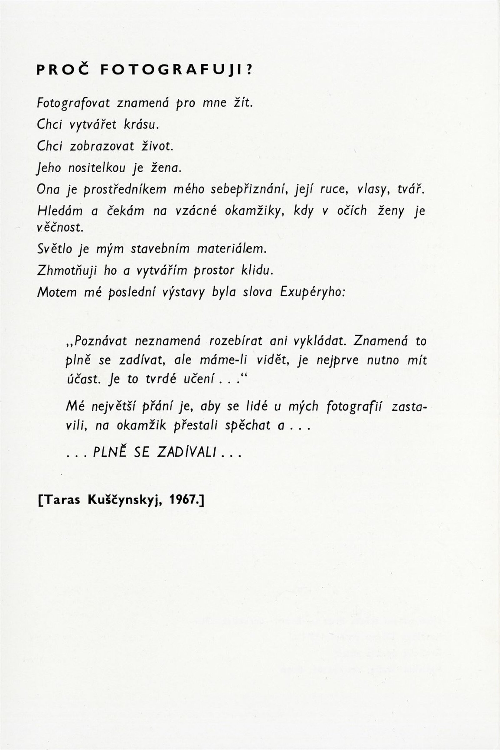 Taras Kuščynskyj. Fotografie: Dům umění města Brna, hala 3. 7. – 27. 7. 1969 / Brno: DUmB, 1969. – 4 s., 5 s. obr. příl., životní data, výstavy, publikace, neobsahuje seznam exponátů, DU 530. – MZK; MG; MMB