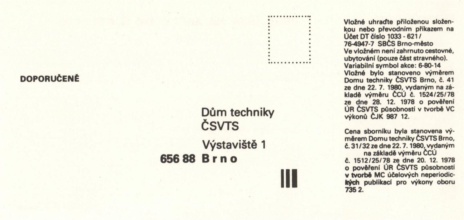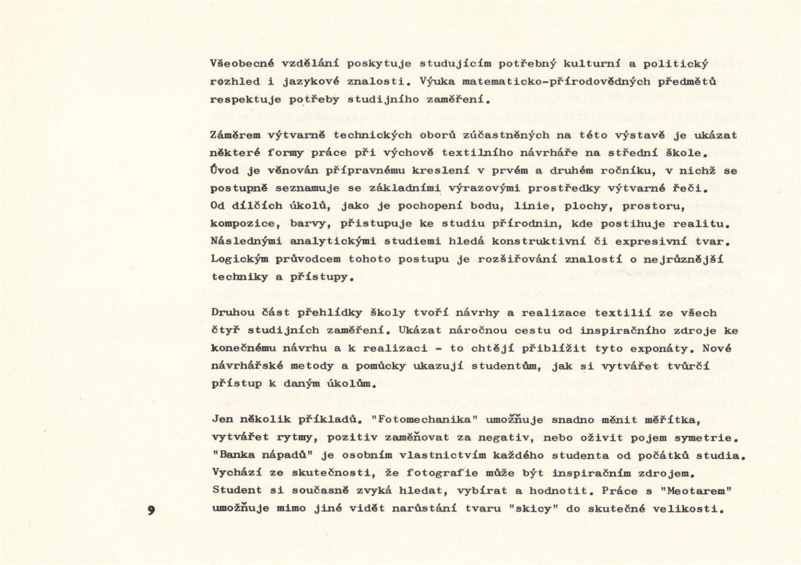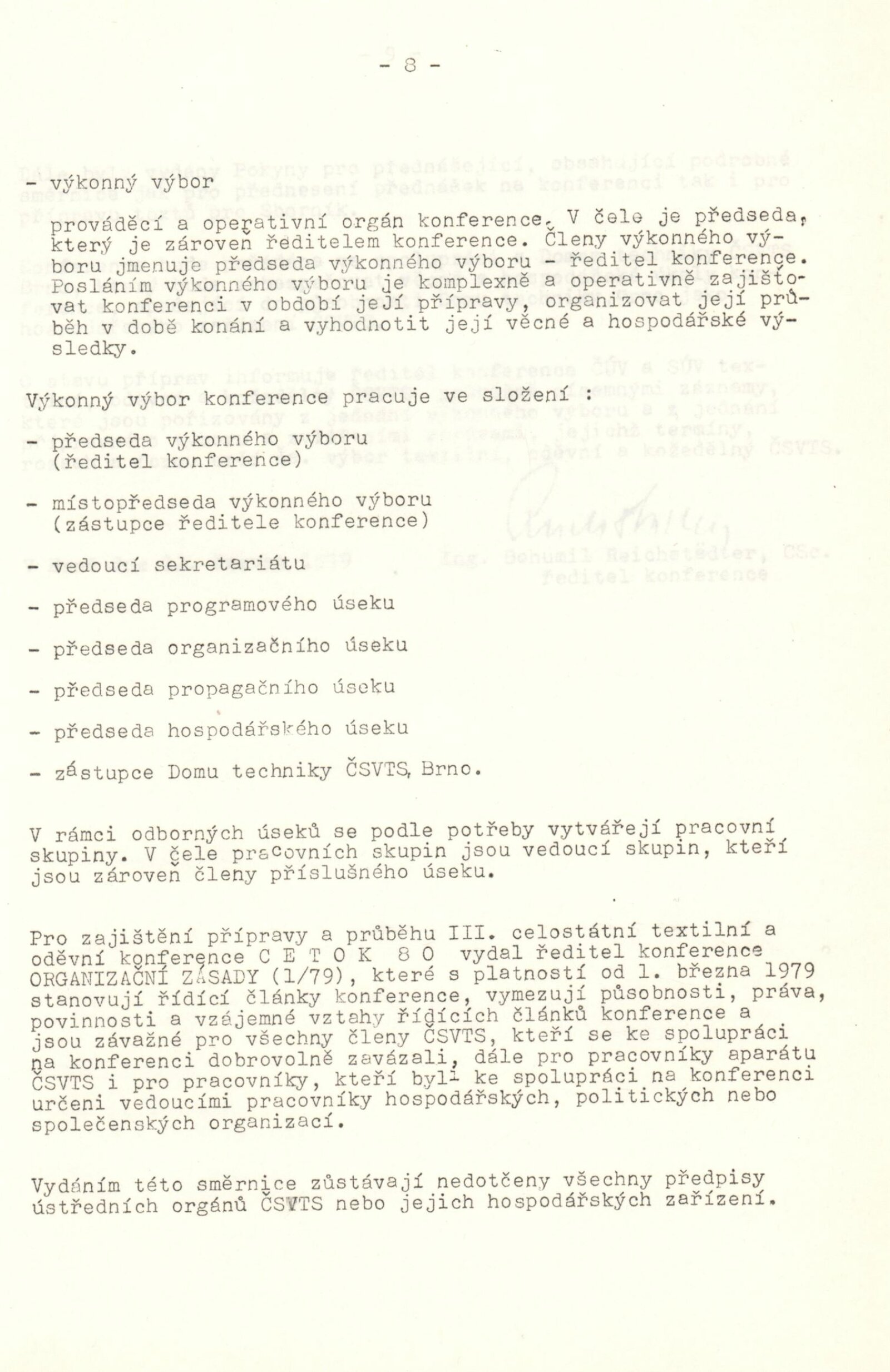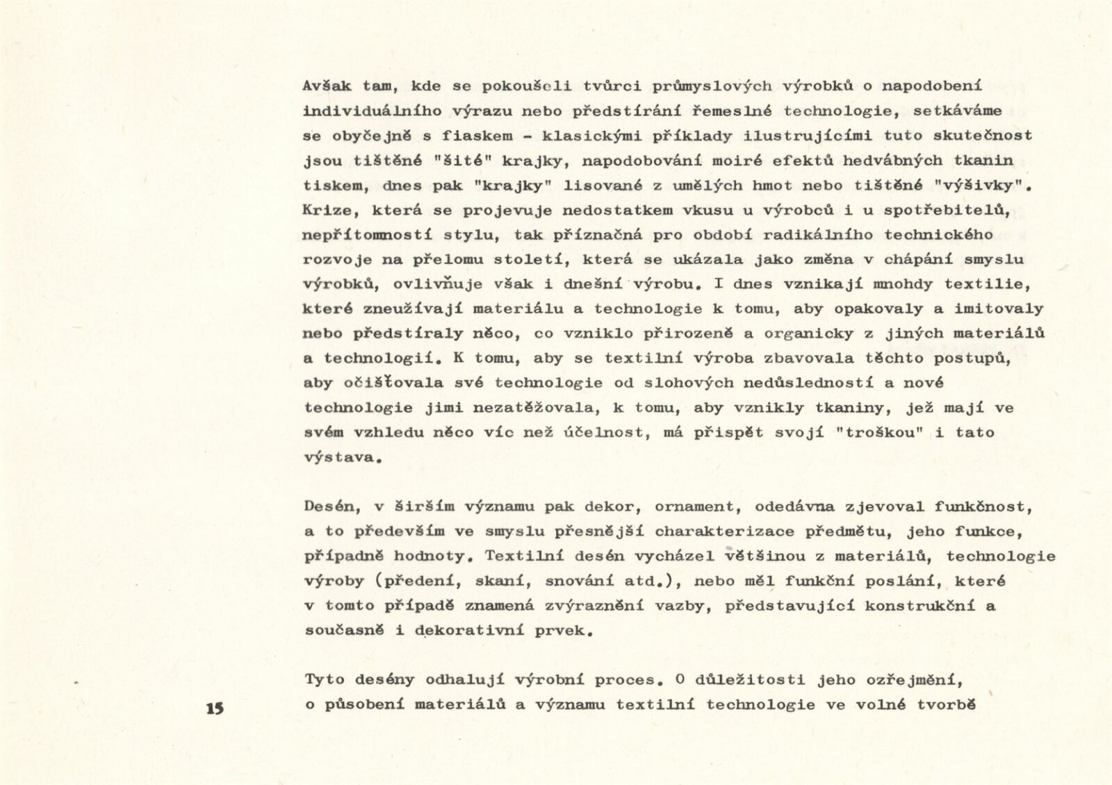 pozvánka, katalog (průvodce) výstavou, program III. celostátní textilní a oděvní konference, fotografie instalace, libreto výstavy a konference, záznamy z pracovních schůzí, seznam zapůjčených výrobků od Střední průmyslové školy textilní v Brně, zápisy ze schůzí, provozní korespondence (Vládní komise pro výstavnictví ČSR, Výzkumný ústav vlnařský, Cetok 80 (7. 9. 1979), Čes. vědecko-tech. spol. - objednávka a smlouva o pořádání výstavy), žádost o povolení výstavy, recenze v tisku